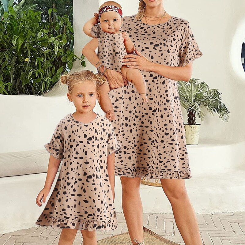 Wie ein Prinzessinnenkleid für Mutter und Baby. Der Stil des ausgestellten Kleides sorgt für den Komfort, den Mutter und Kind unbedingt bei einer der Varianten der Partnerlooks für Mutter und Baby haben sollten.