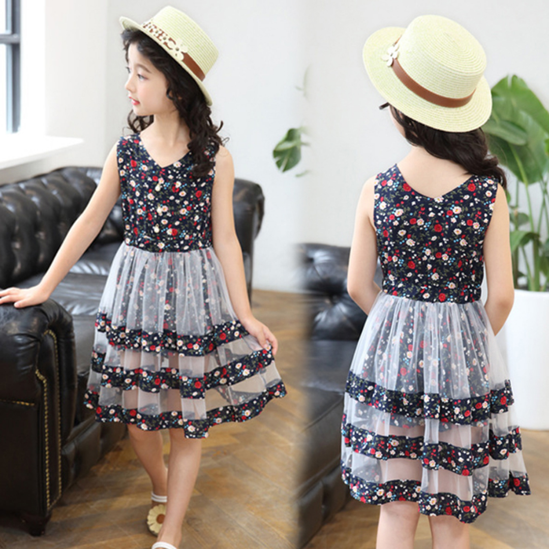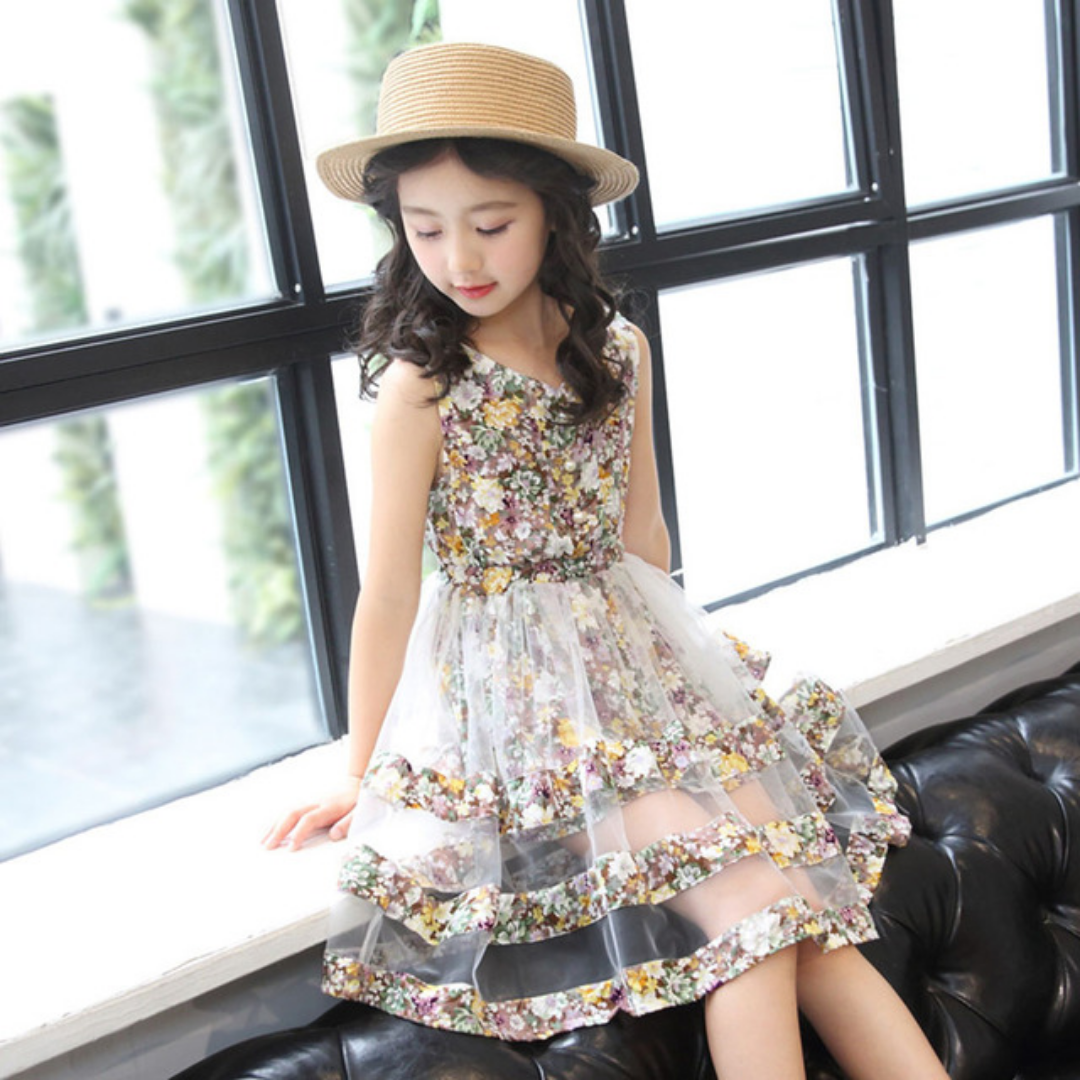 Vestido de Verano para Niña con Diseño de Malla Multicapa y Estampado Floral