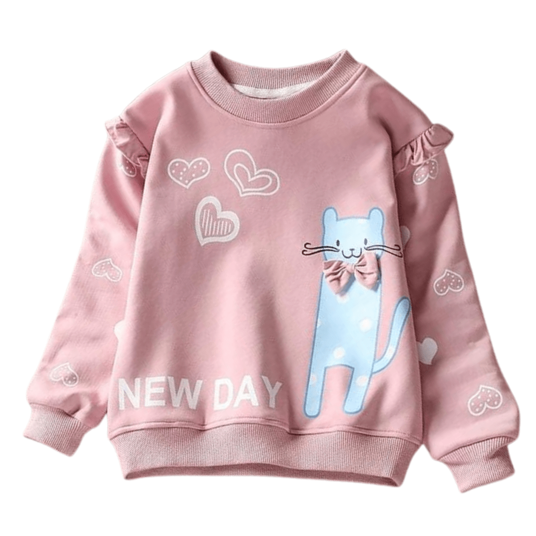 Dieser New Day Cat Toon Design Pullover ist ein sehr süßer und modischer Pullover für Mädchen. Er besteht aus Baumwolle, die angenehm zu tragen ist. Der Pullover hat einen Rundhalsausschnitt, lange Ärmel und überall Herzchenmuster. Das Katzenmotiv macht ihn besonders niedlich. Es ist ein Pullover, der Ihr kleines Mädchen in der kalten Jahreszeit warm hält.