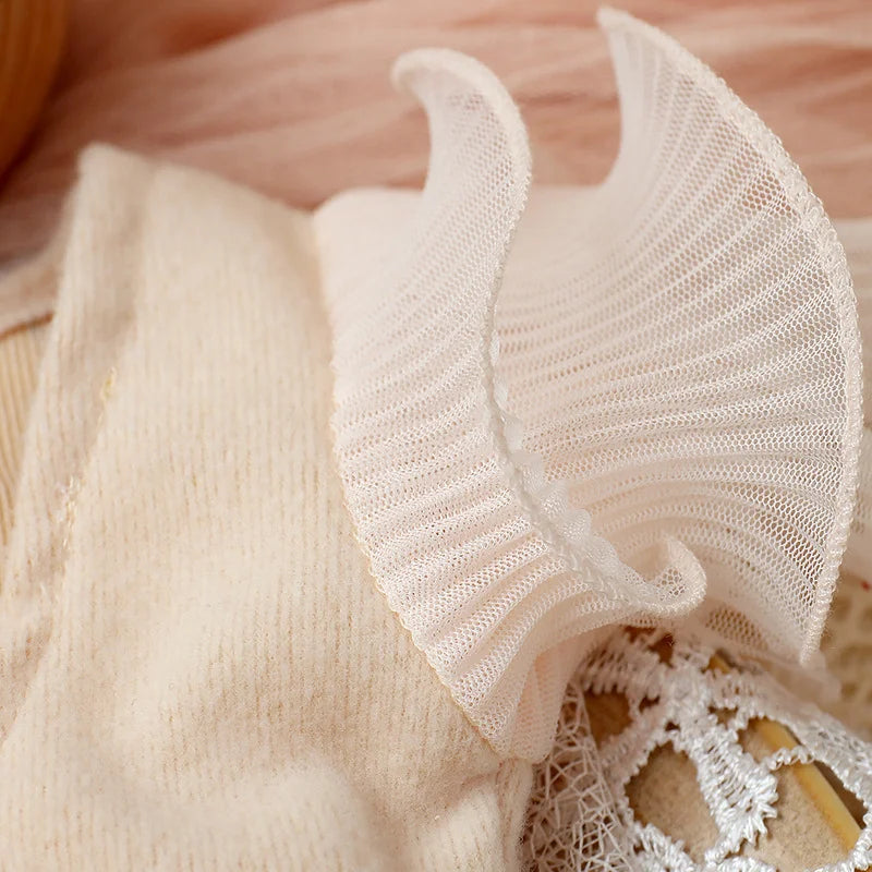 Zeitlose Eleganz: Dieser Strampler mit zarten Spitzendetails versprüht zeitlosen Charme und verleiht dem Fotoshooting Ihres Neugeborenen einen Hauch von Eleganz.