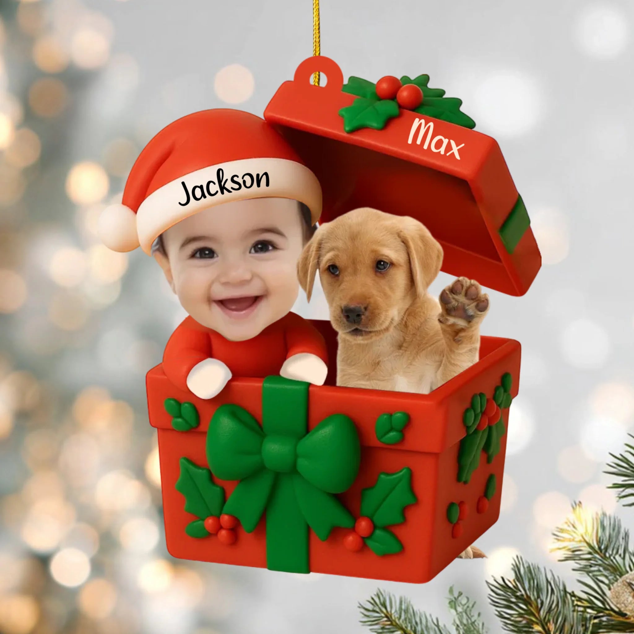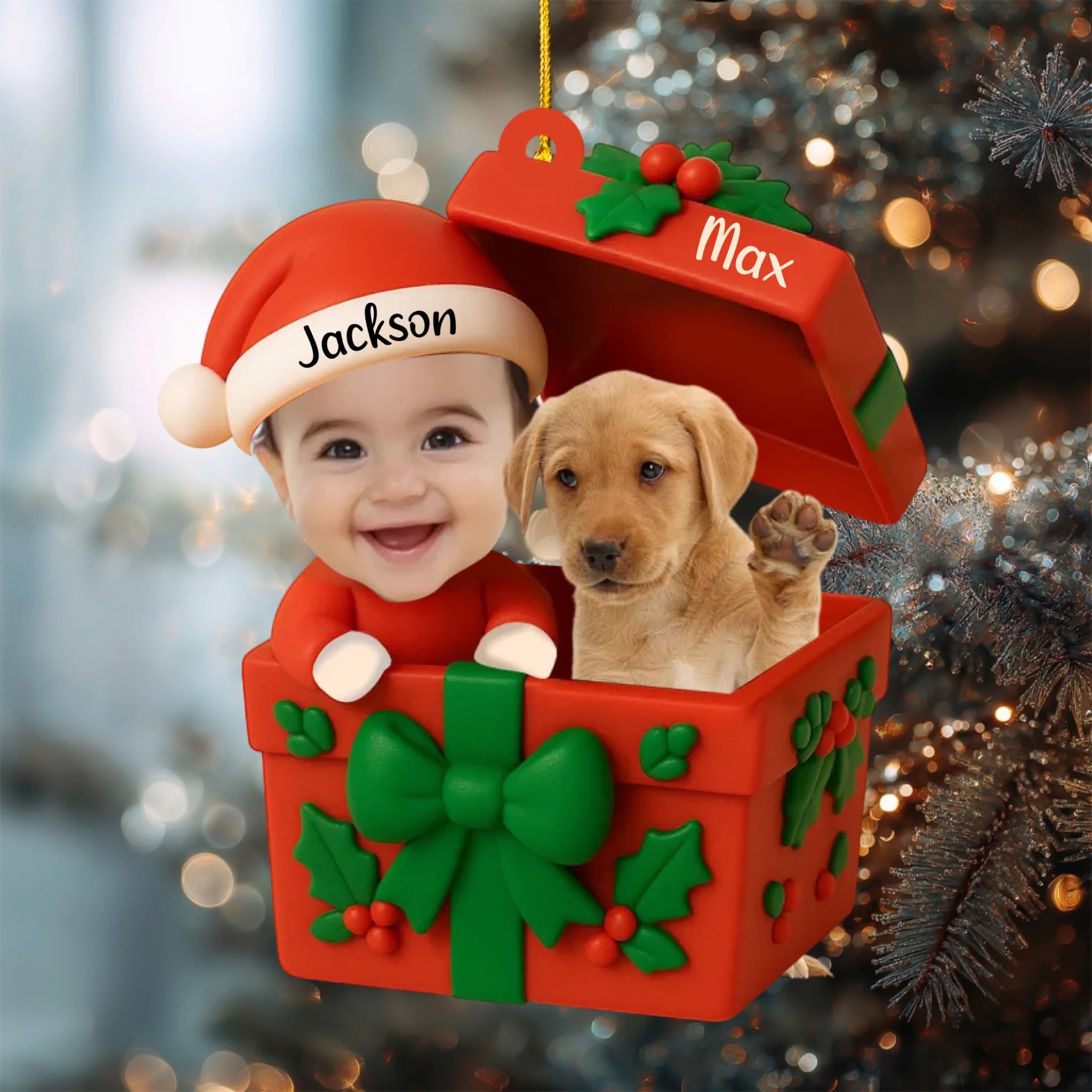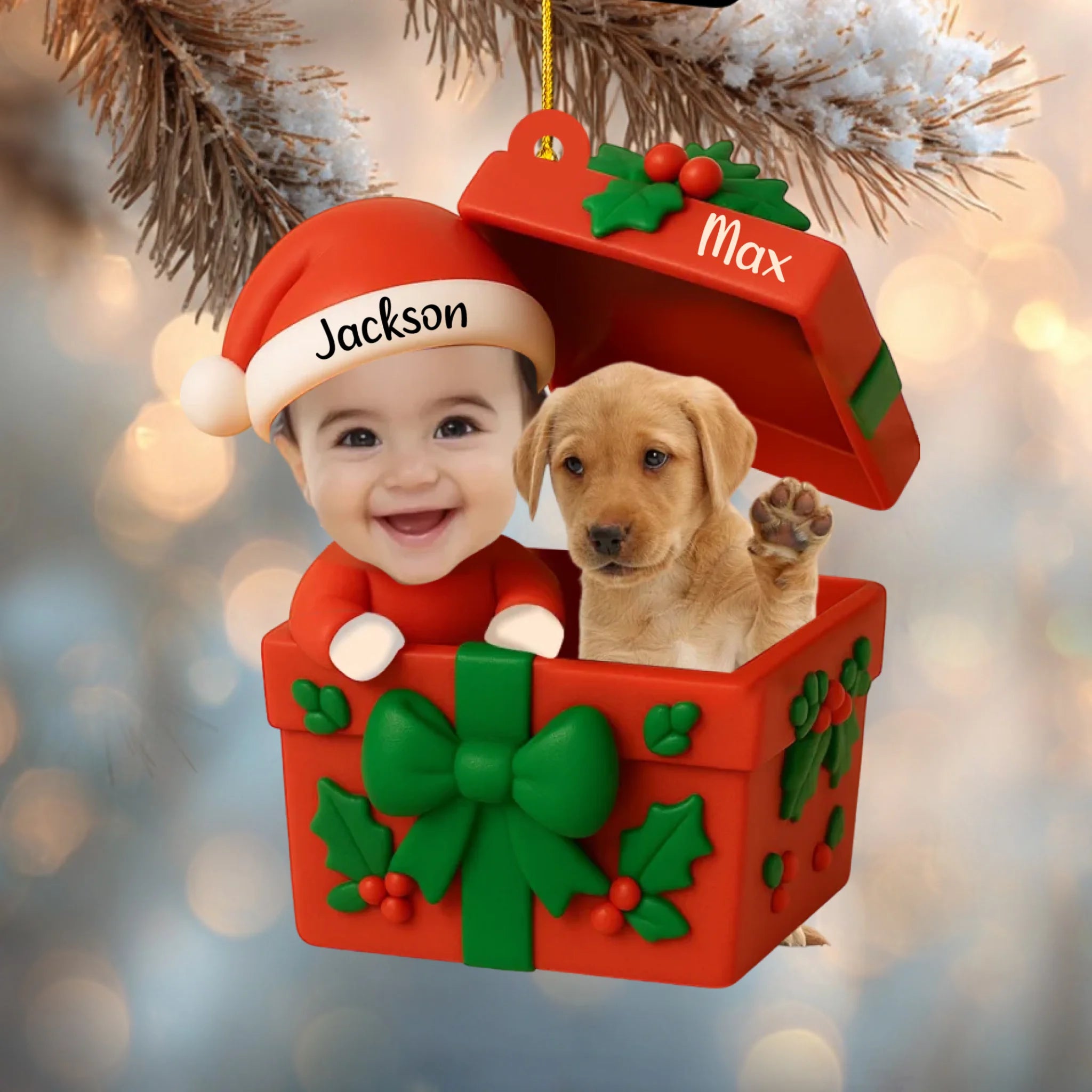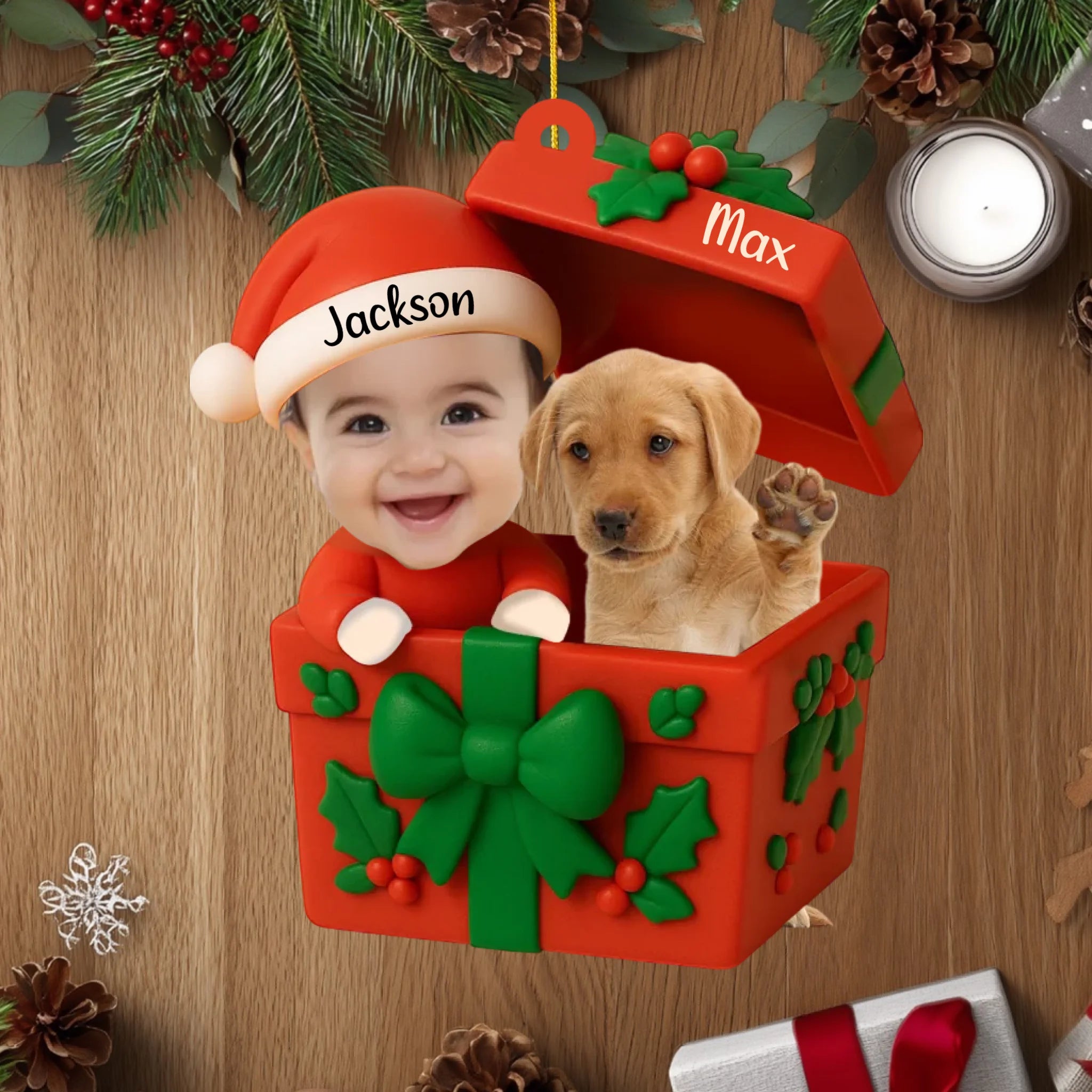 Unser Personalisiertes Acrylornament „Baby & Haustier – Erstes Weihnachten“ ist ein herzerwärmendes Andenken, das Ihr Kind und seinen Welpen oder sein Kätzchen zusammen in einer bezaubernden Geschenkbox zeigt. Gestalten Sie es mit beiden Namen und kreieren Sie ein einzigartiges Ornament, das jeden Weihnachtsbaum oder jede Weihnachtsdekoration zum Strahlen bringt.