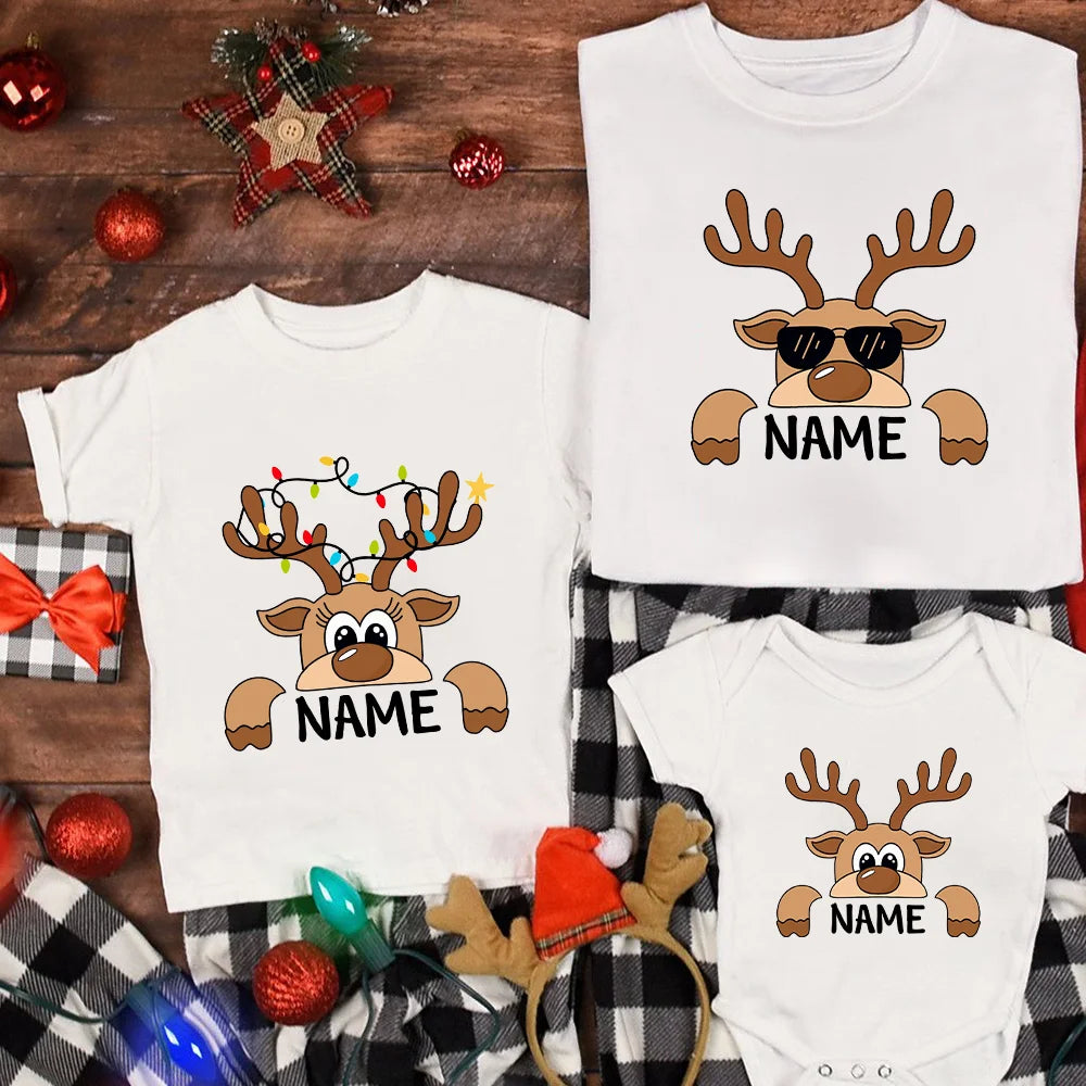 Create magical holiday memories with these adorable personalized family Christmas shirts featuring a cute reindeer design. Each piece can be customized with your family members’ names, making every outfit truly special and meaningful. Perfect for Christmas photos, family parties, or cozy matching at home during the festive season.