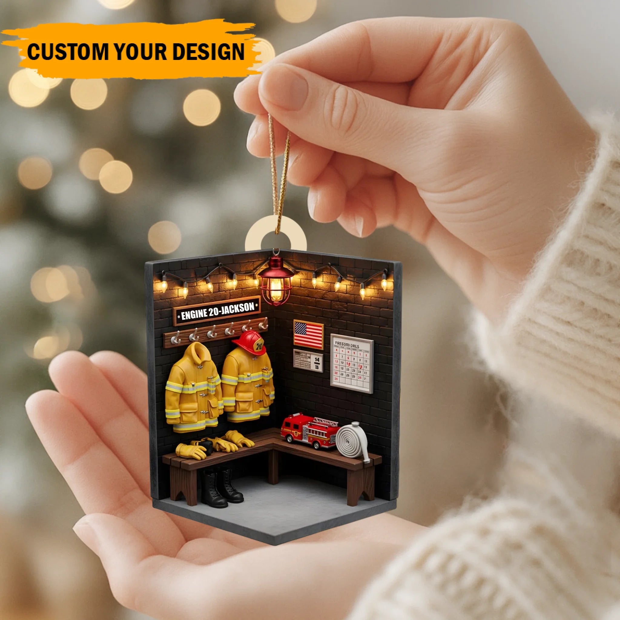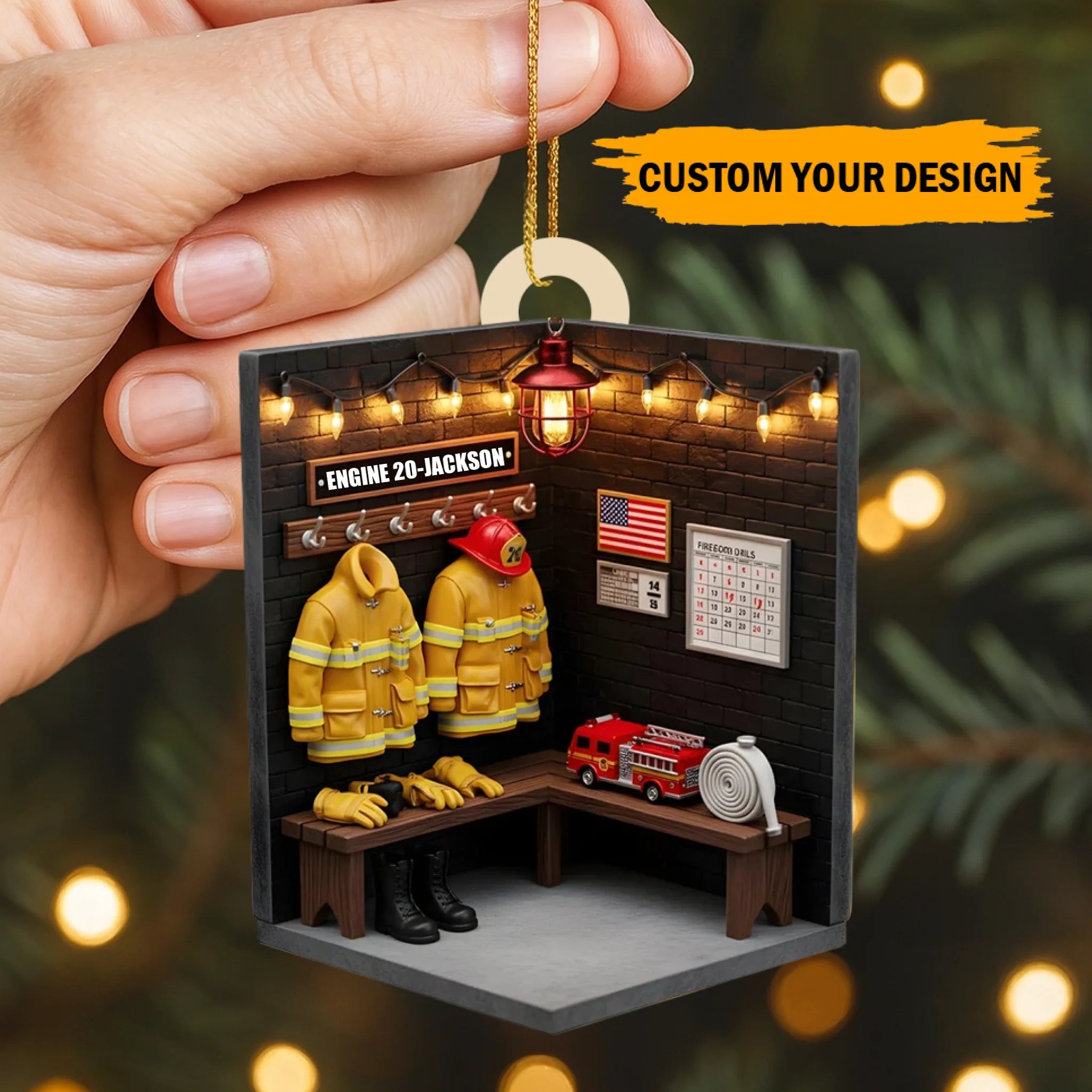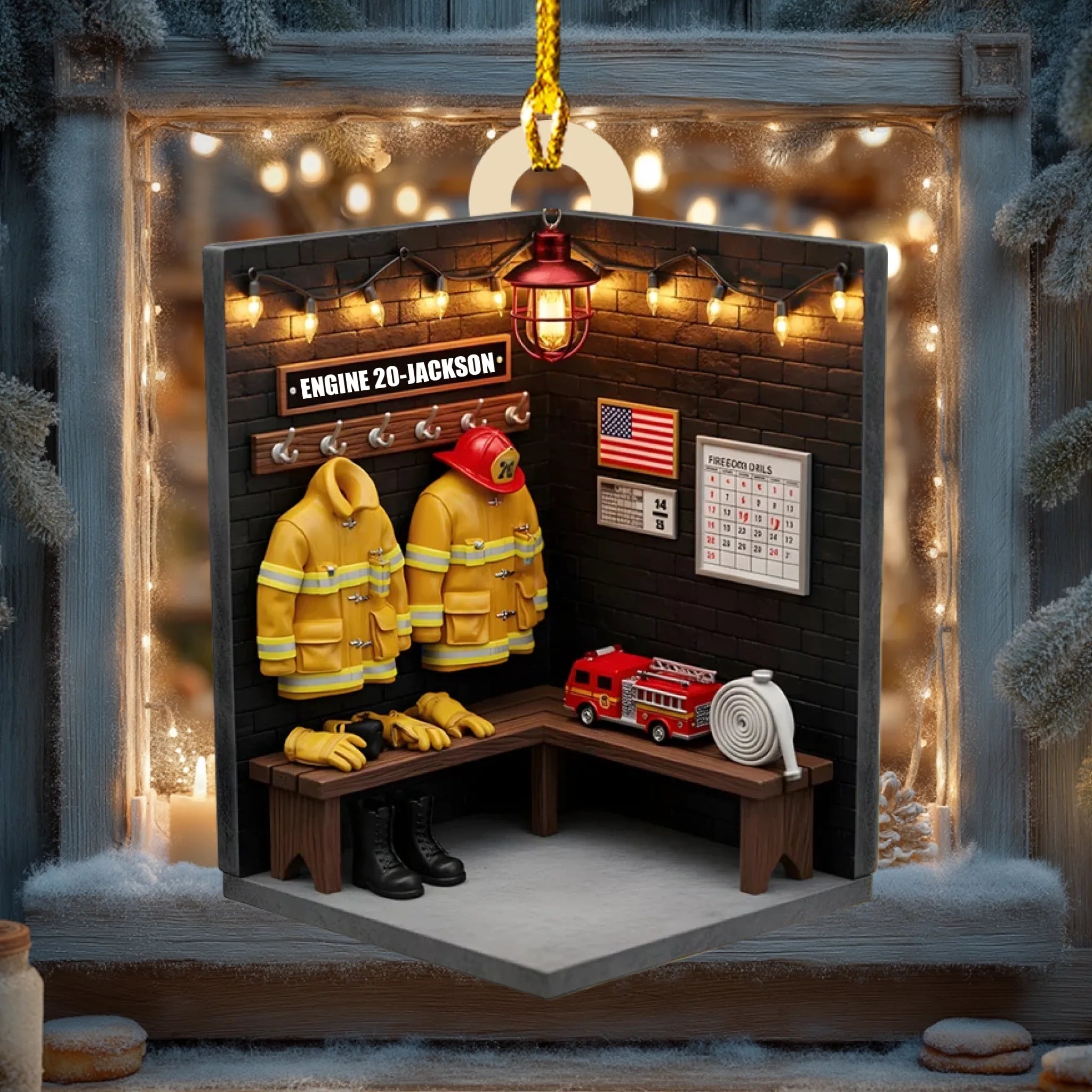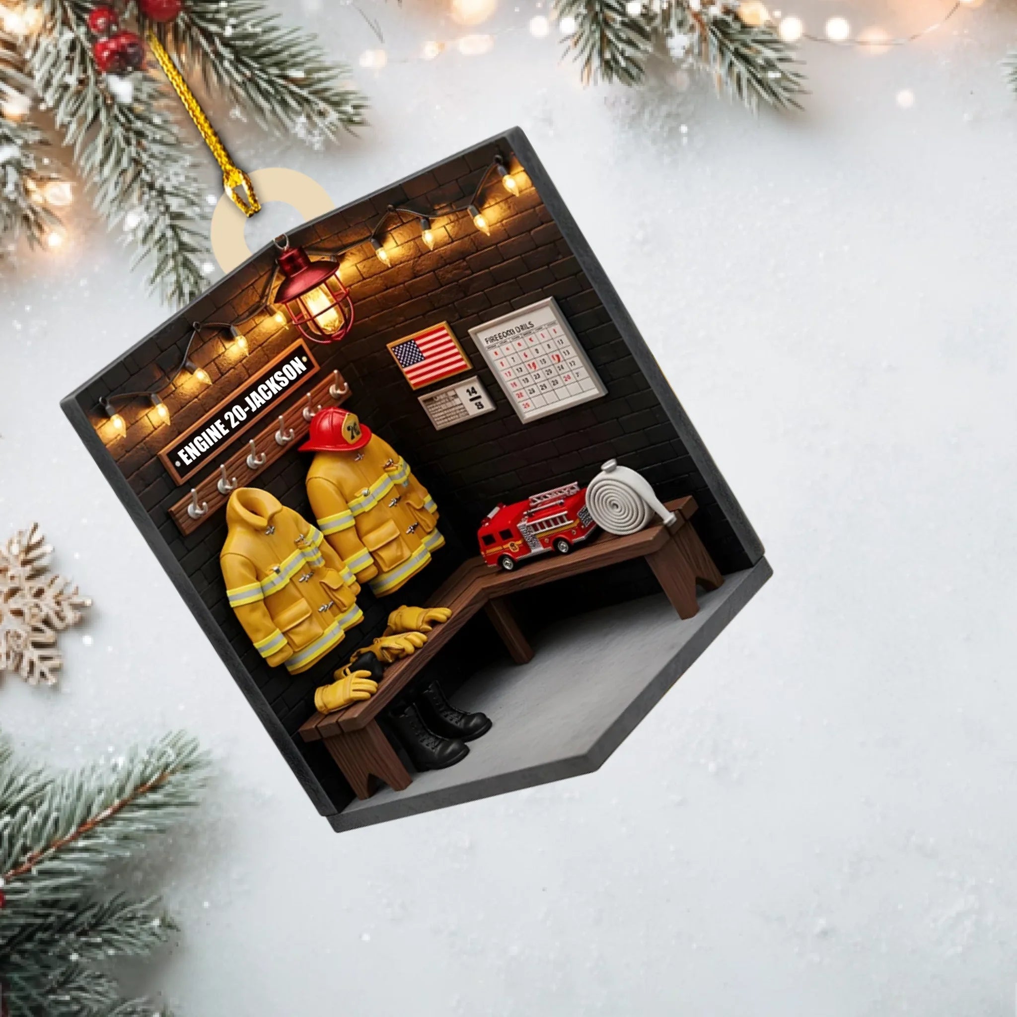 Dieses Ornament zeigt eine gemütliche Feuerwache-Spindszene, komplett mit Jacken, Stiefeln, Helmen und einer amerikanischen Flagge und kann personalisiert werden mit dem Namen Ihres Feuerwehrmanns, der Stationsnummer und der Jackenfarbe — was es zu einer wirklich bedeutungsvollen Dekoration für Weihnachten oder ganzjährigem Gebrauch macht.