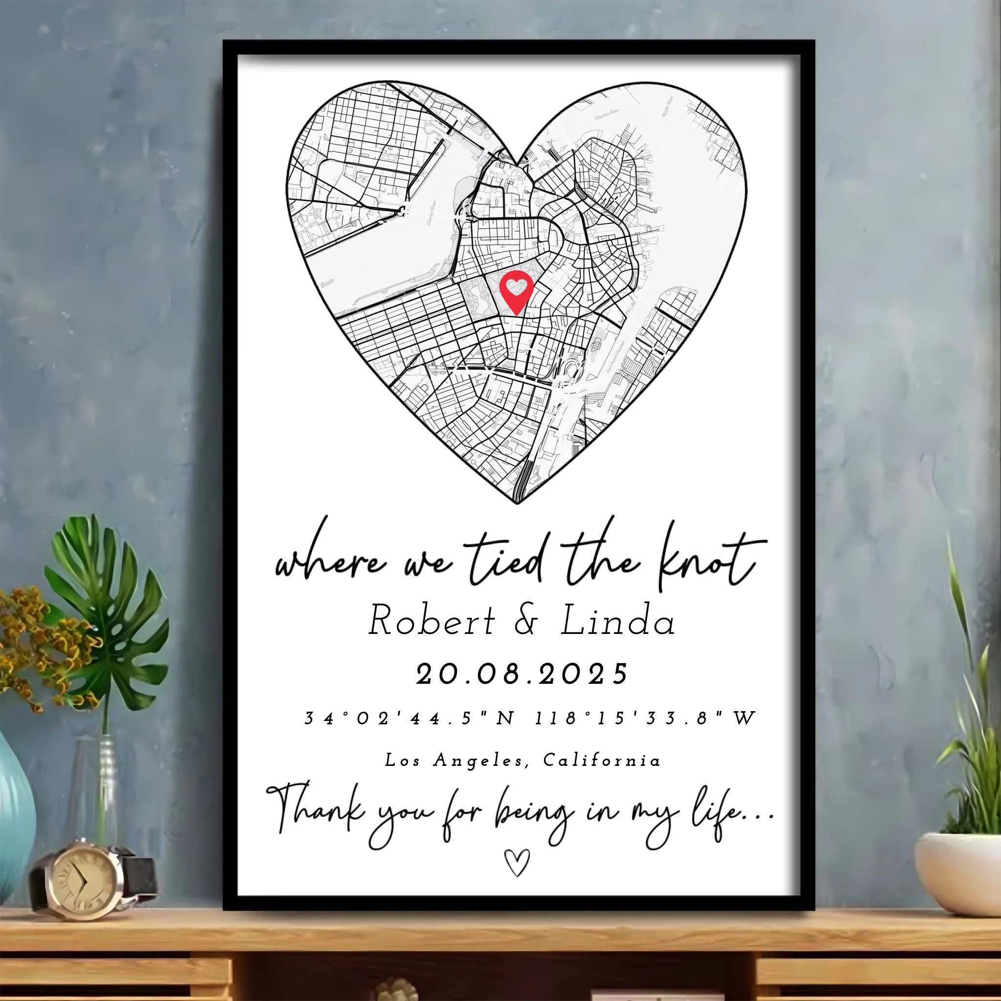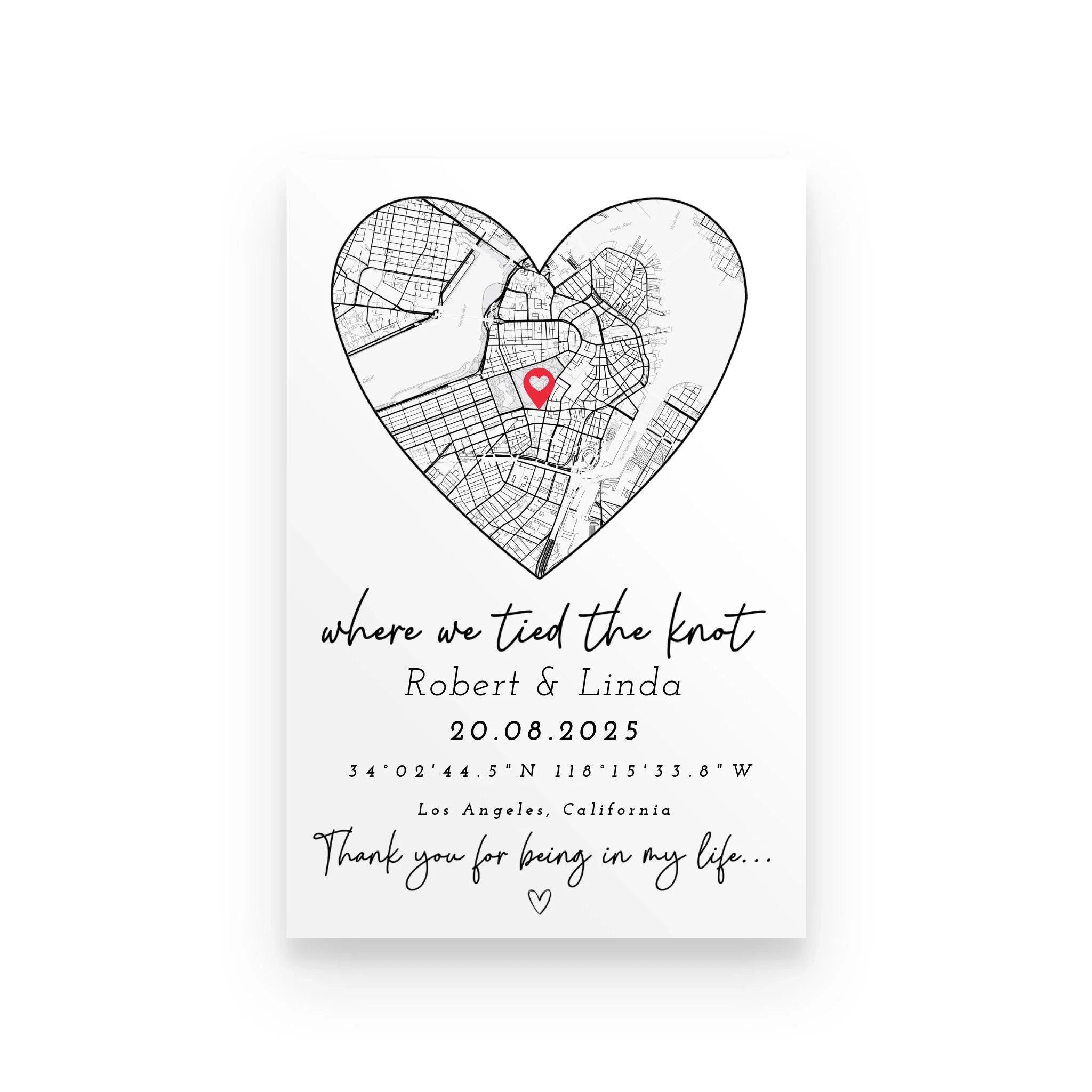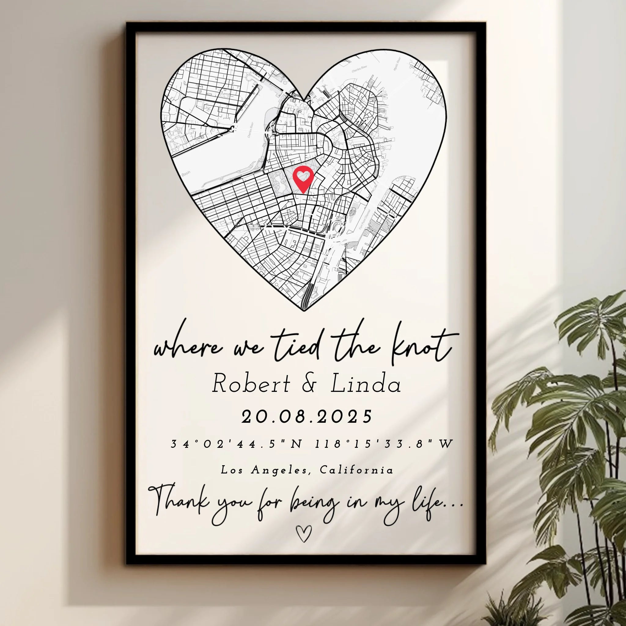 Personalisiertes Jubiläumsposter mit Herzkarte – Benutzerdefinierte Namen, Datum, Koordinaten und besonderer Ortsdruck