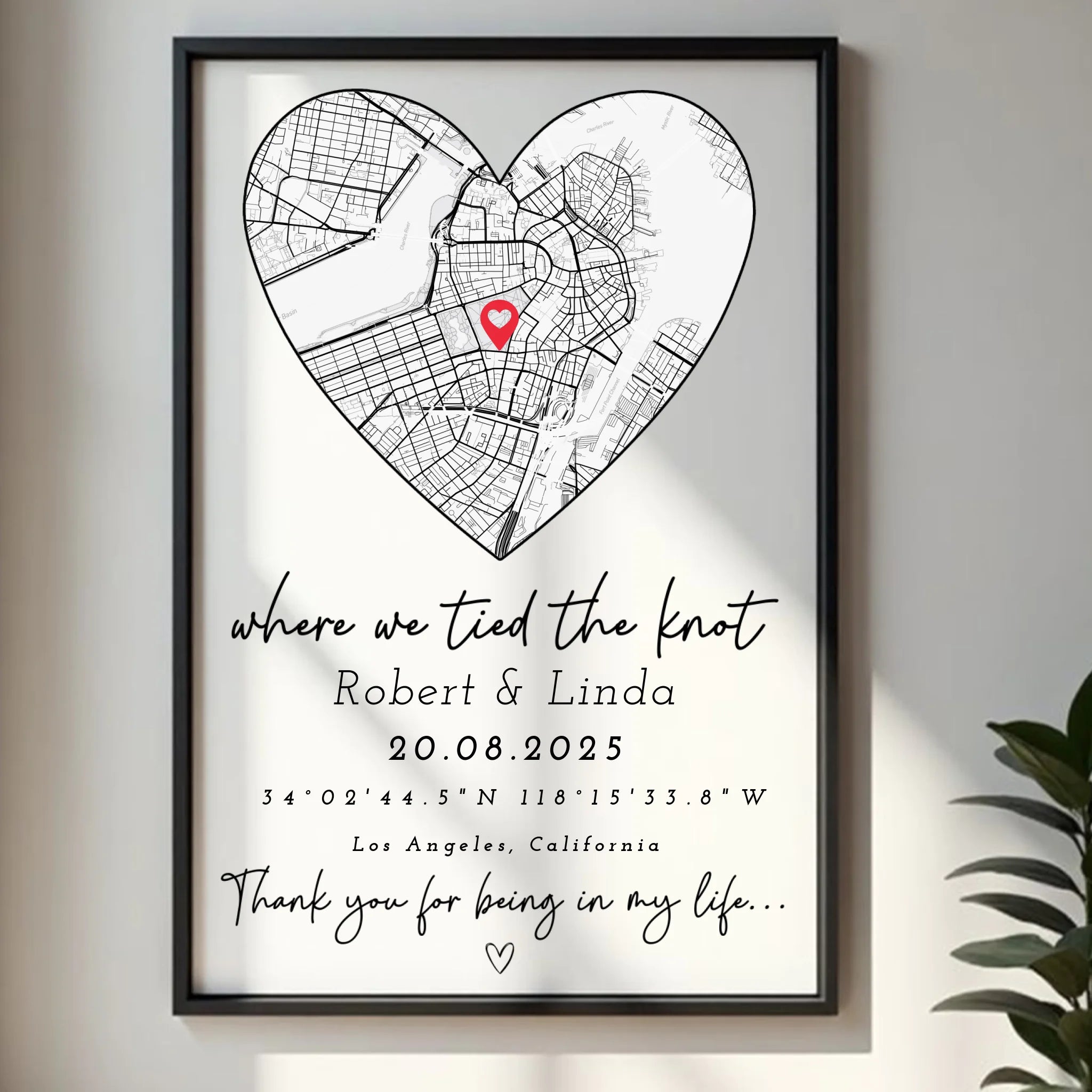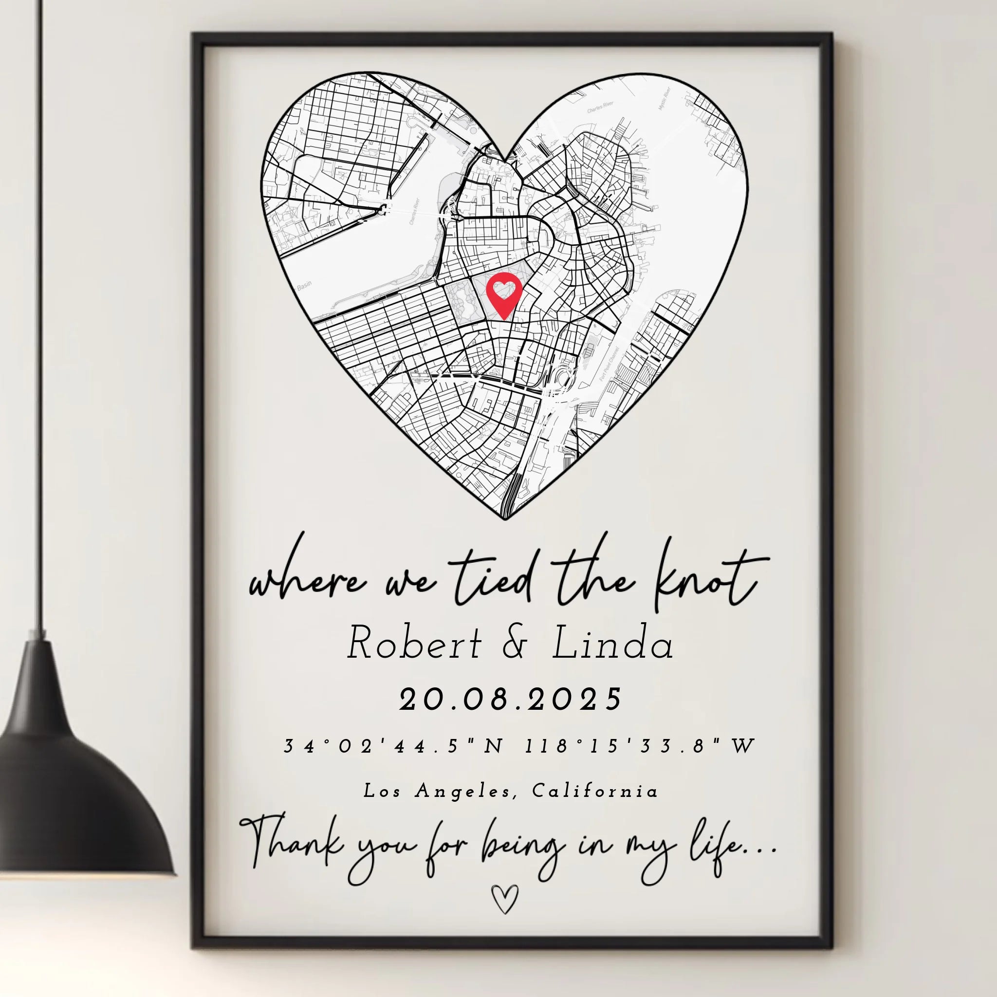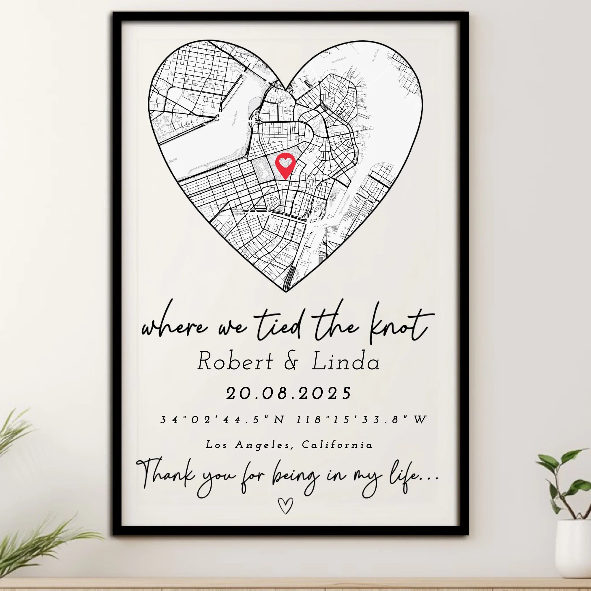 Personalisiertes Jubiläumsposter mit Herzkarte – Benutzerdefinierte Namen, Datum, Koordinaten und besonderer Ortsdruck