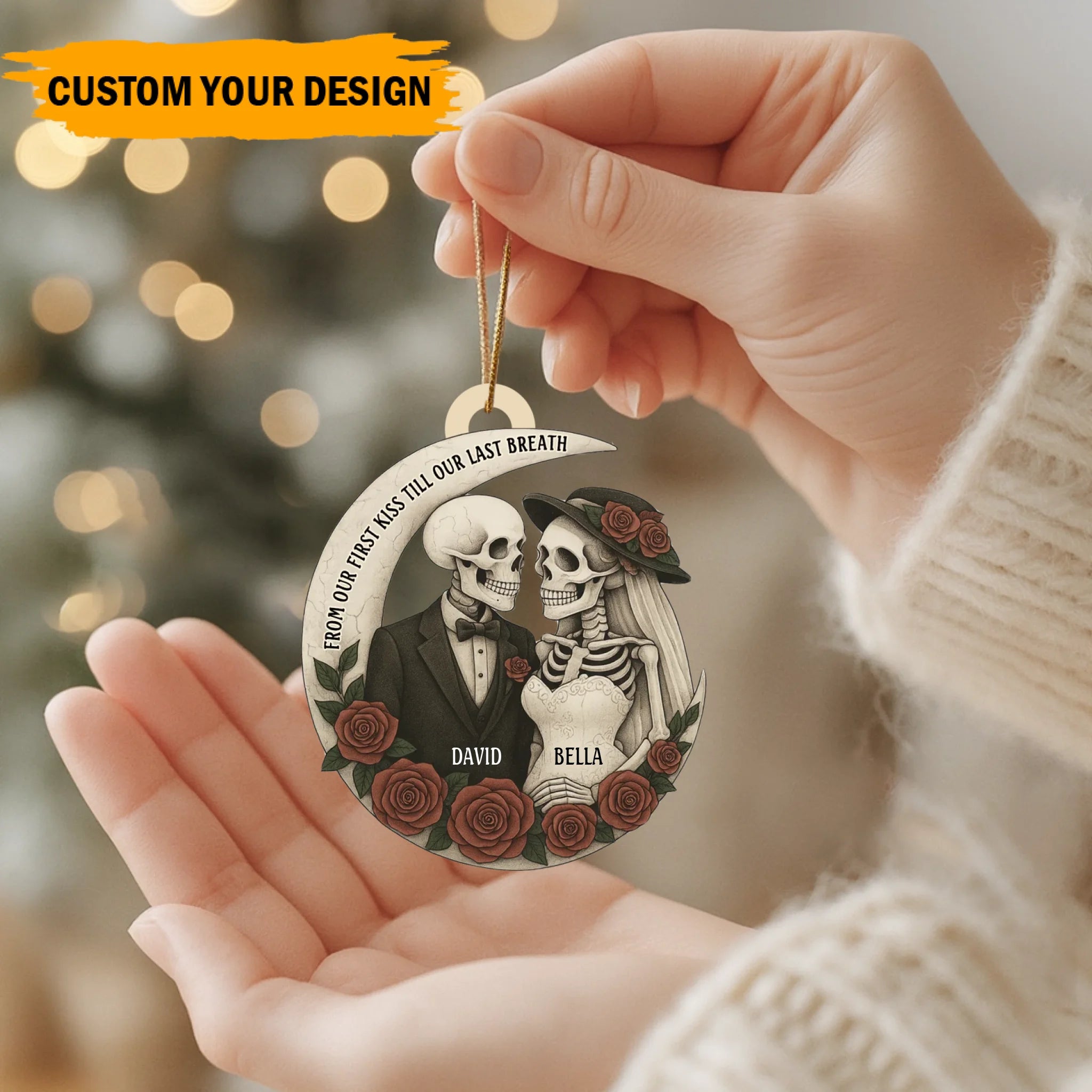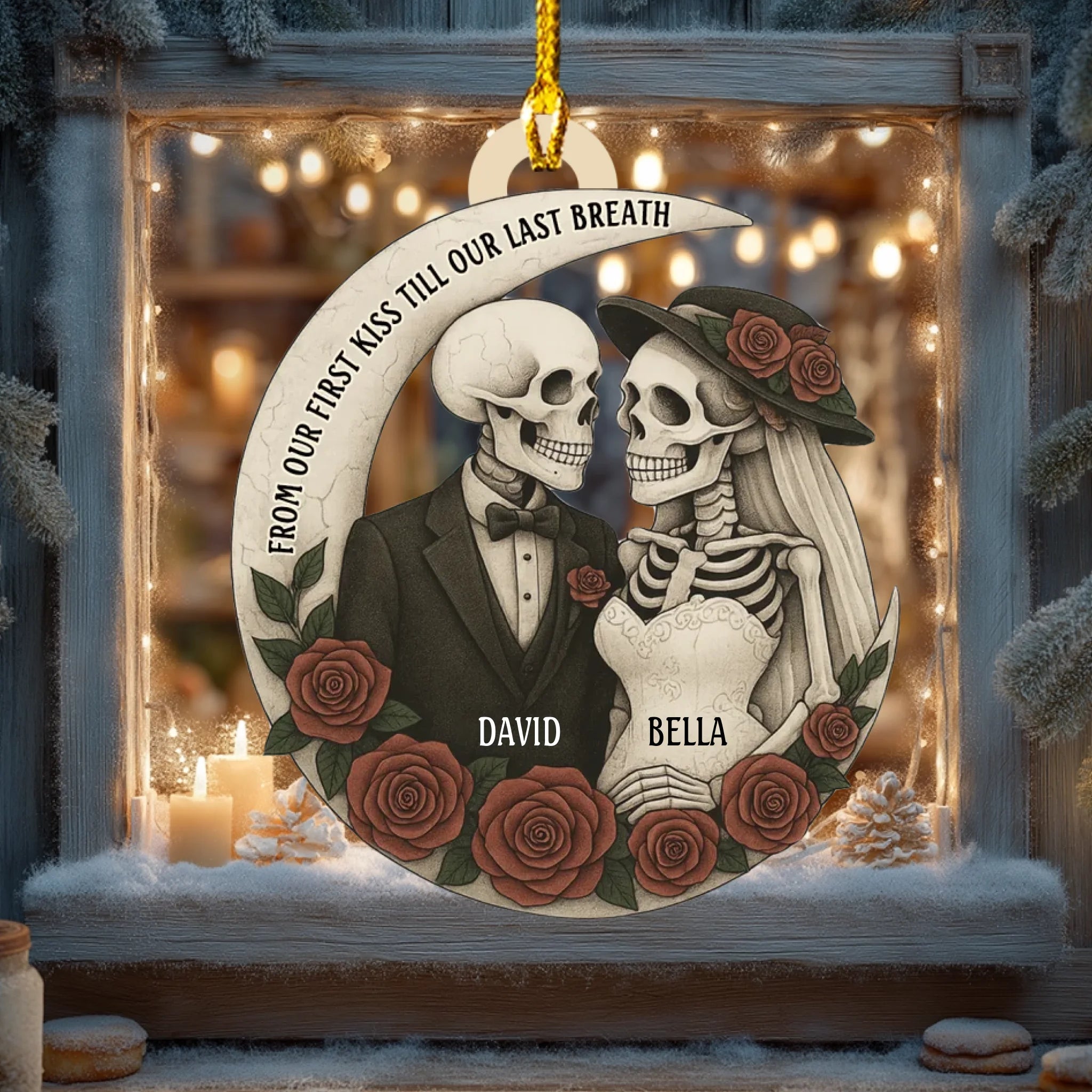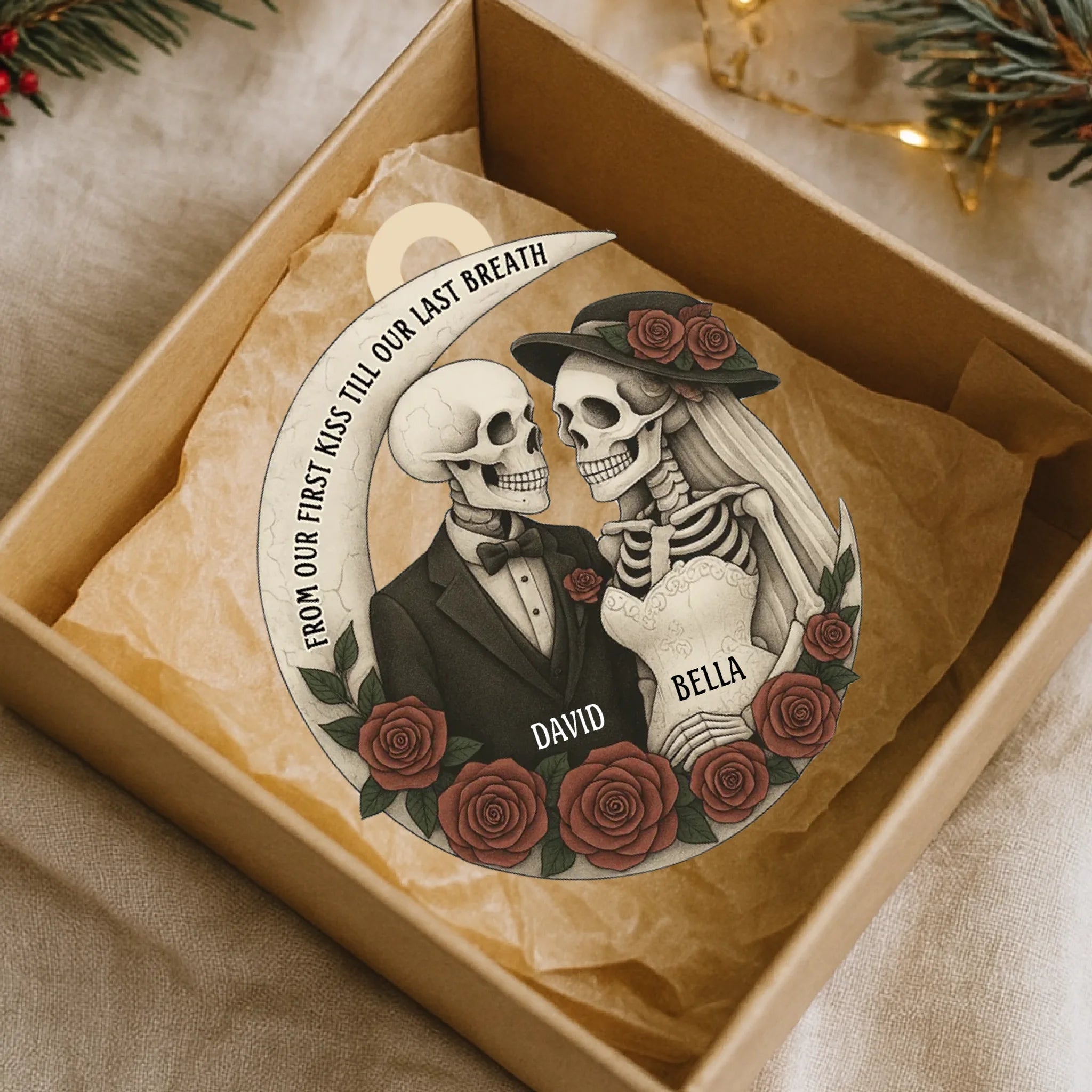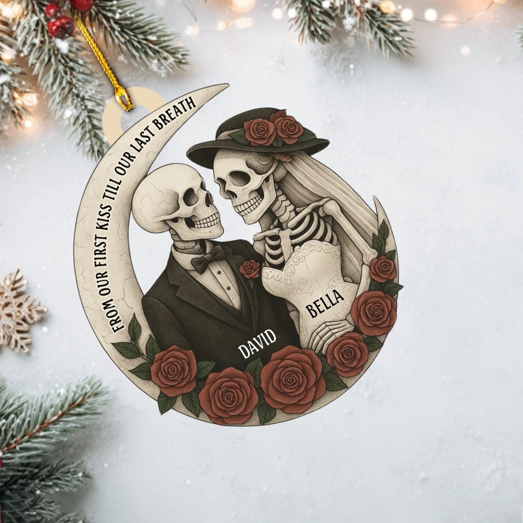 Beautifully designed with a gothic romantic twist, this ornament features a skeleton couple in wedding attire beneath a crescent moon and blooming roses — a perfect symbol of unbreakable love and devotion.