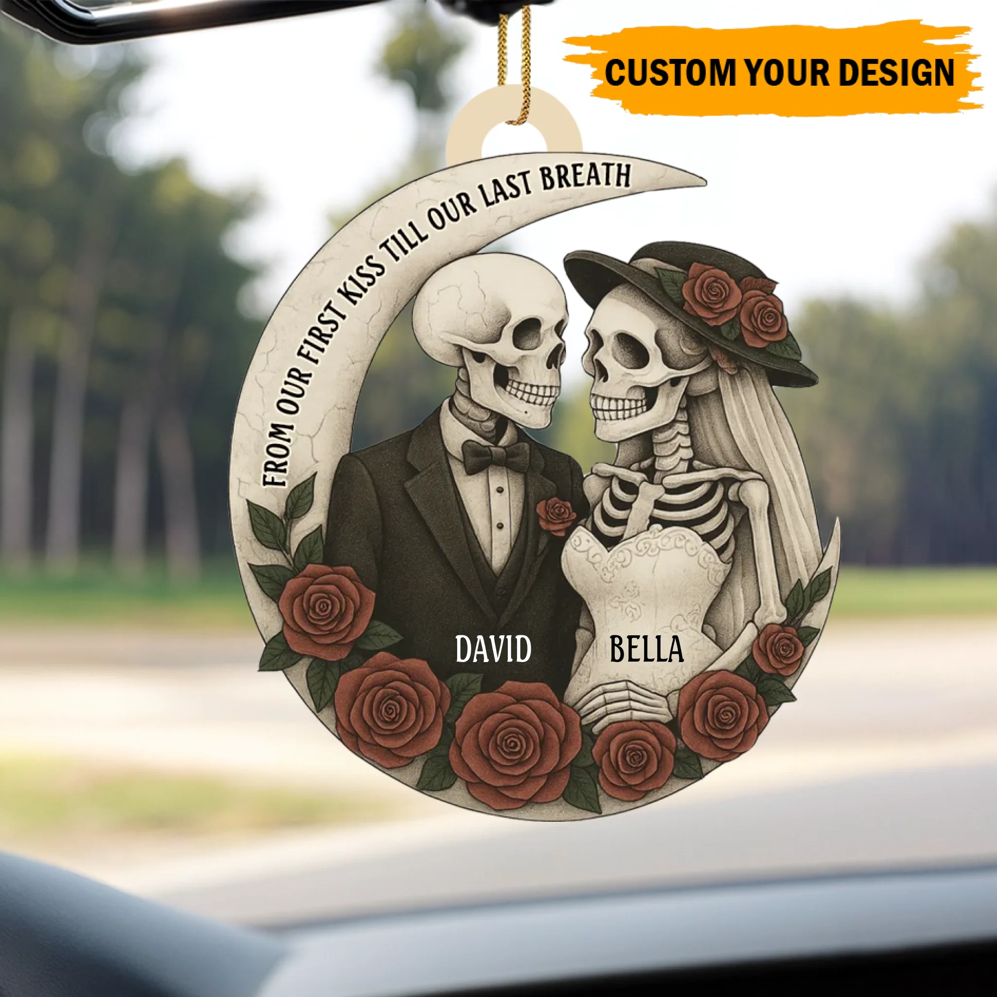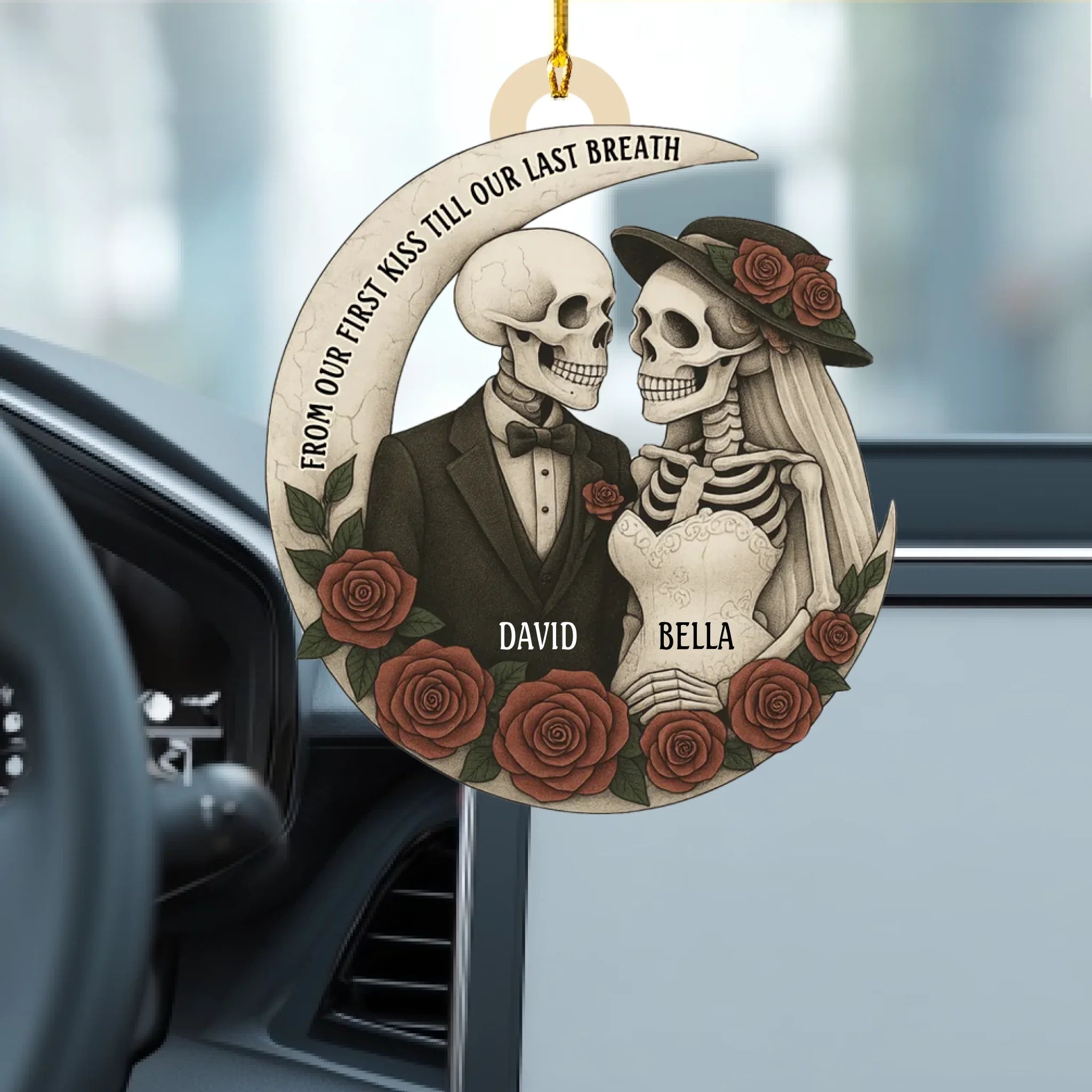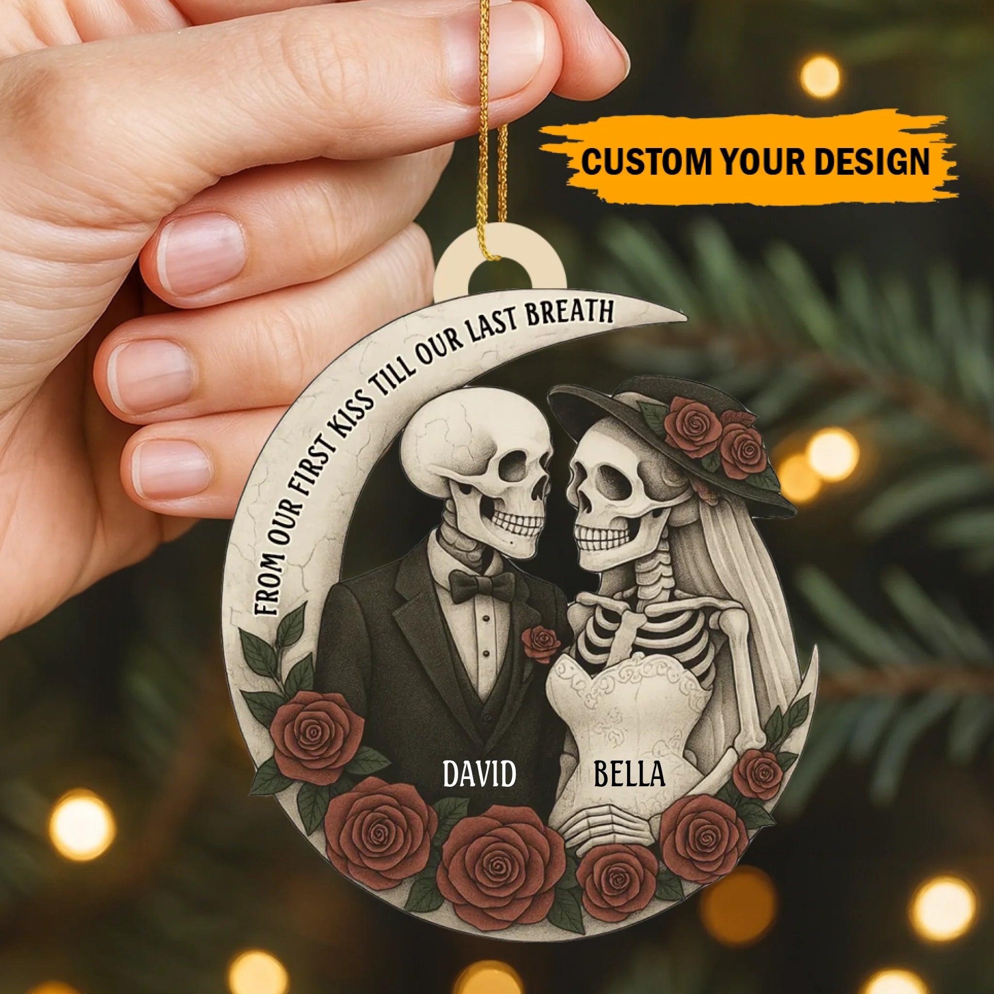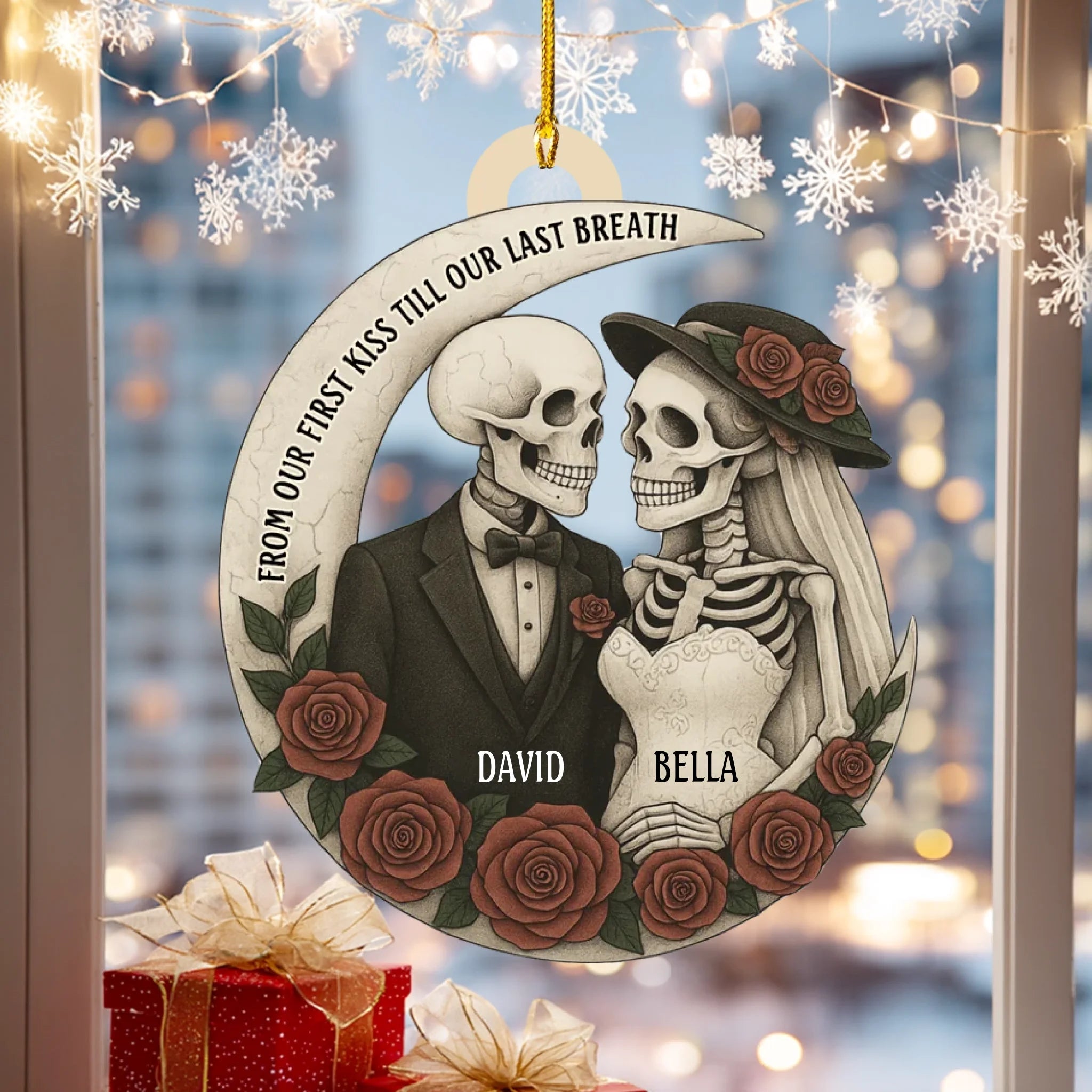Beautifully designed with a gothic romantic twist, this ornament features a skeleton couple in wedding attire beneath a crescent moon and blooming roses — a perfect symbol of unbreakable love and devotion.