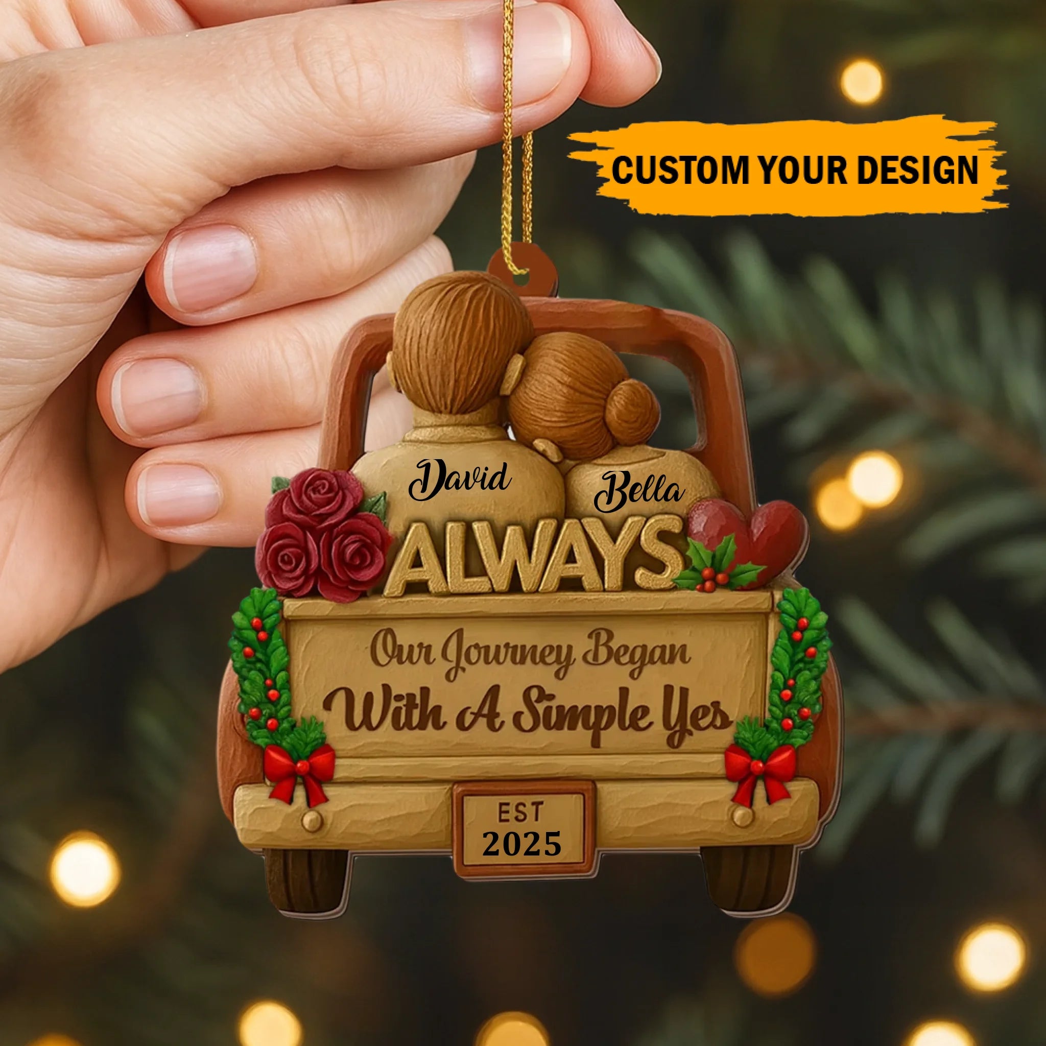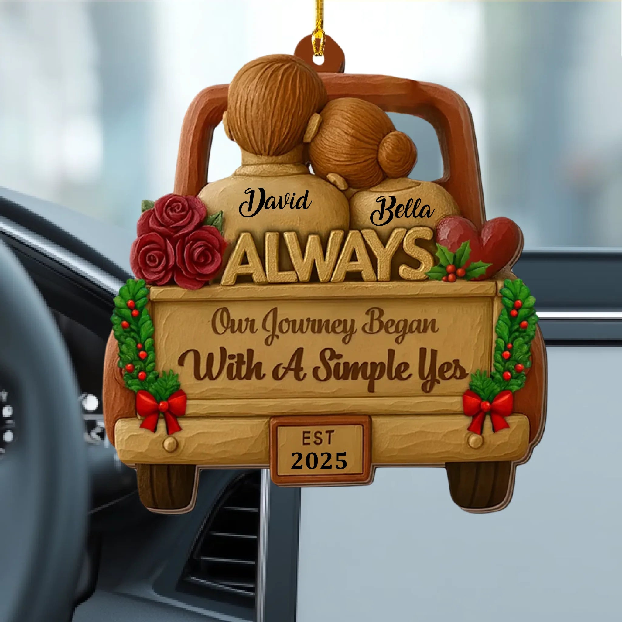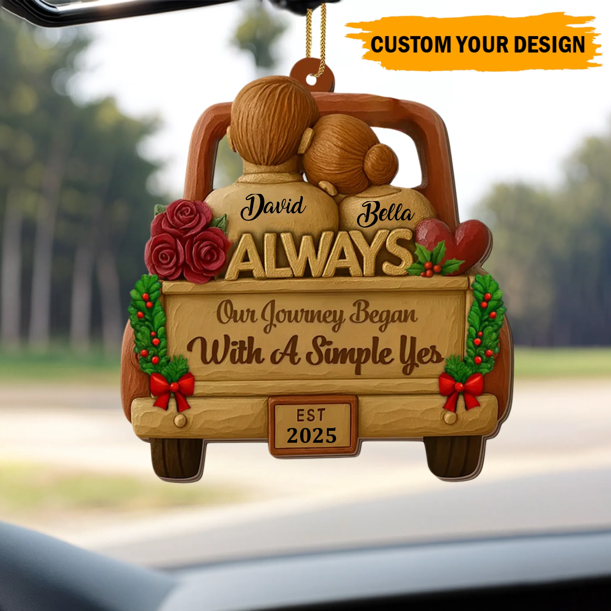 Dieses entzückende Design zeigt ein verliebtes Paar, das gemeinsam auf einem Auto sitzt, mit der herzlichen Botschaft „Unsere Reise begann mit einem einfachen Ja.“ Fügen Sie Ihre Namen und das besondere Jahr hinzu, um ein einzigartiges Erinnerungsstück zu schaffen, das die ewige Liebe und Verbundenheit perfekt symbolisiert.