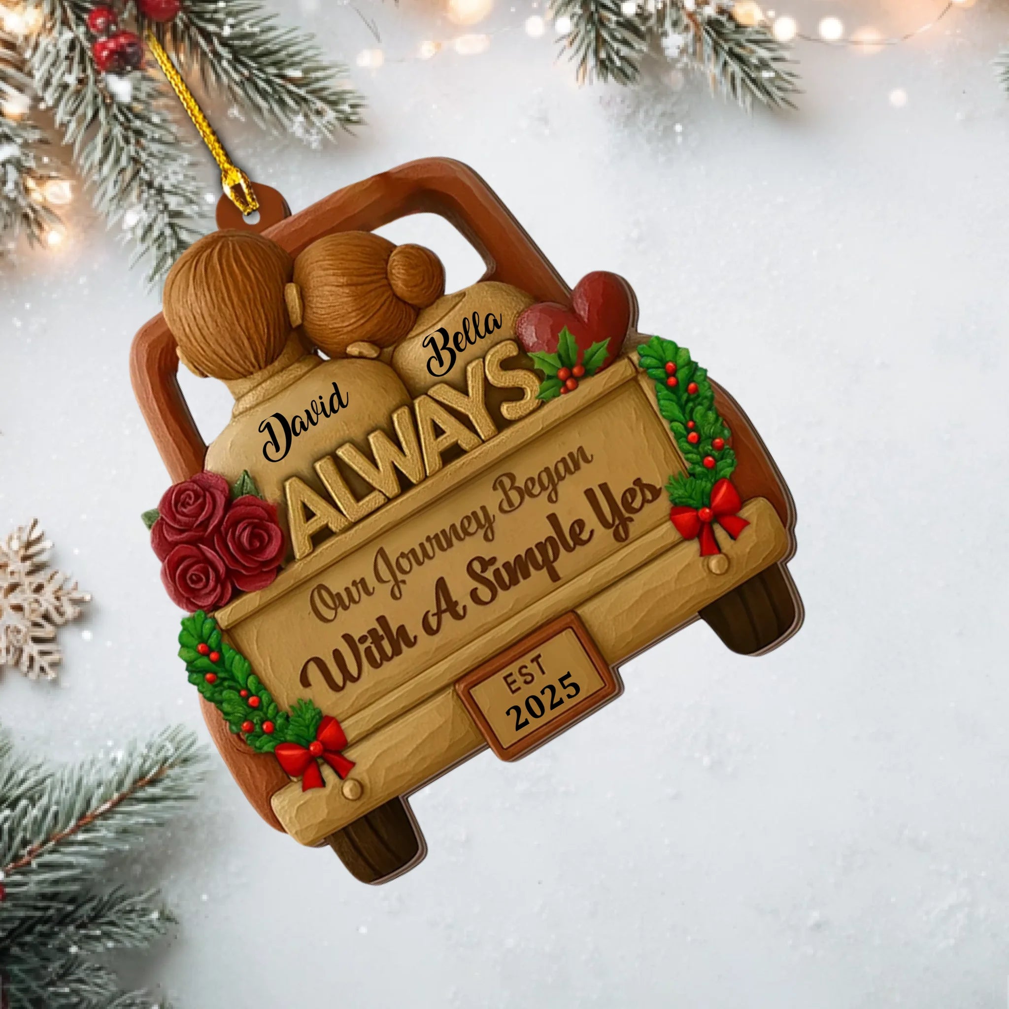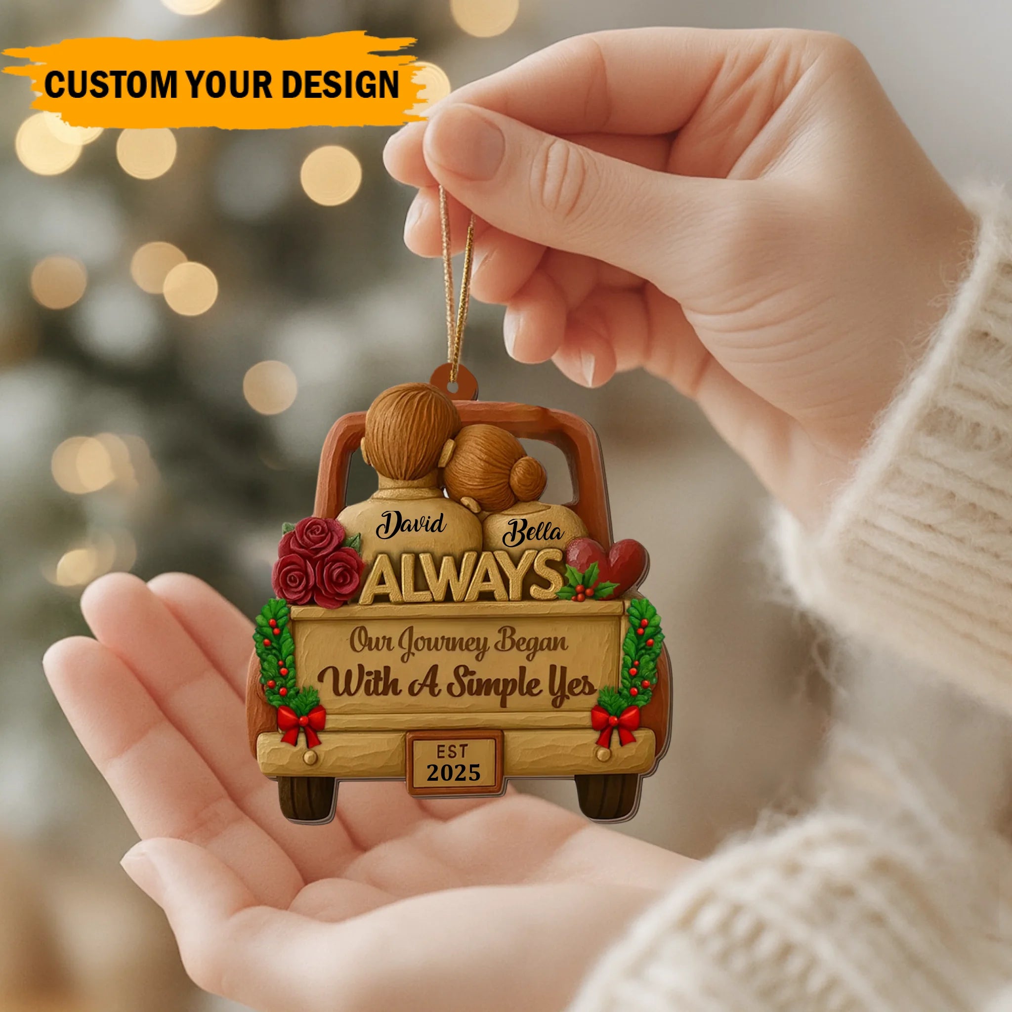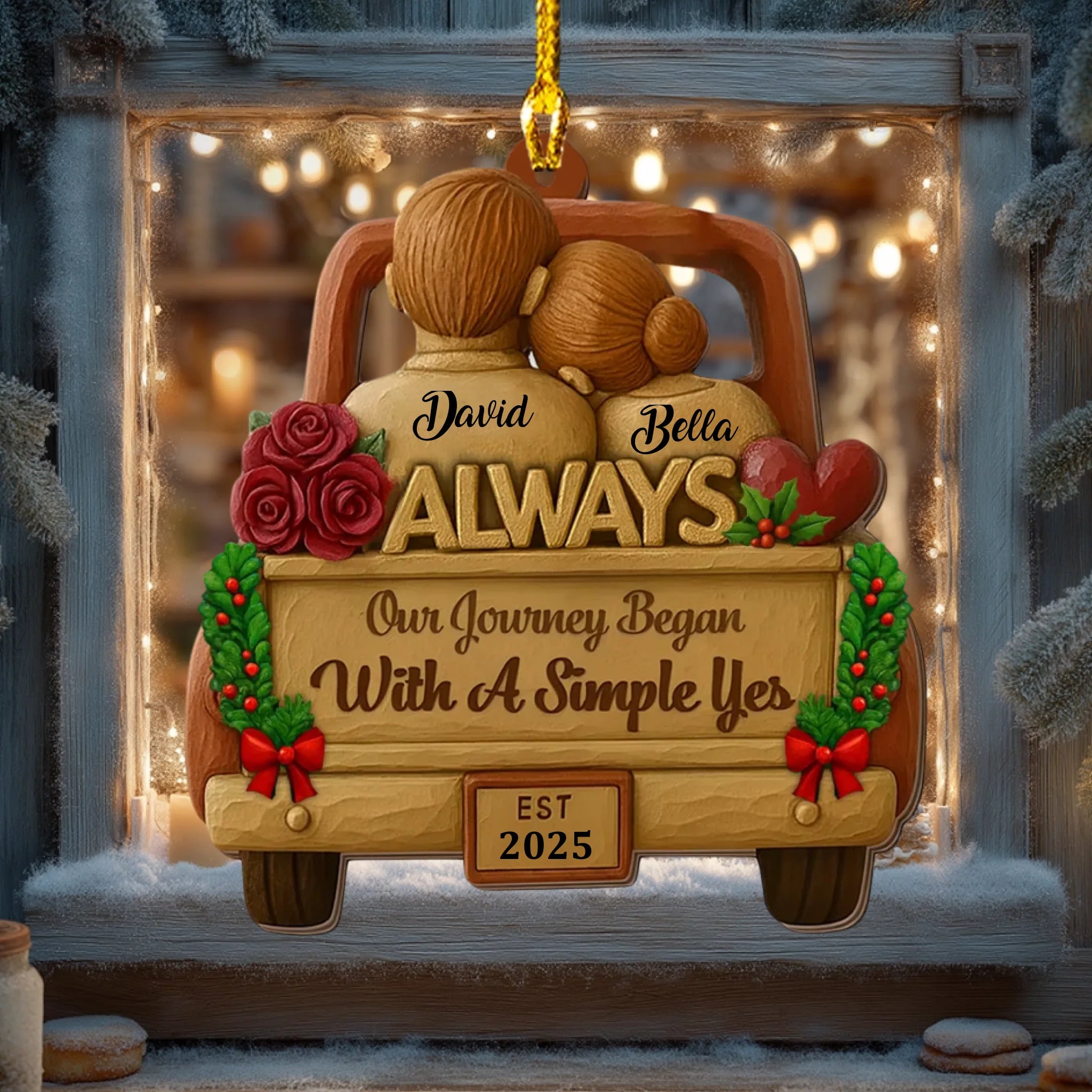 Dieses entzückende Design zeigt ein verliebtes Paar, das gemeinsam auf einem Auto sitzt, mit der herzlichen Botschaft „Unsere Reise begann mit einem einfachen Ja.“ Fügen Sie Ihre Namen und das besondere Jahr hinzu, um ein einzigartiges Erinnerungsstück zu schaffen, das die ewige Liebe und Verbundenheit perfekt symbolisiert.