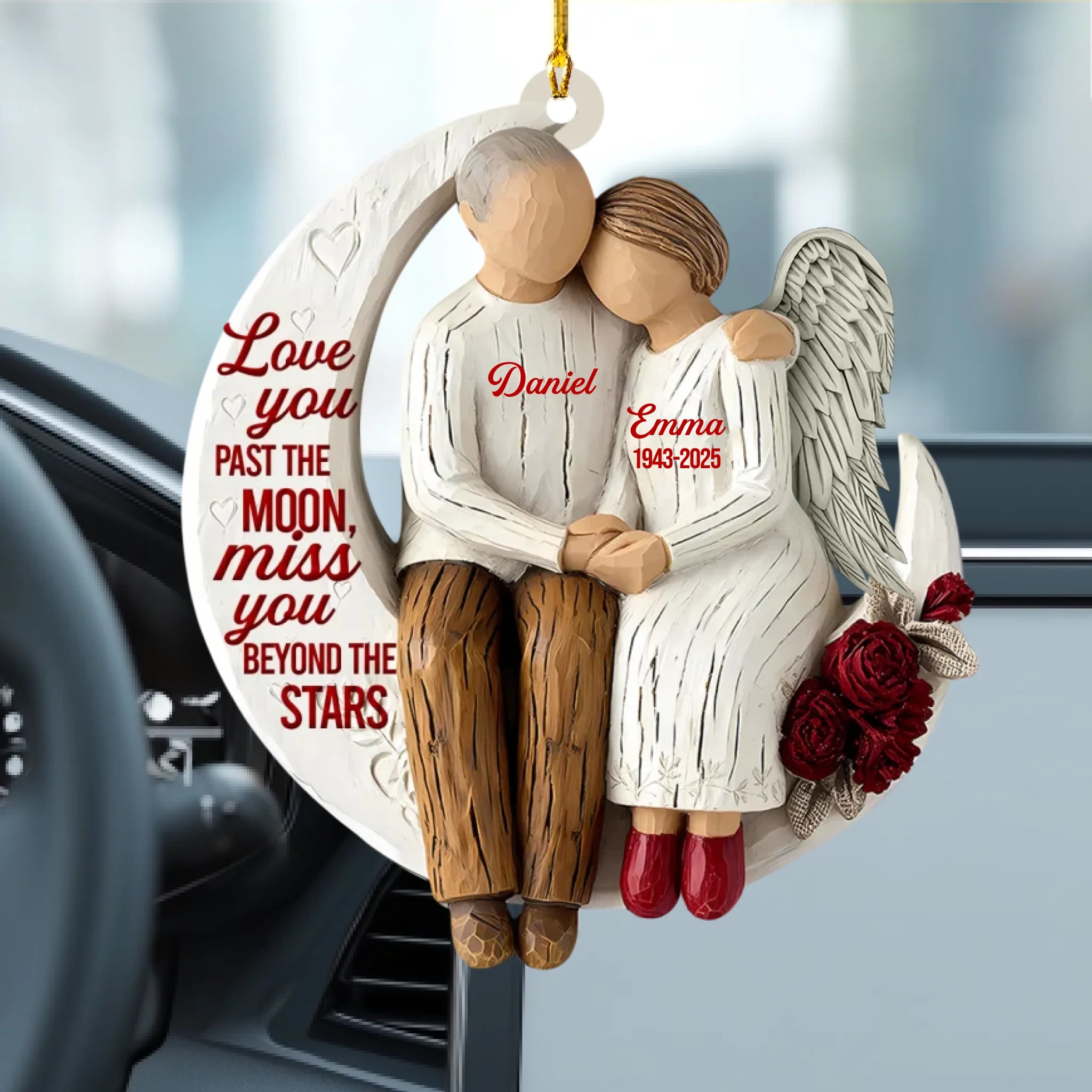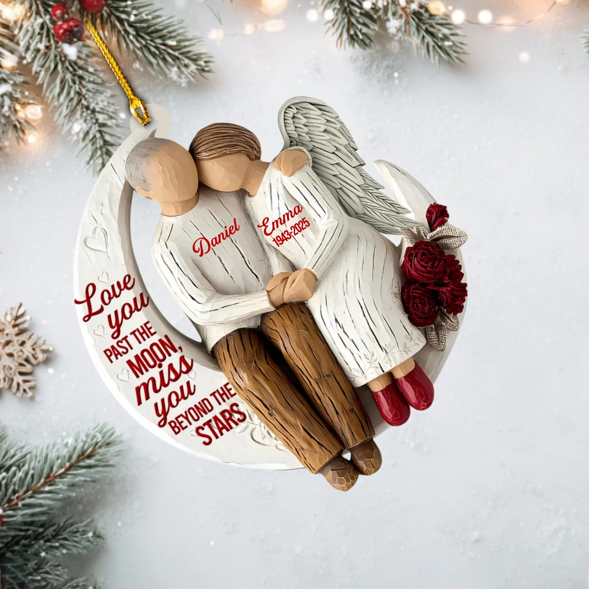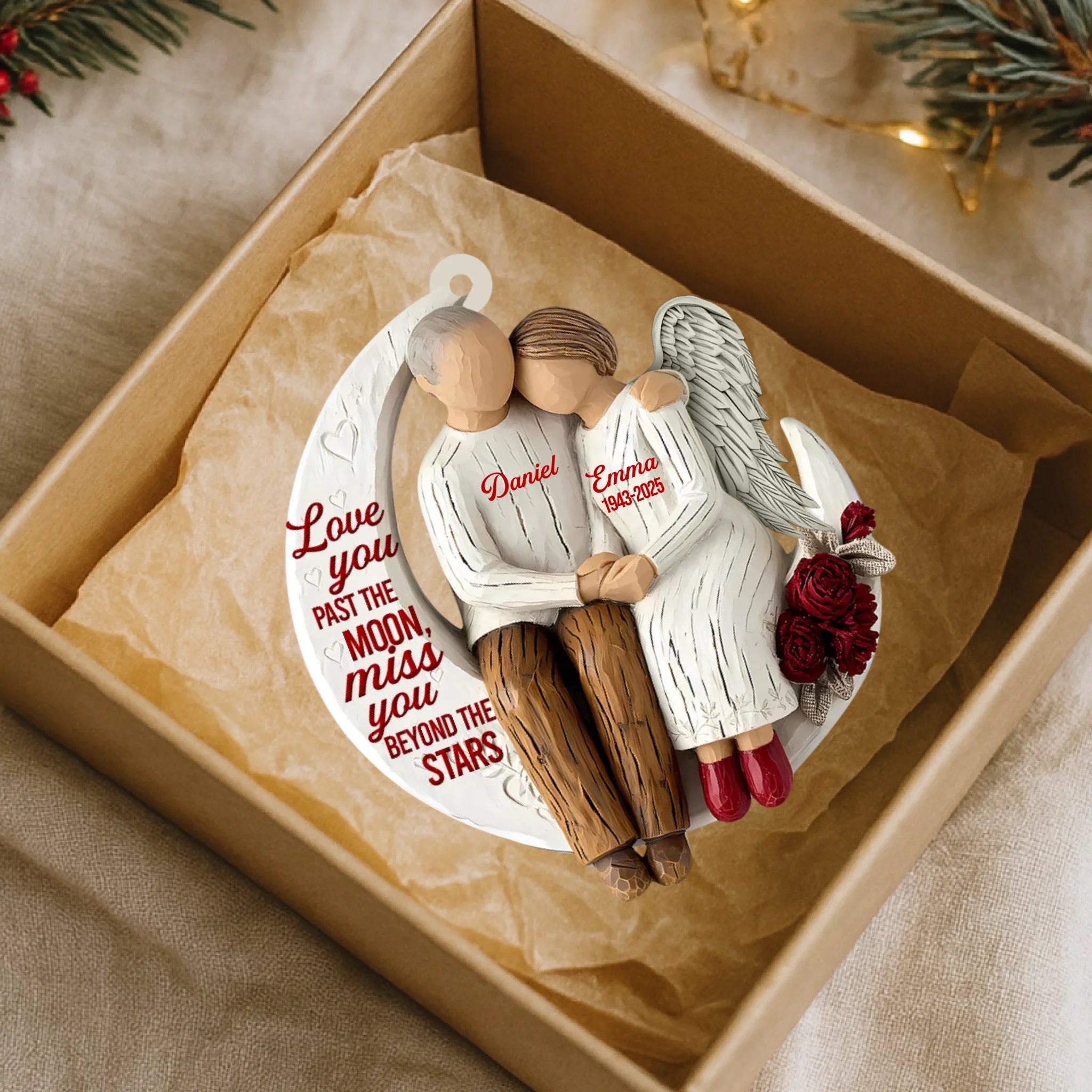 Personalisiertes Gedenkornament für Ehemann und Ehefrau – Individuelles Andenken mit Engelsflügeln aus Holz | „Love You Past the Moon“ Erinnerungsgeschenk