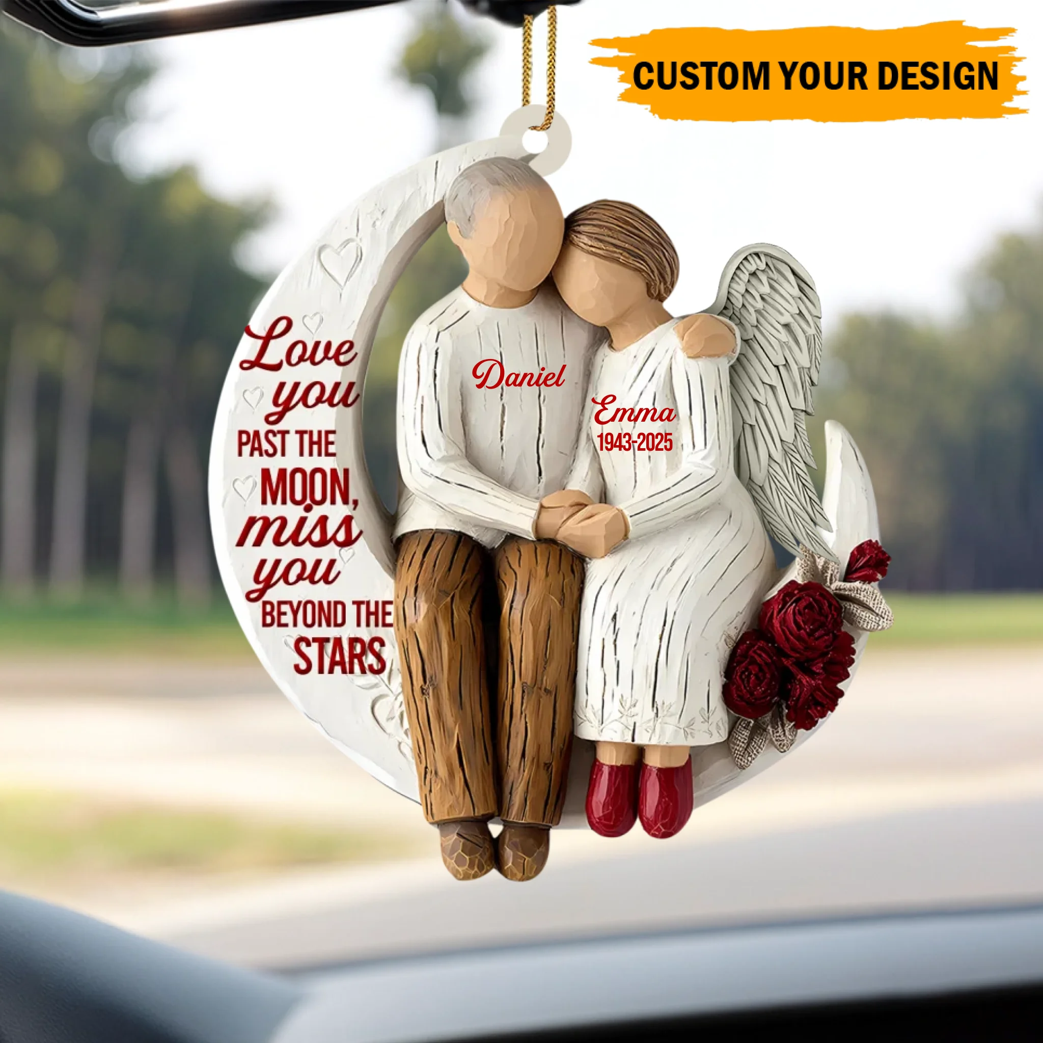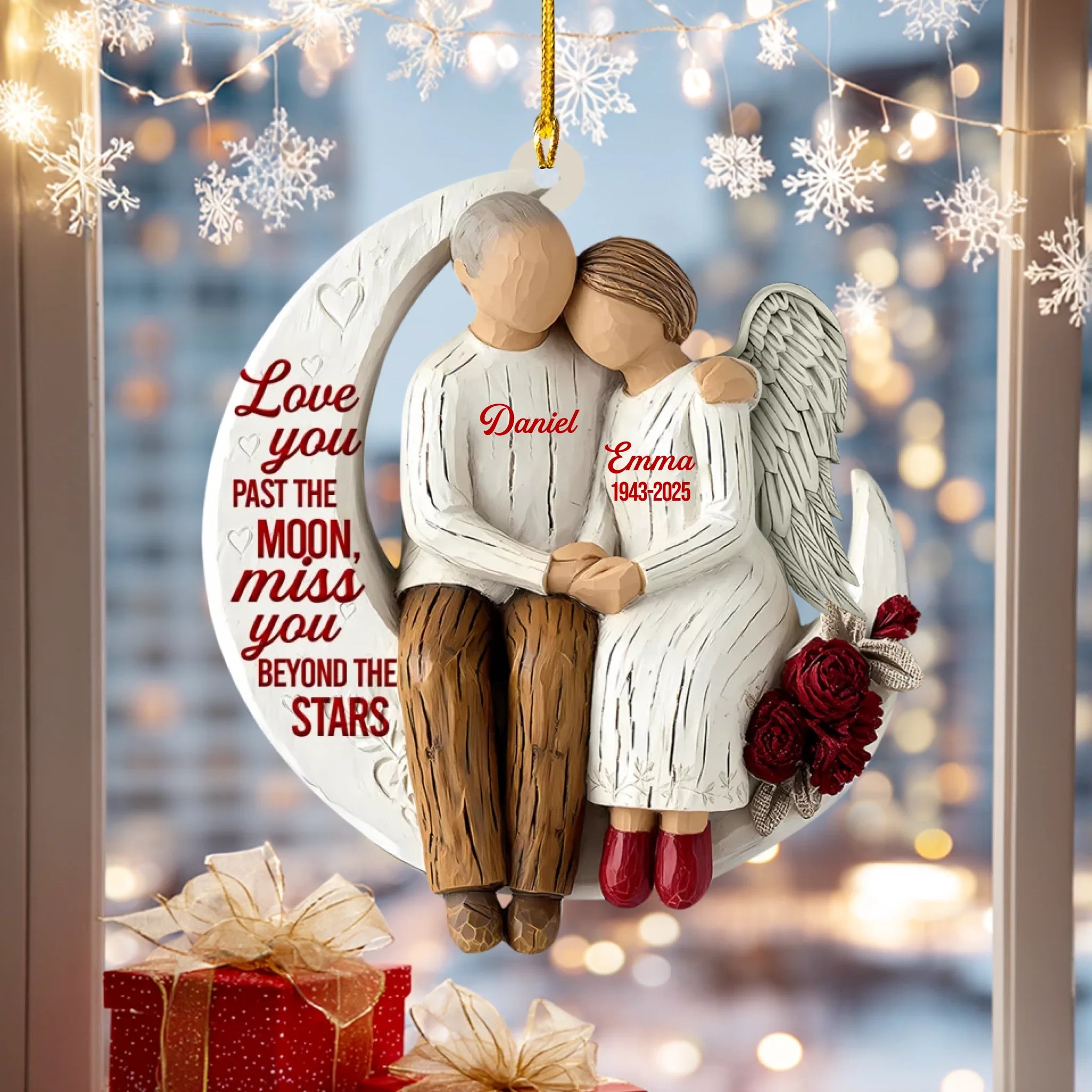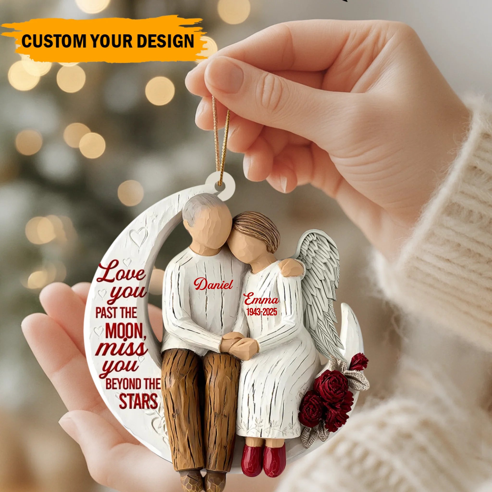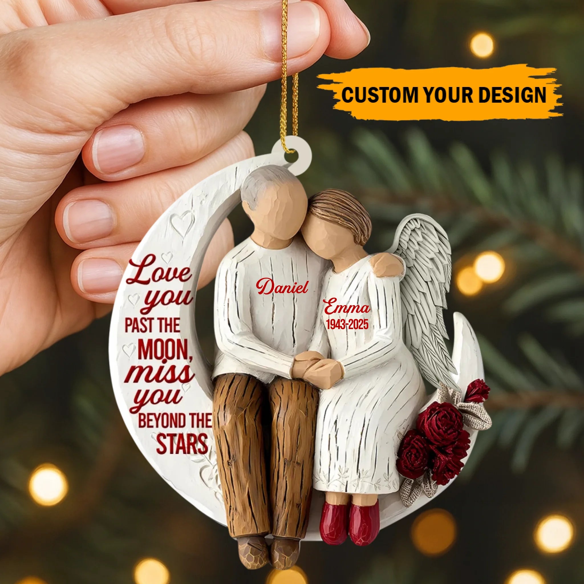 Personalisiertes Gedenkornament für Ehemann und Ehefrau – Individuelles Andenken mit Engelsflügeln aus Holz | „Love You Past the Moon“ Erinnerungsgeschenk