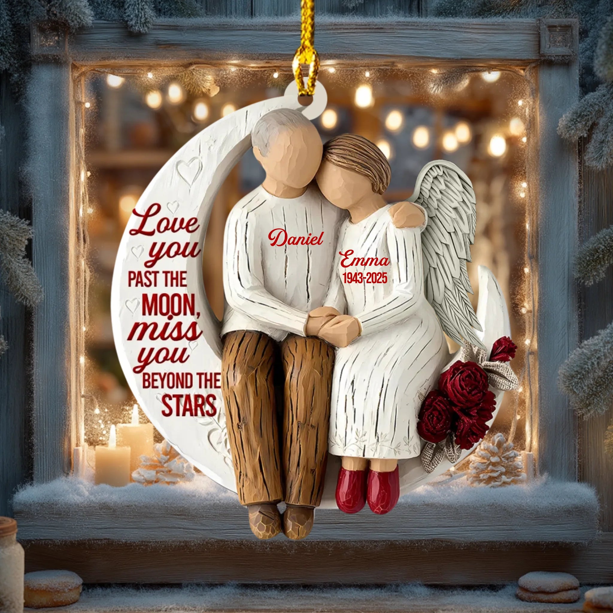 Ehren Sie die ewige Liebe mit diesem personalisierten Gedenkornament für Ehemann und Ehefrau mit Engelsflügeln, einem herzlichen Andenken, das die Verbindung feiert, die Zeit und Raum überdauert. Mit einem liebevollen Paar, das zusammensitzt, unter der Botschaft „Ich liebe dich über den Mond hinaus, vermisse dich über die Sterne hinaus“, symbolisiert dieses Ornament auf wunderschöne Weise ewige Liebe und Erinnerung.