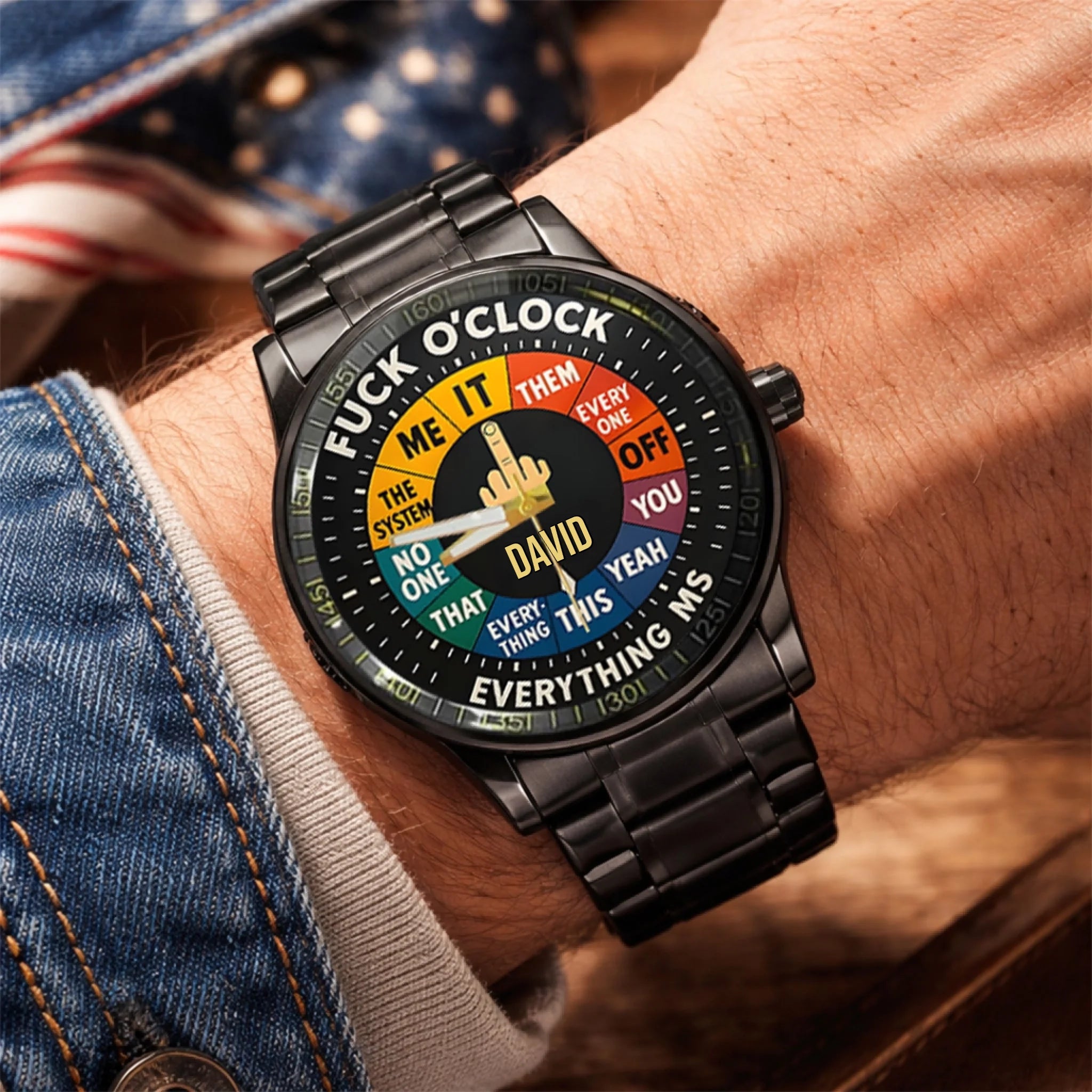 The playful “F*ck O’Clock” style dial combines humor with rugged personality, making it perfect for hunters, outdoorsmen, or anyone who enjoys a witty statement piece. The colorful segmented design adds visual interest while the custom name at the center gives the watch a personal touch.