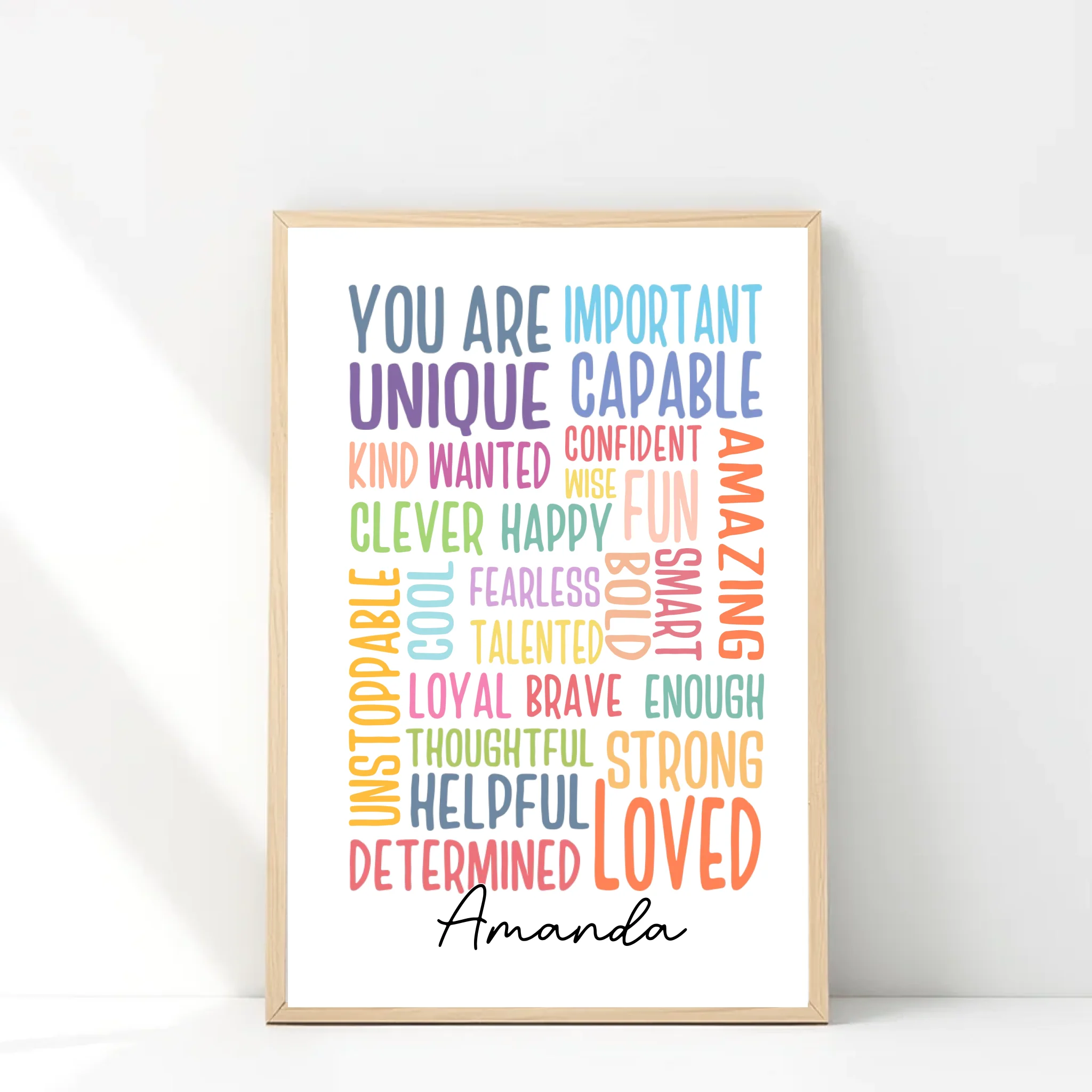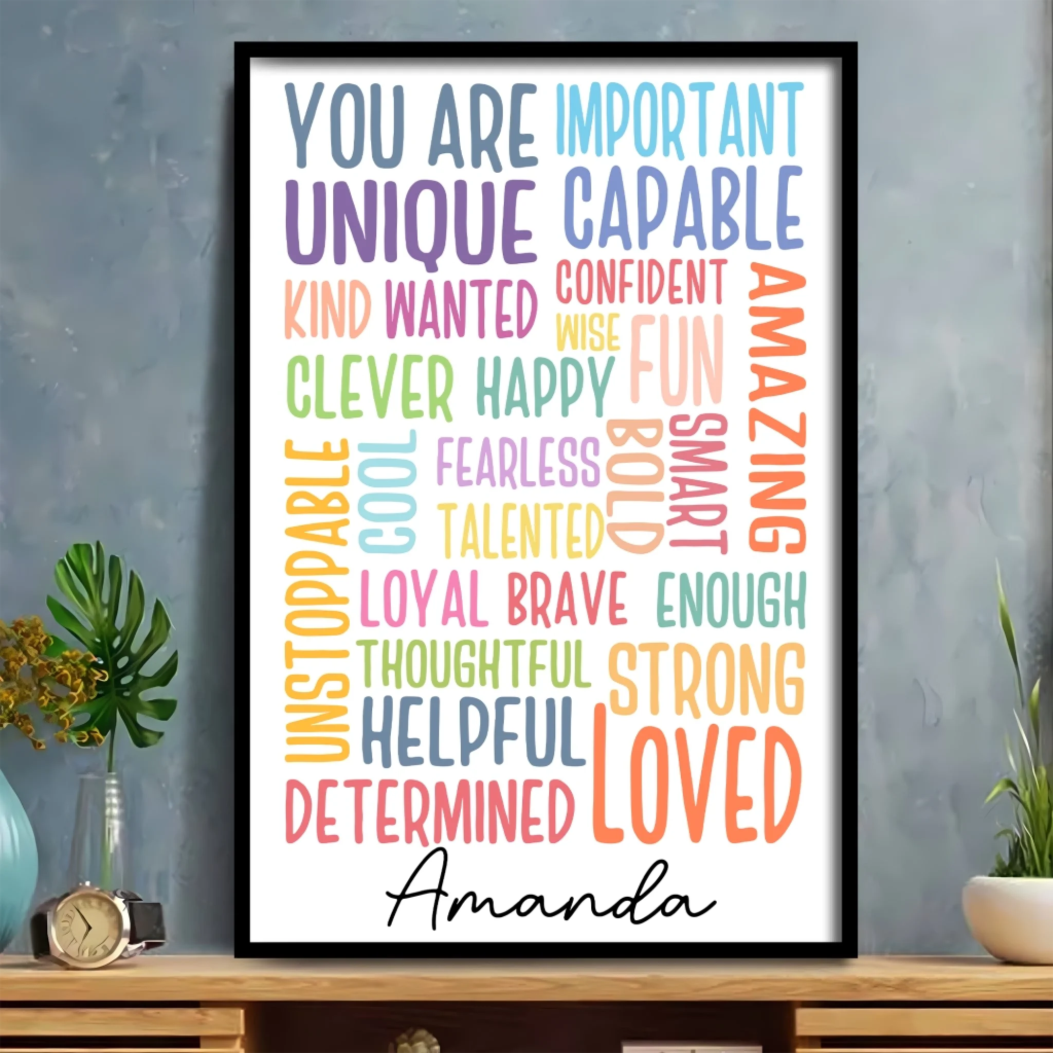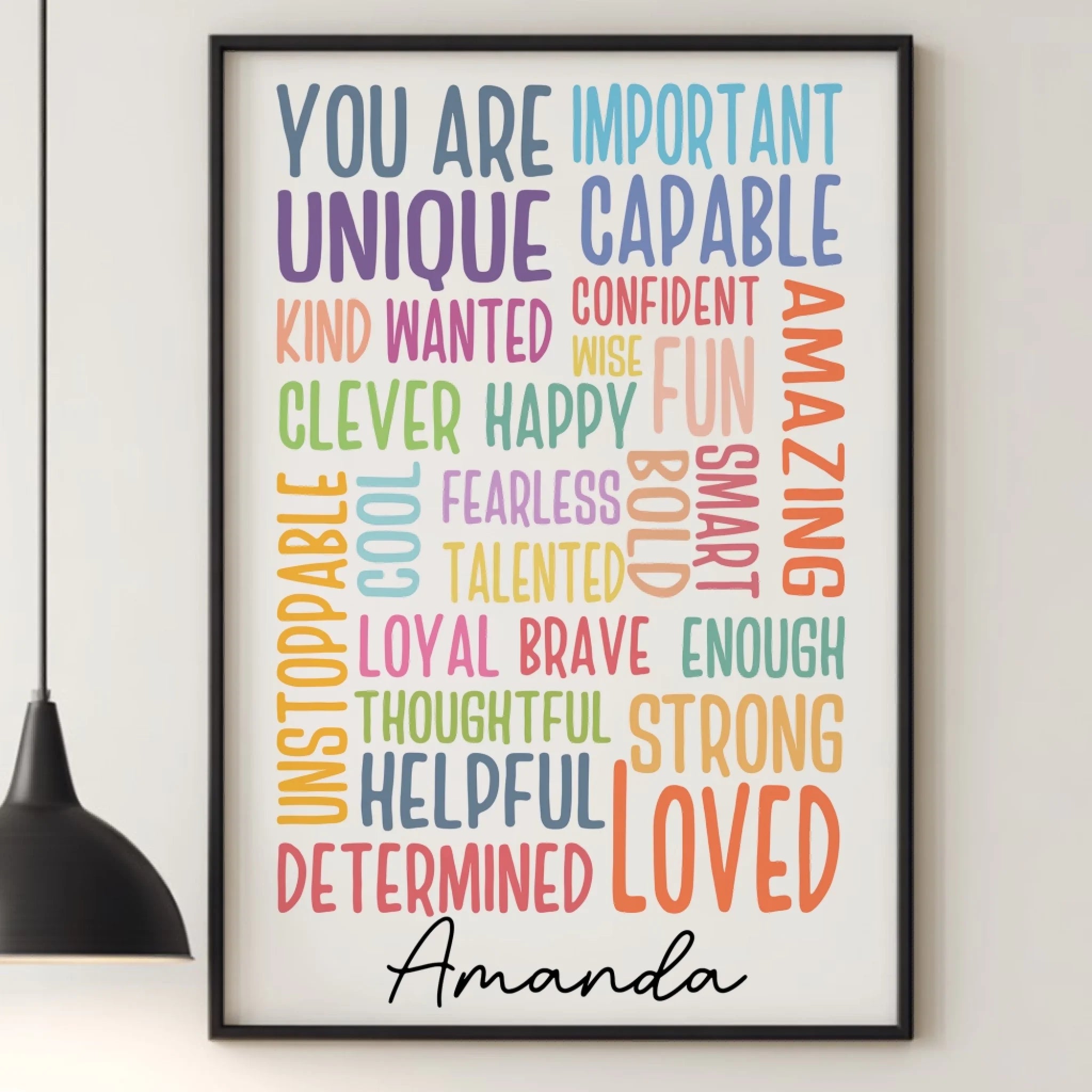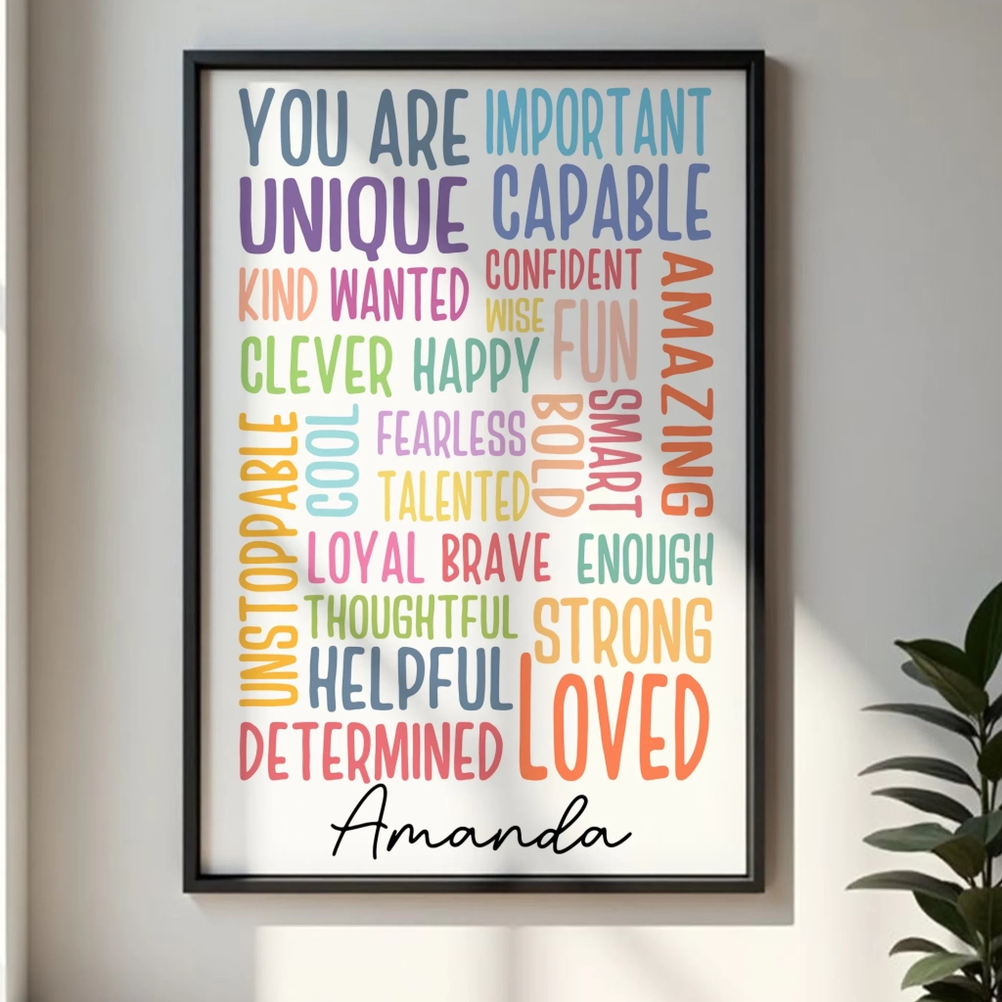 Brighten up your walls with our Personalized Motivational Poster, designed to inspire and uplift every day. Featuring a colorful word collage of empowering affirmations like Loved, Strong, Brave, Unique, Amazing, and more, this poster is a daily reminder that you (or your loved one) truly matter. Add your own name for a custom touch that makes it even more special.