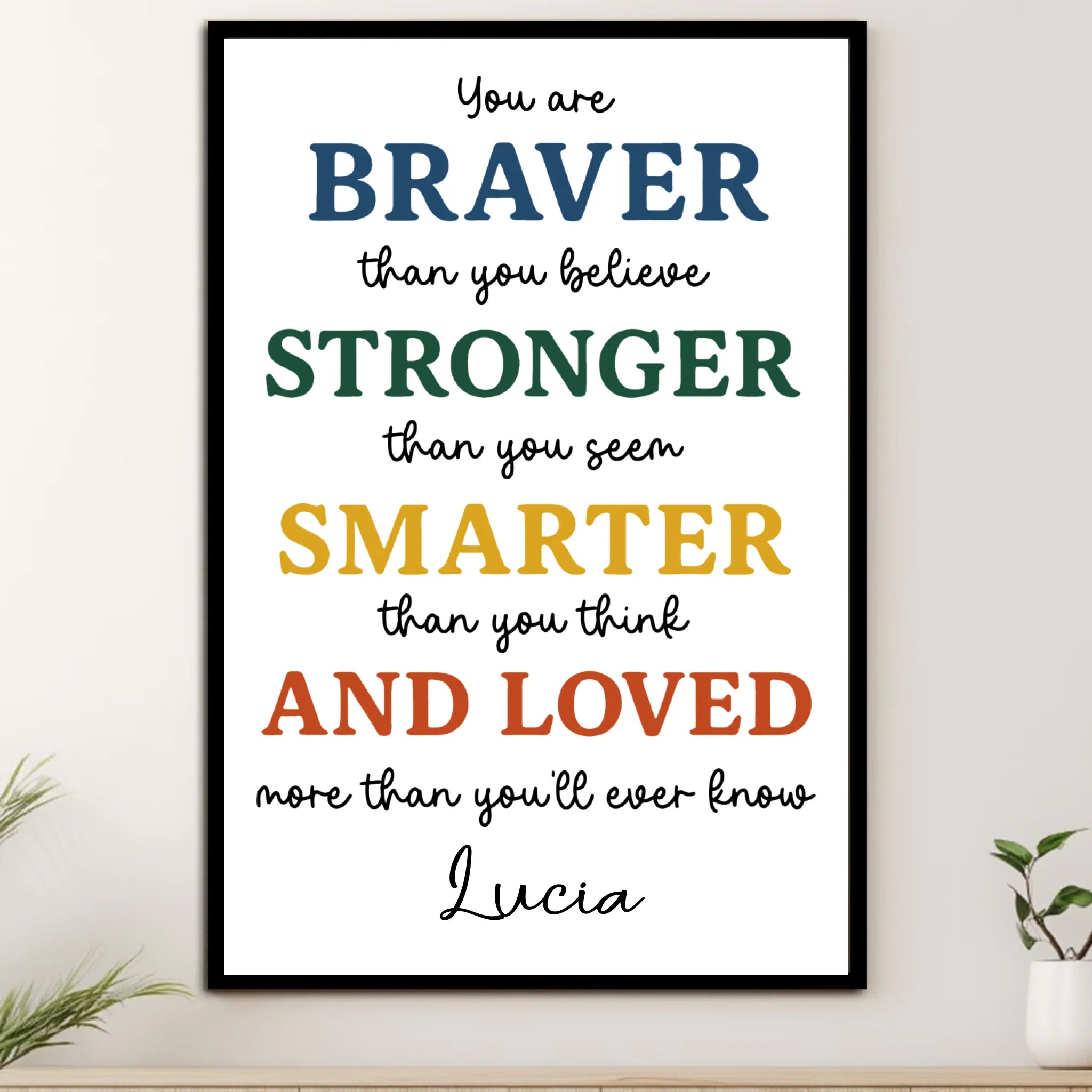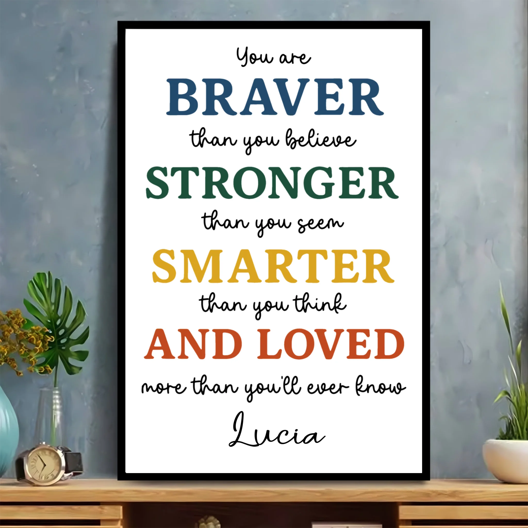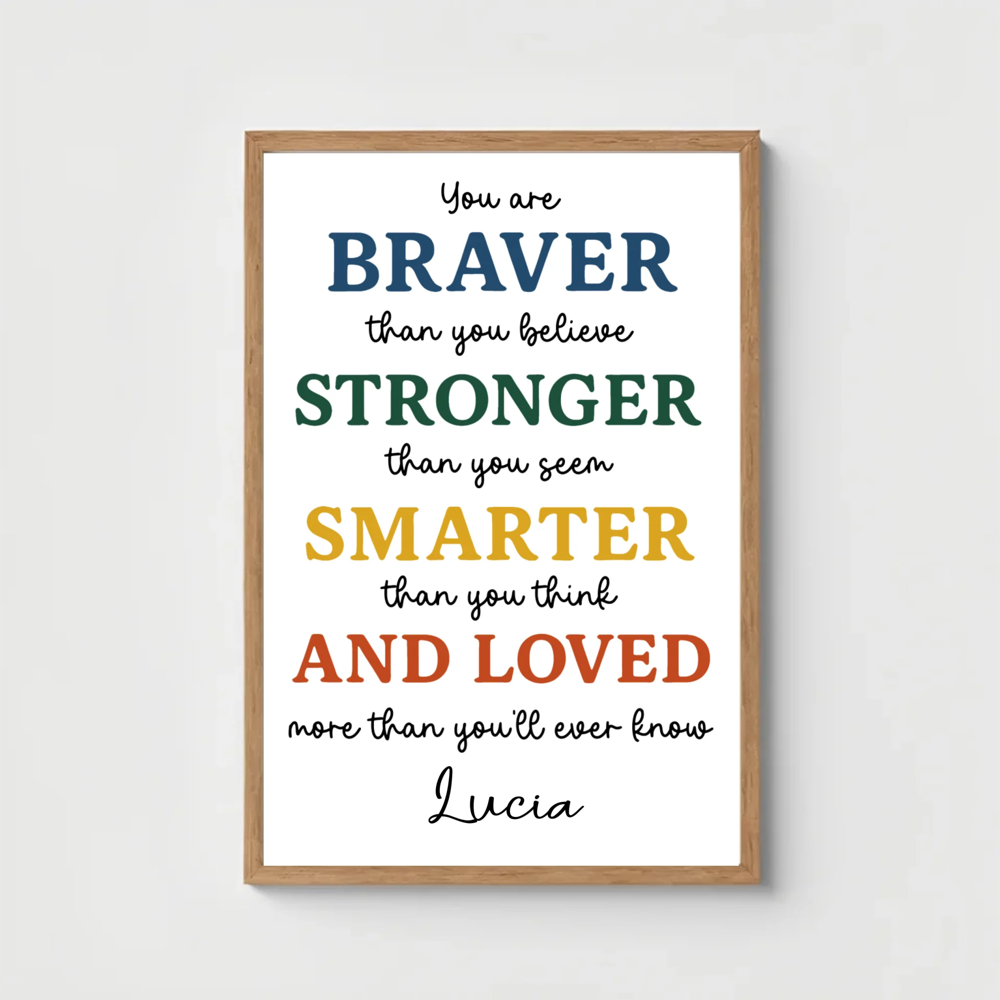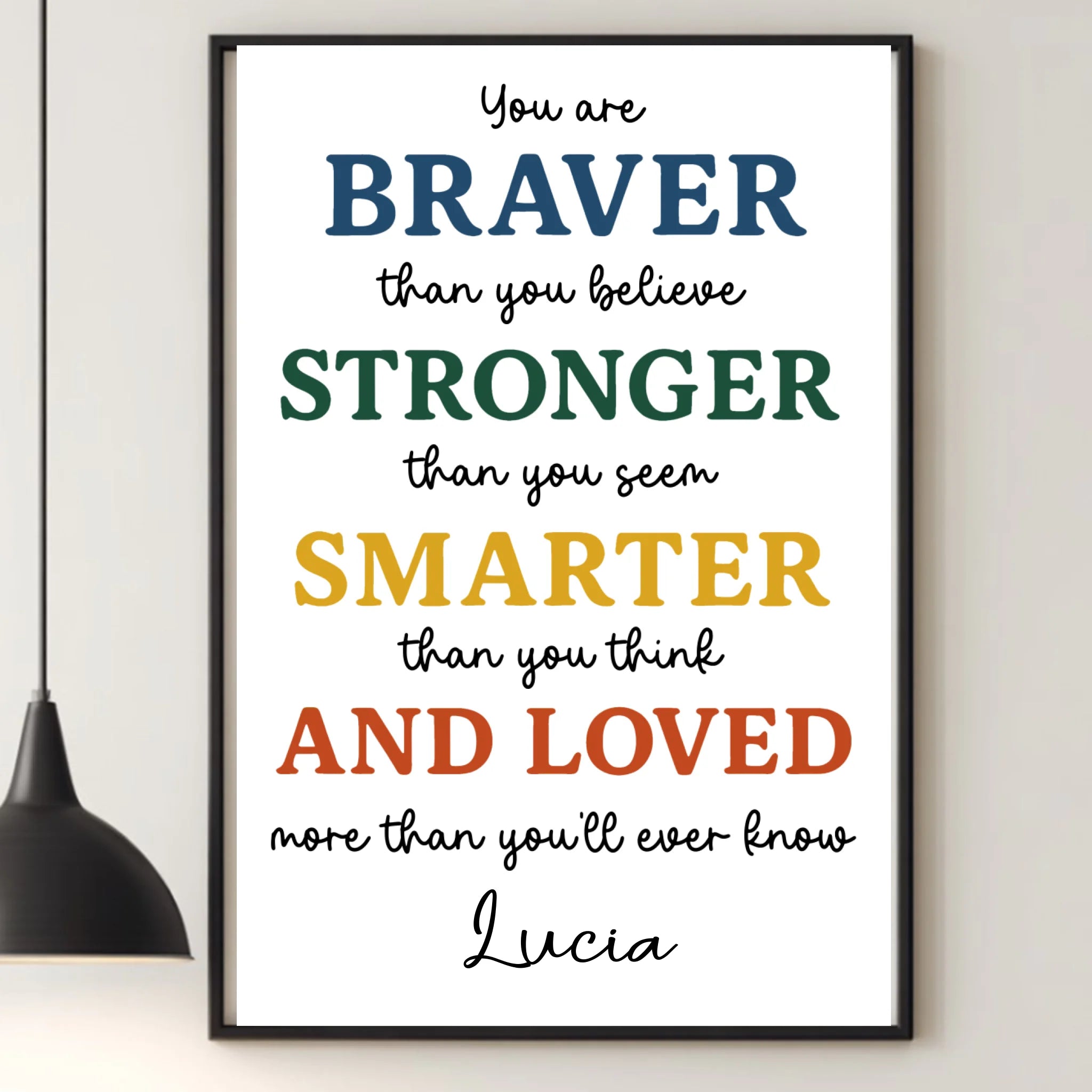 Poster Cita Motivasi yang Dipersonalisasi – “Kamu Lebih Berani dari yang Kamu Kira” Poster Kustom, Hadiah Inspiratif untuk Anak, Remaja & Orang Tersayang