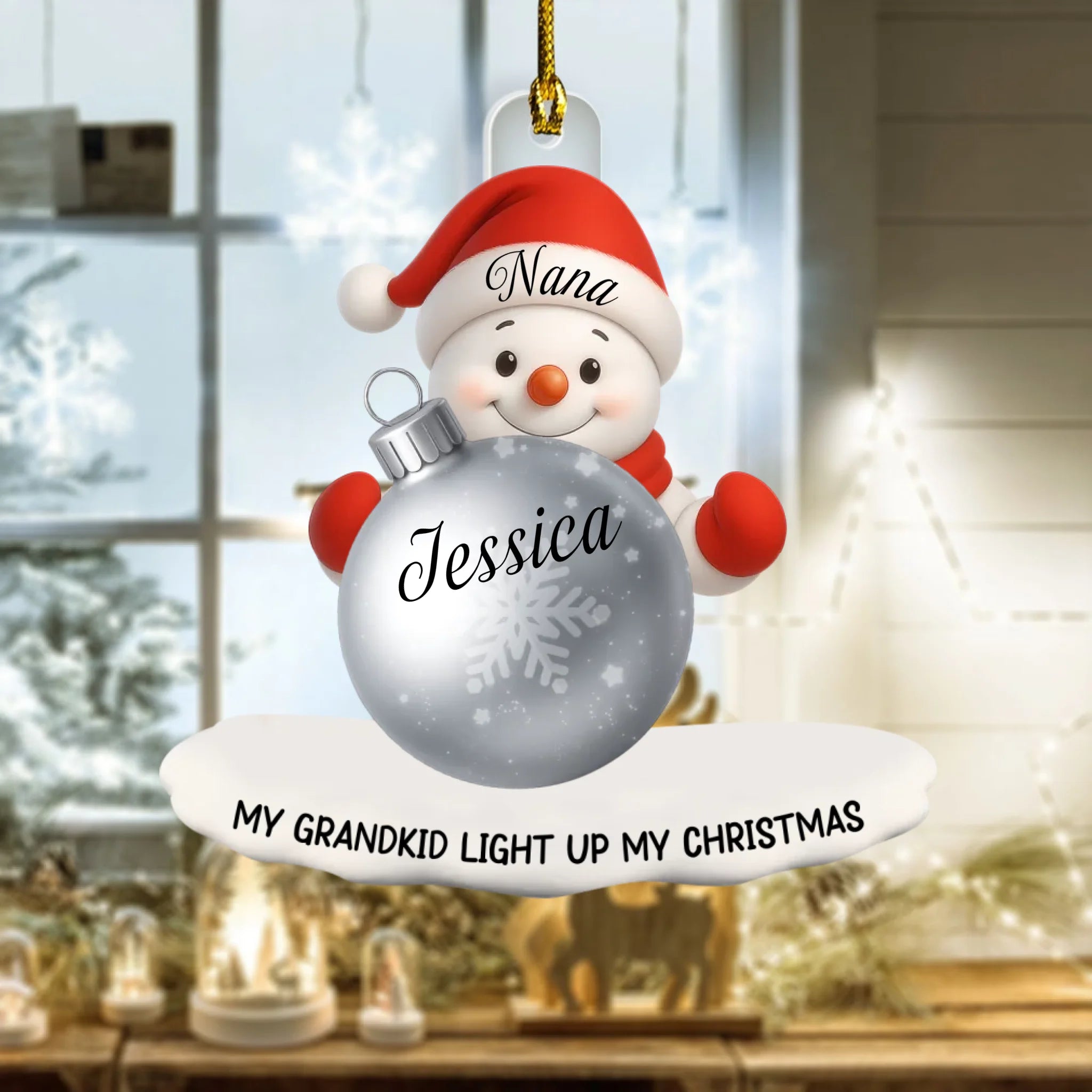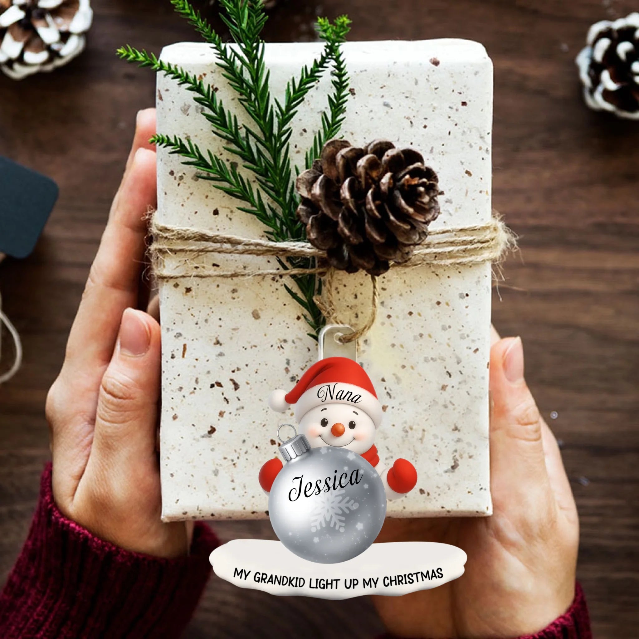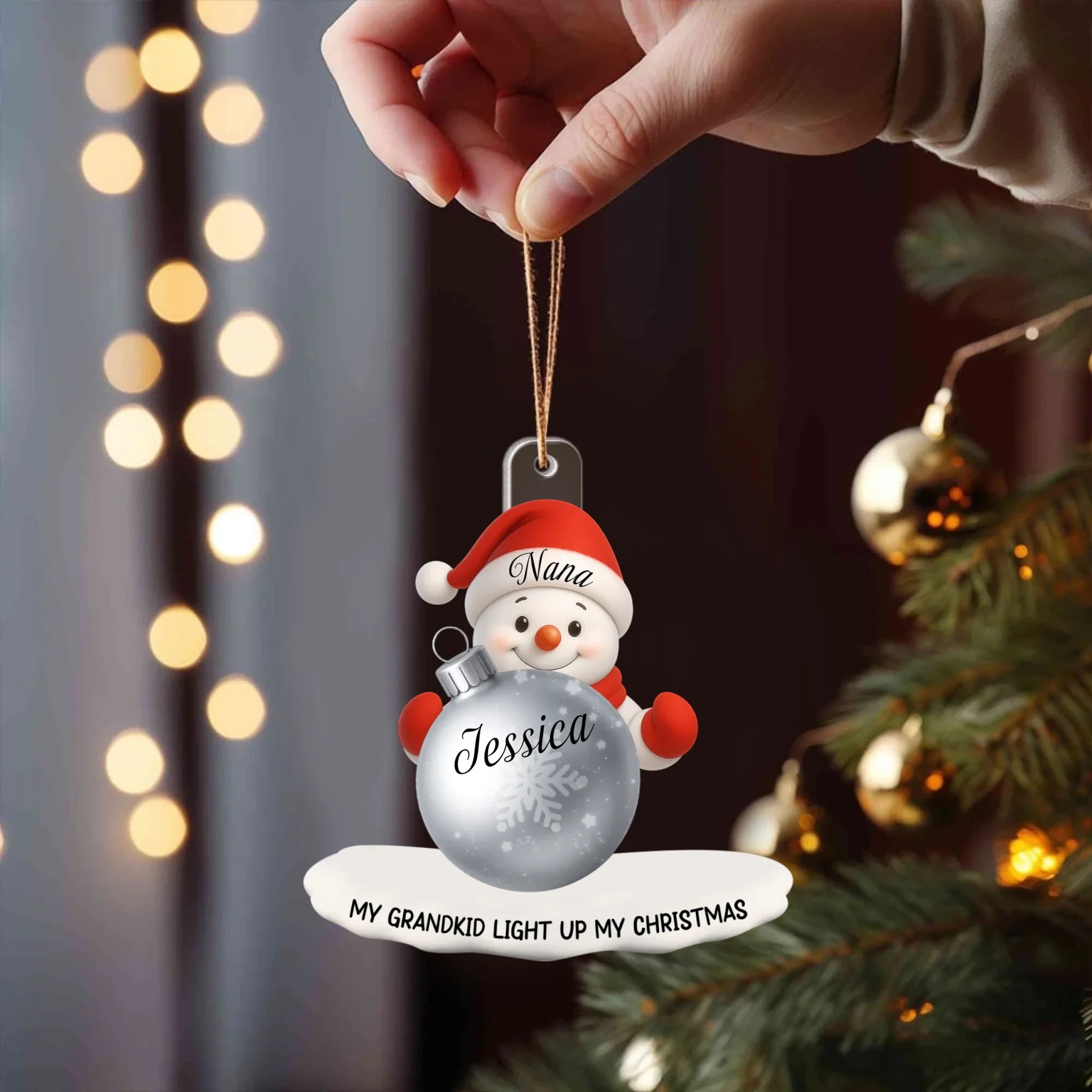 Personalisierter Schneemann-Oma-Anhänger – Individuelle Namens-Weihnachtsdeko für Nana, Mama oder Oma | „Mein Enkelkind erhellt mein Weihnachten“ Acryl-Geschenk