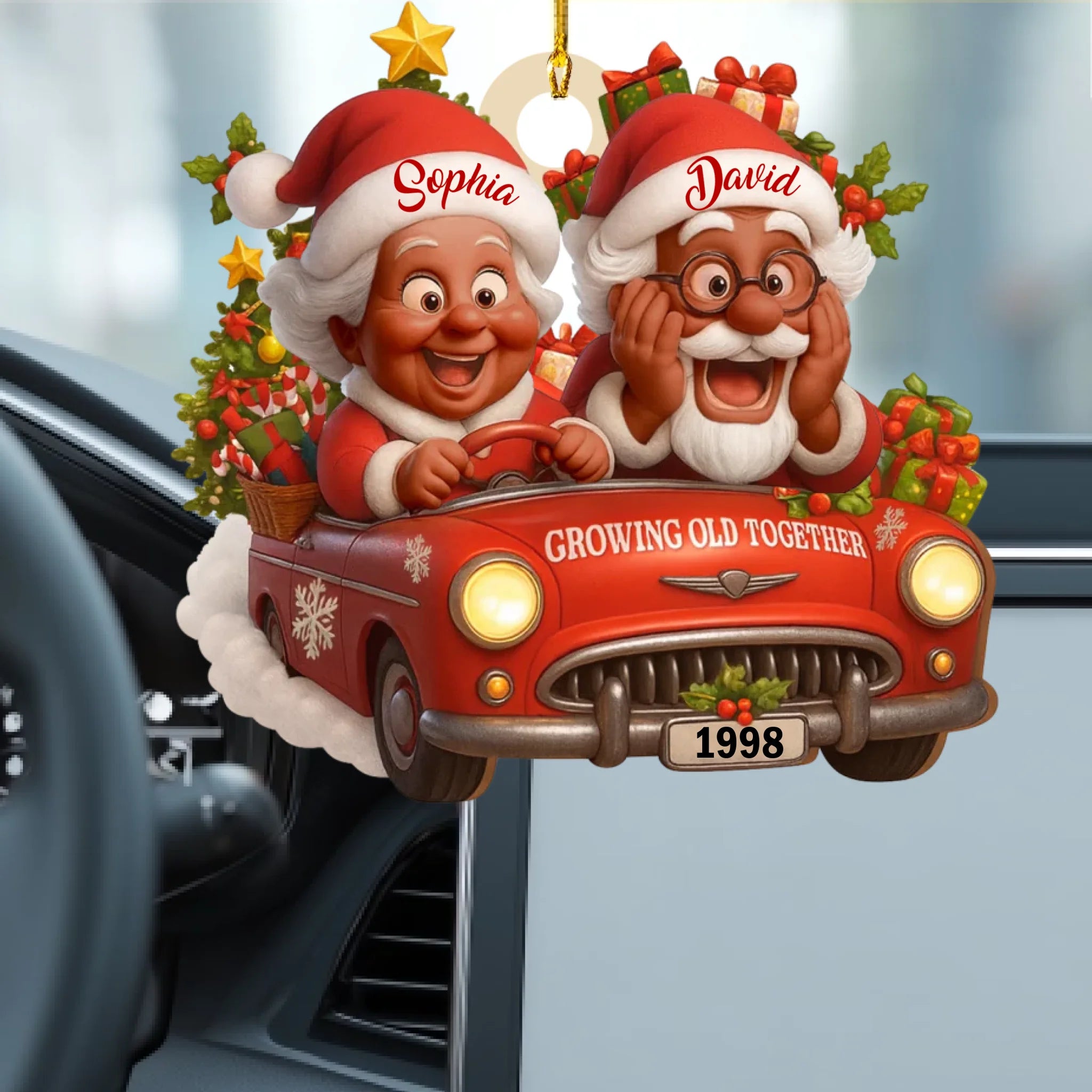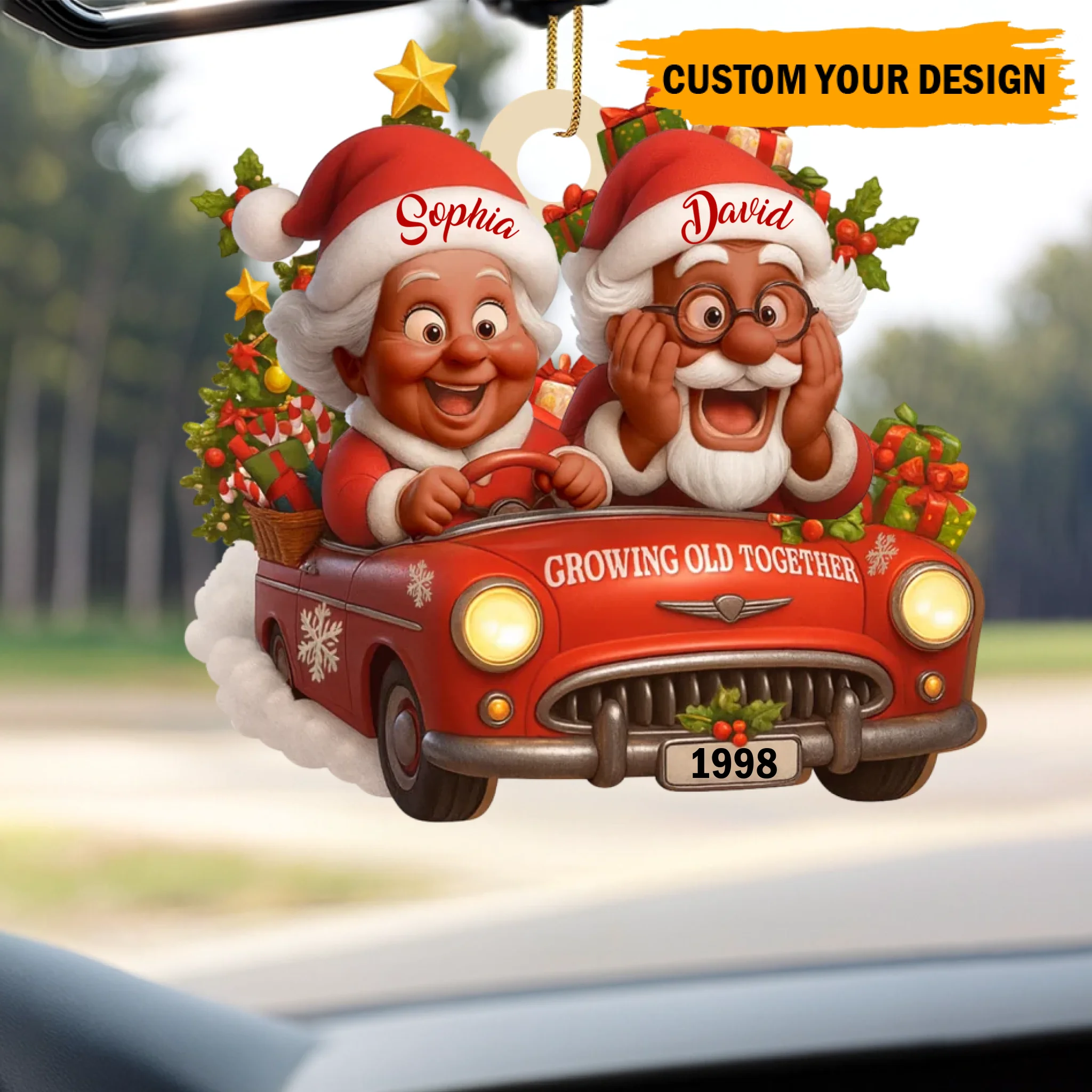 Mit einem fröhlichen älteren Paar in festlichen Weihnachtsmann-Outfits, das gemeinsam in einem roten Weihnachtsauto fährt, auf dem steht „Gemeinsam alt werden“, diese herzerwärmende Gestaltung vermittelt die Freude, Seite an Seite mit Ihrer Seelenverwandten zu altern.