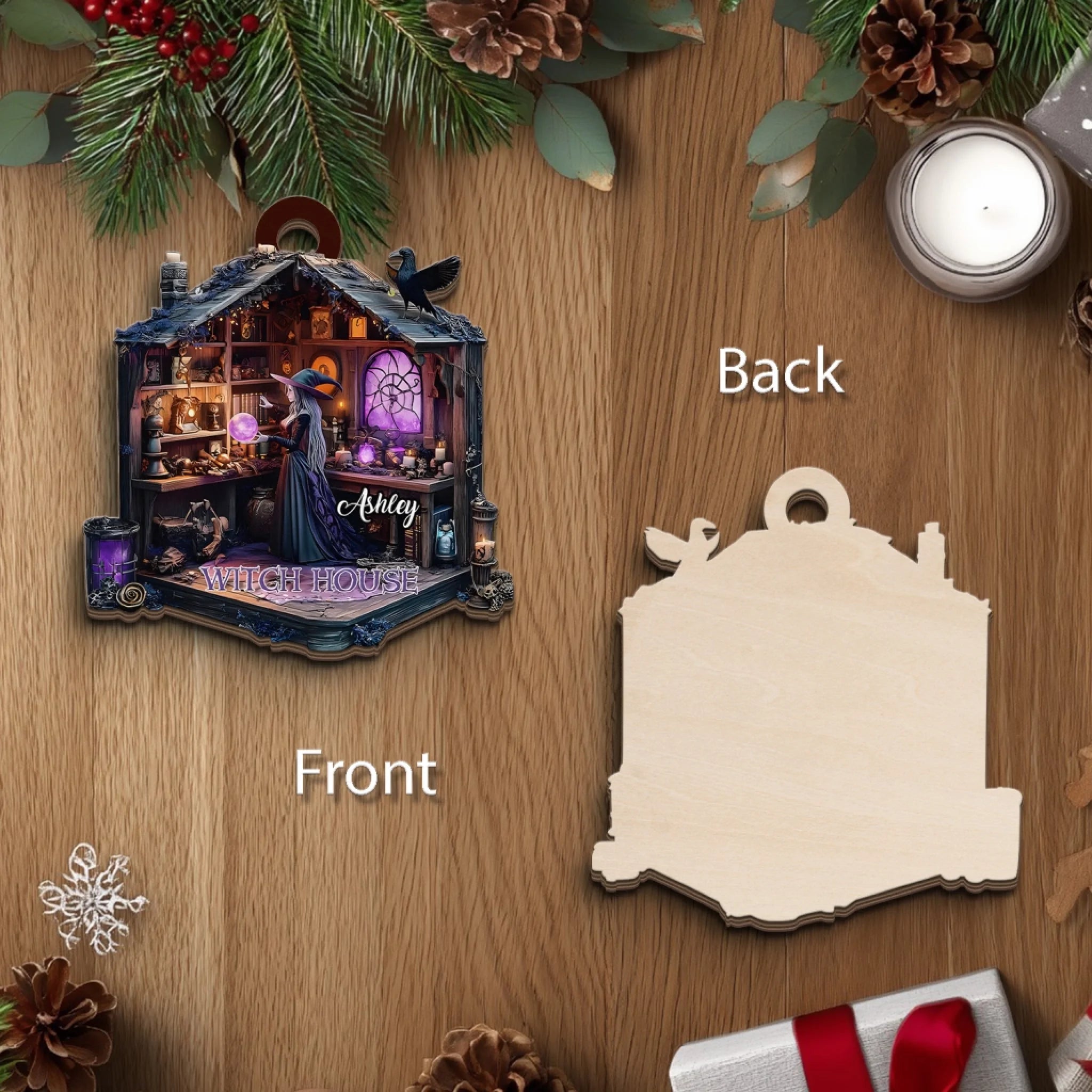 Tauchen Sie ein in die Welt der Magie und Geheimnisse mit unserem personalisierten Hexenhaus-Holzornament – ein atemberaubendes Stück, das die bezaubernde Atmosphäre eines Hexenverstecks einfängt.