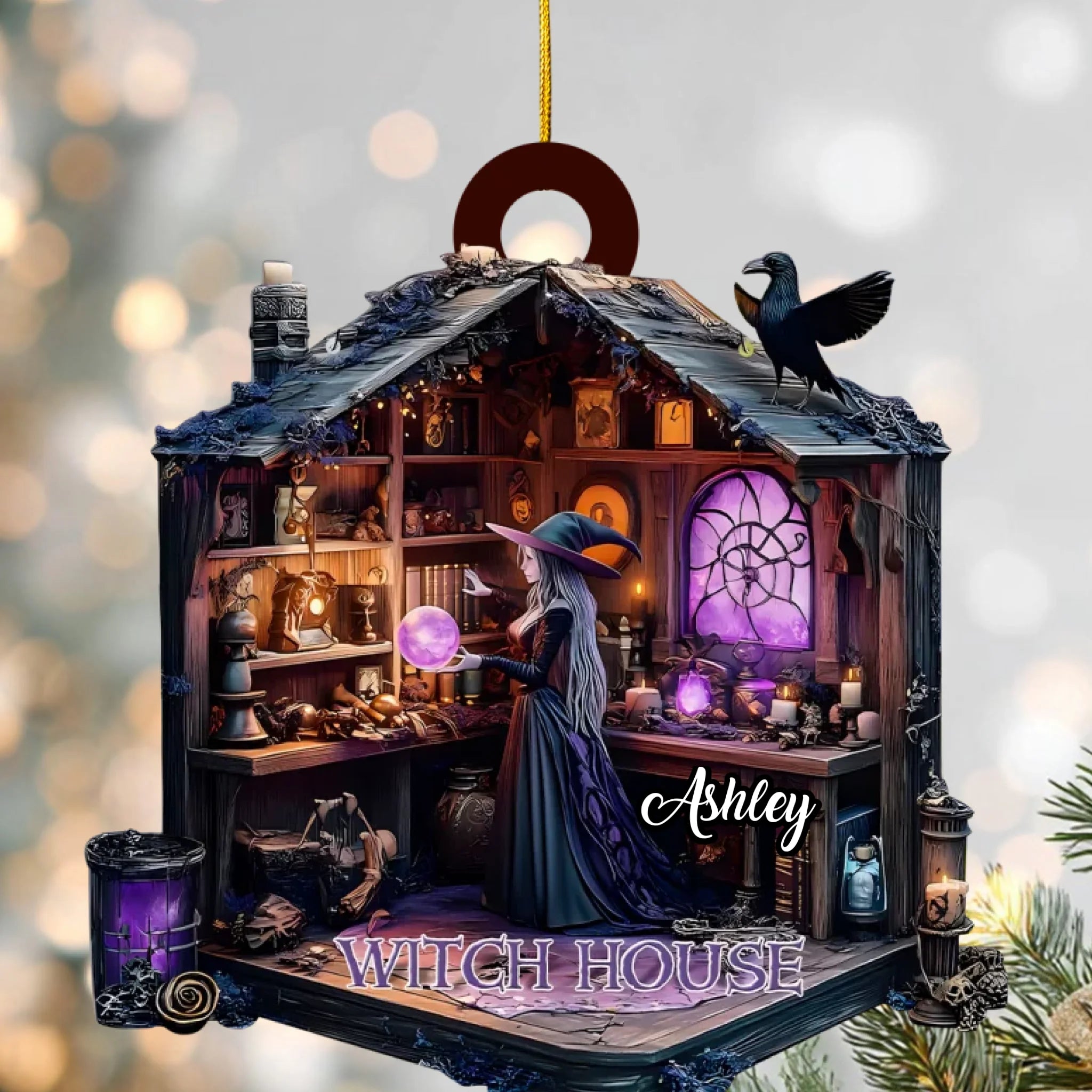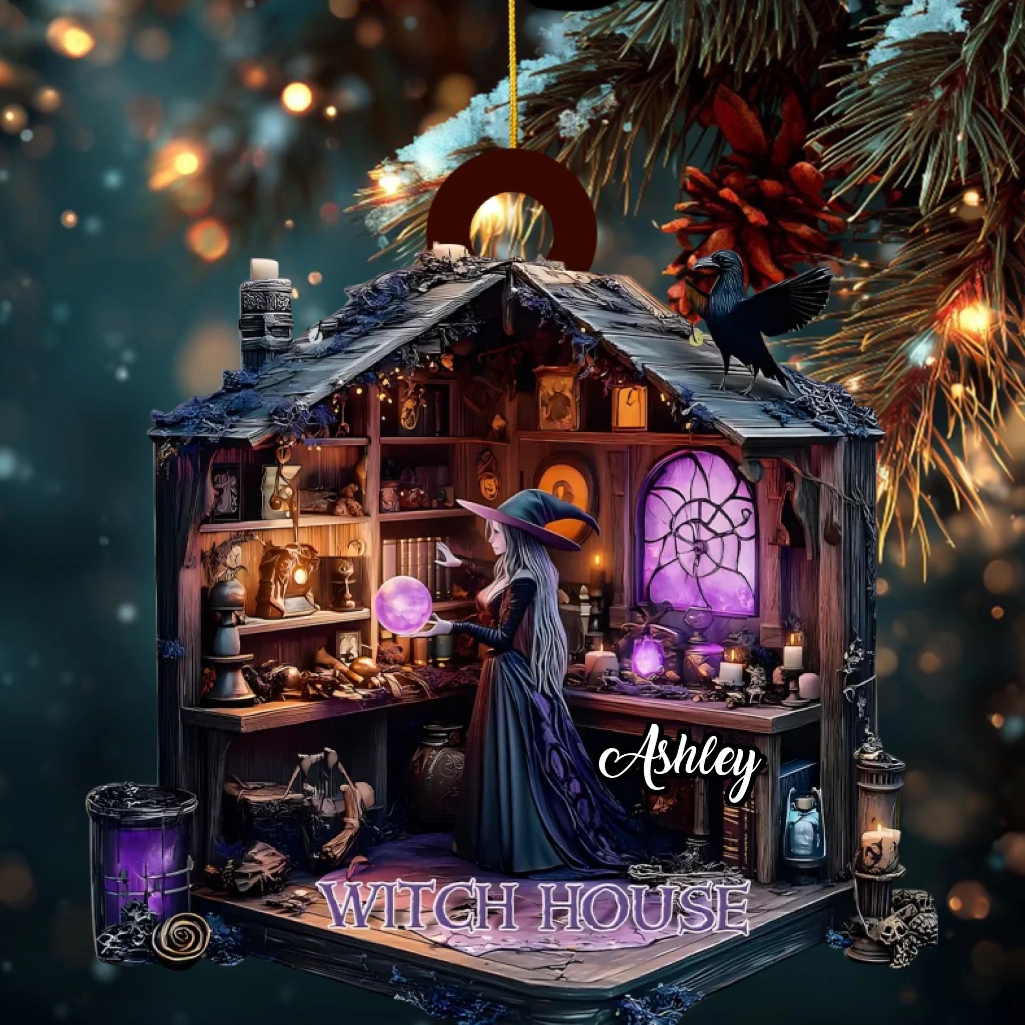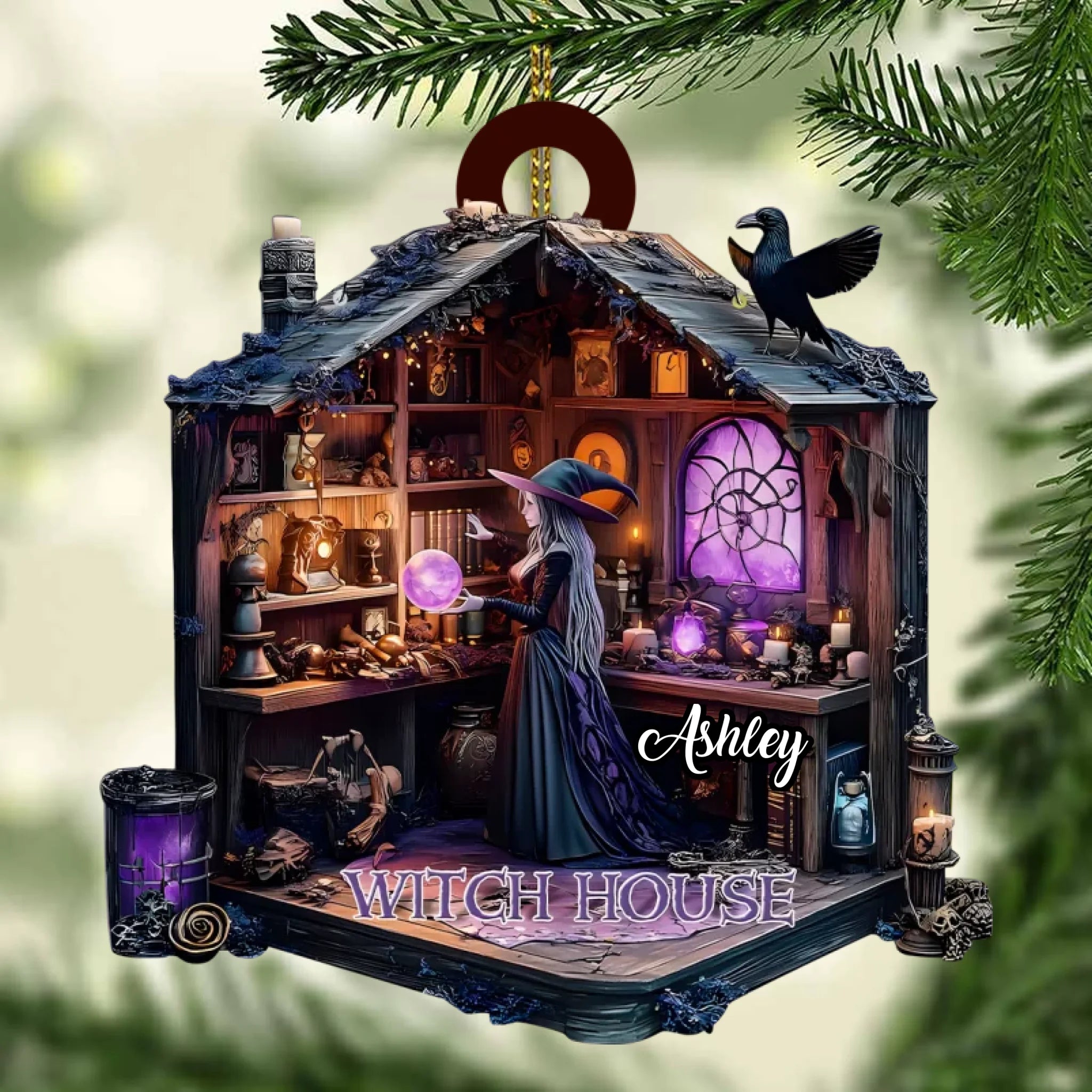 Wunderschön gestaltet mit aufwendigen Details – von leuchtenden Zaubertränken und Zauberbüchern bis hin zu flackernden Kerzen und einem neugierigen Raben – ist dieses Ornament die perfekte Ergänzung für Ihre Halloween-Dekoration, Ihren Weihnachtsbaum oder Ihre Hexenecke.