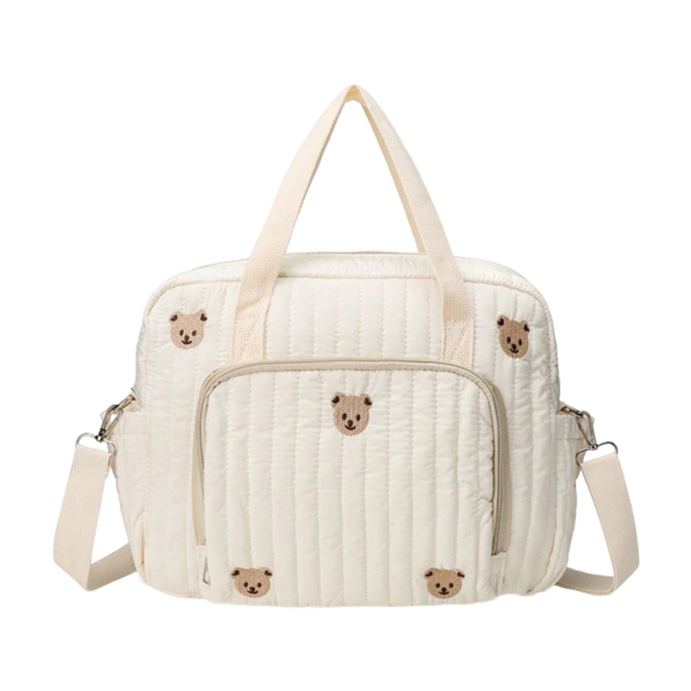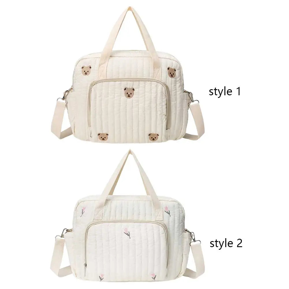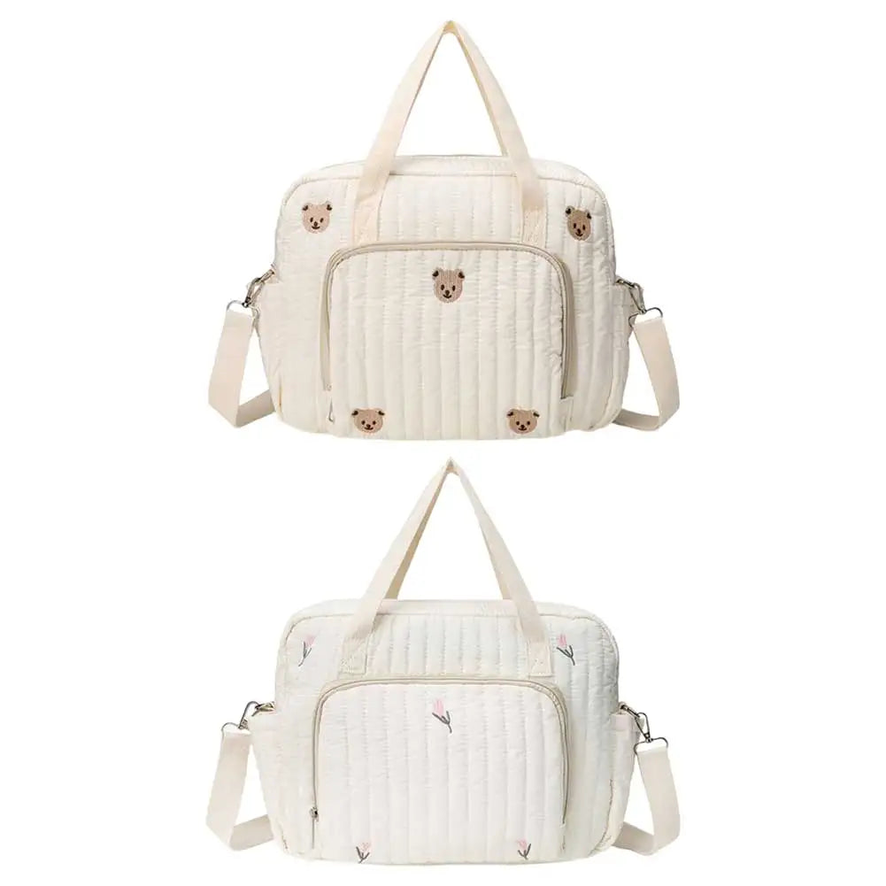 Quilted Cotton Baby Nappy Bag, Multifunctional Travel Diaper Tote with Adjustable Strap, Spacious Messenger Crossbody Maternity Bag (Bear/Tulip Embroidery)