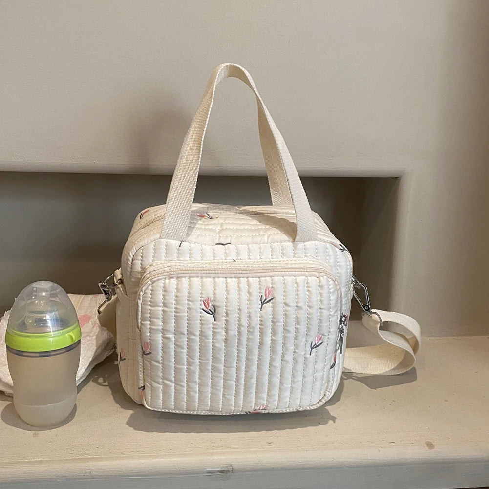 This charming quilted mommy bag is crafted from high-quality premium cotton fabric, offering a luxurious, soft, and comfortable texture. Its practical, spacious design and beautiful embroidery make it a reliable and stylish choice for busy parents, effortlessly blending utility with modern aesthetics.