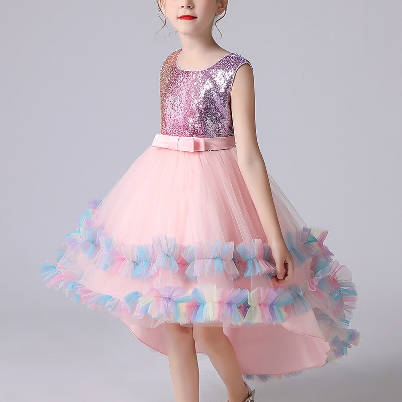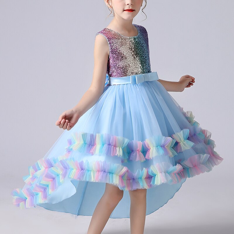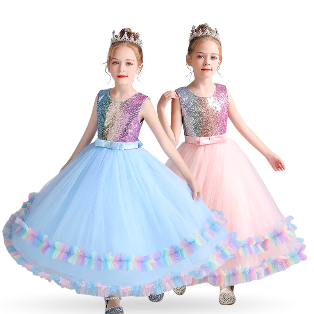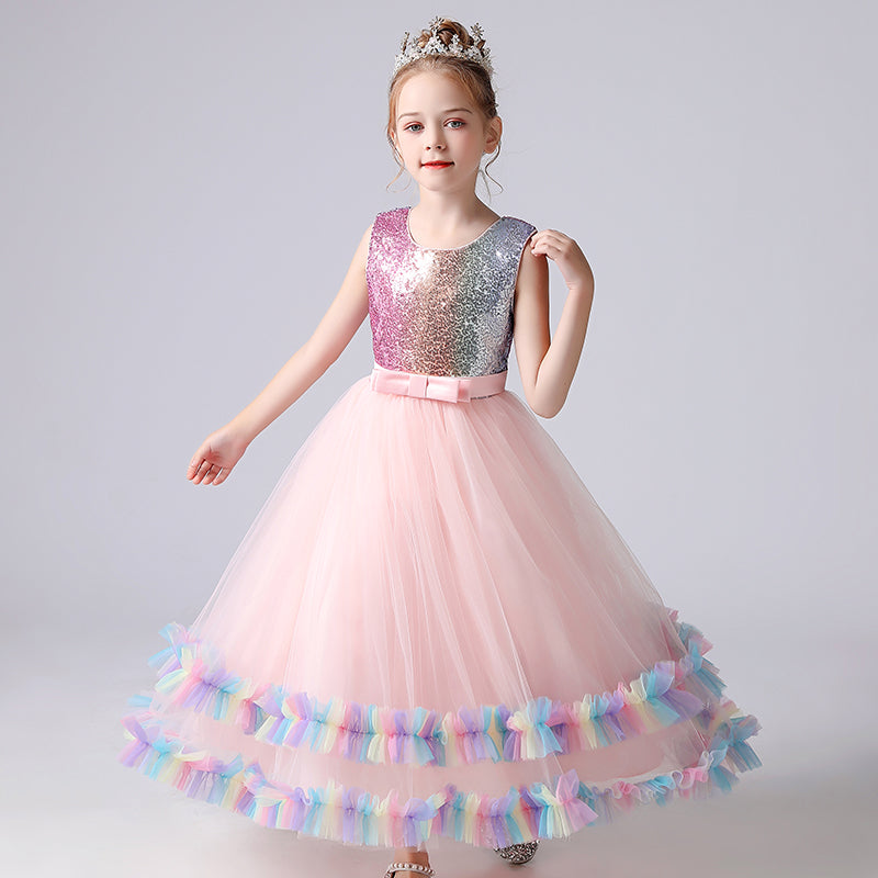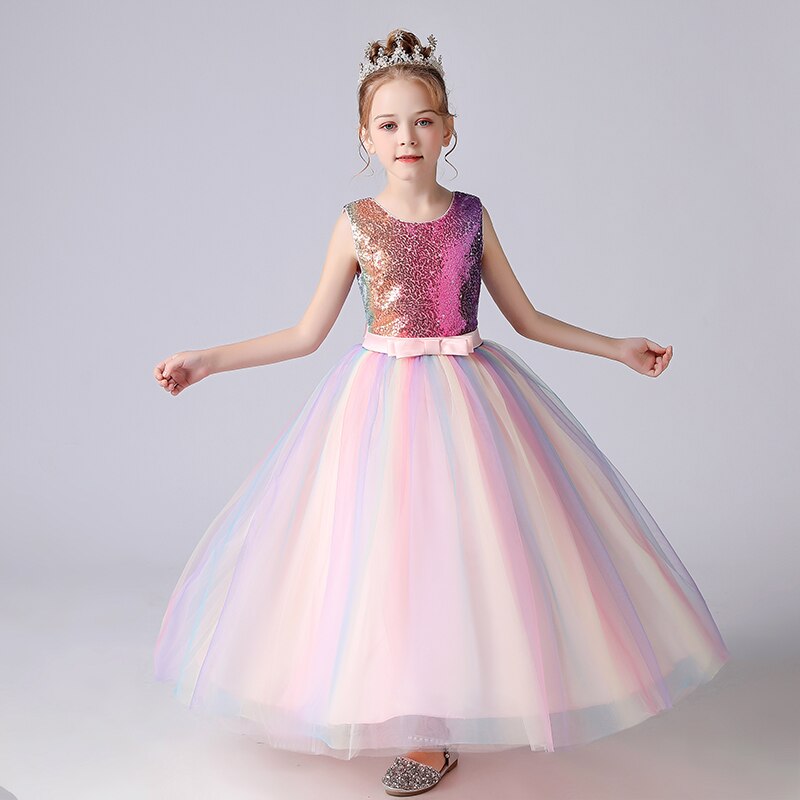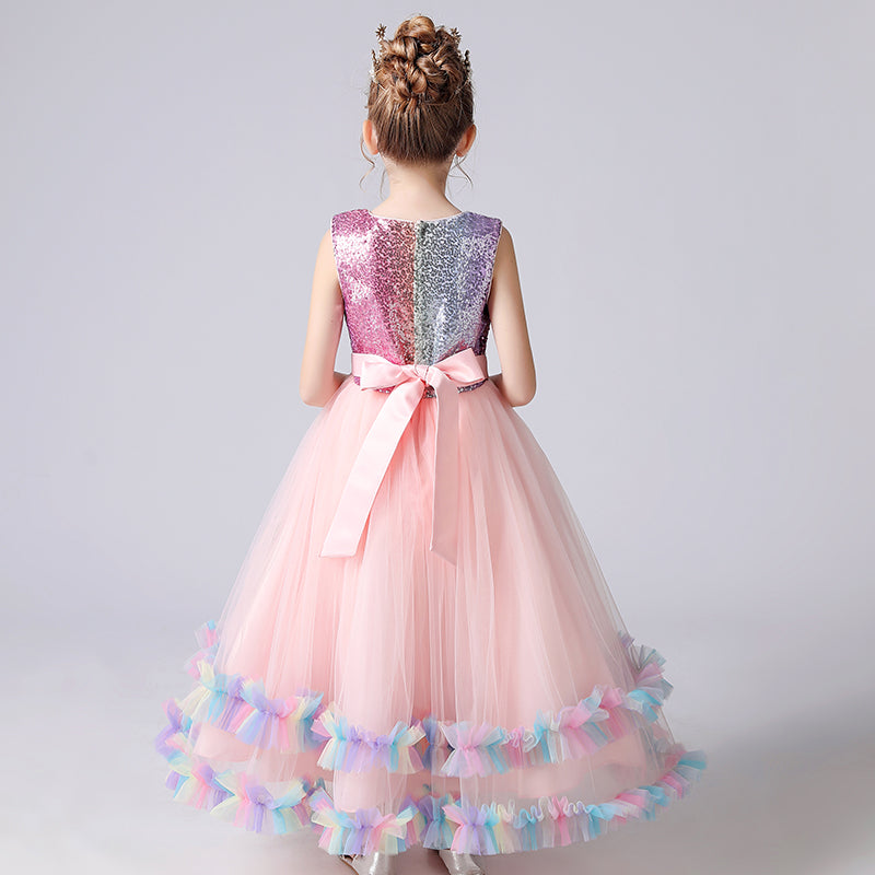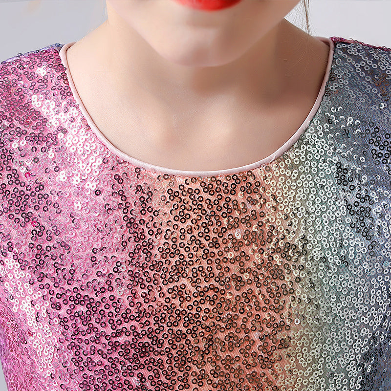 Dieses Partykleid mit Regenbogen-Pailletten-Oberteil wird an Ihrem kleinen Mädchen garantiert zauberhaft und traumhaft aussehen. Jedes Detail ist perfektioniert, um den königlichen und eleganten Look zu erzielen, den sich jedes Mädchen wünscht.