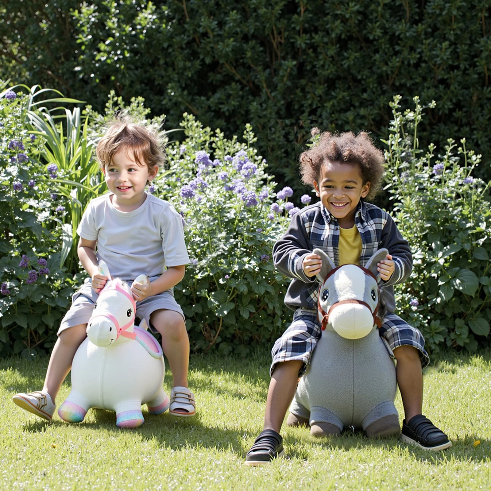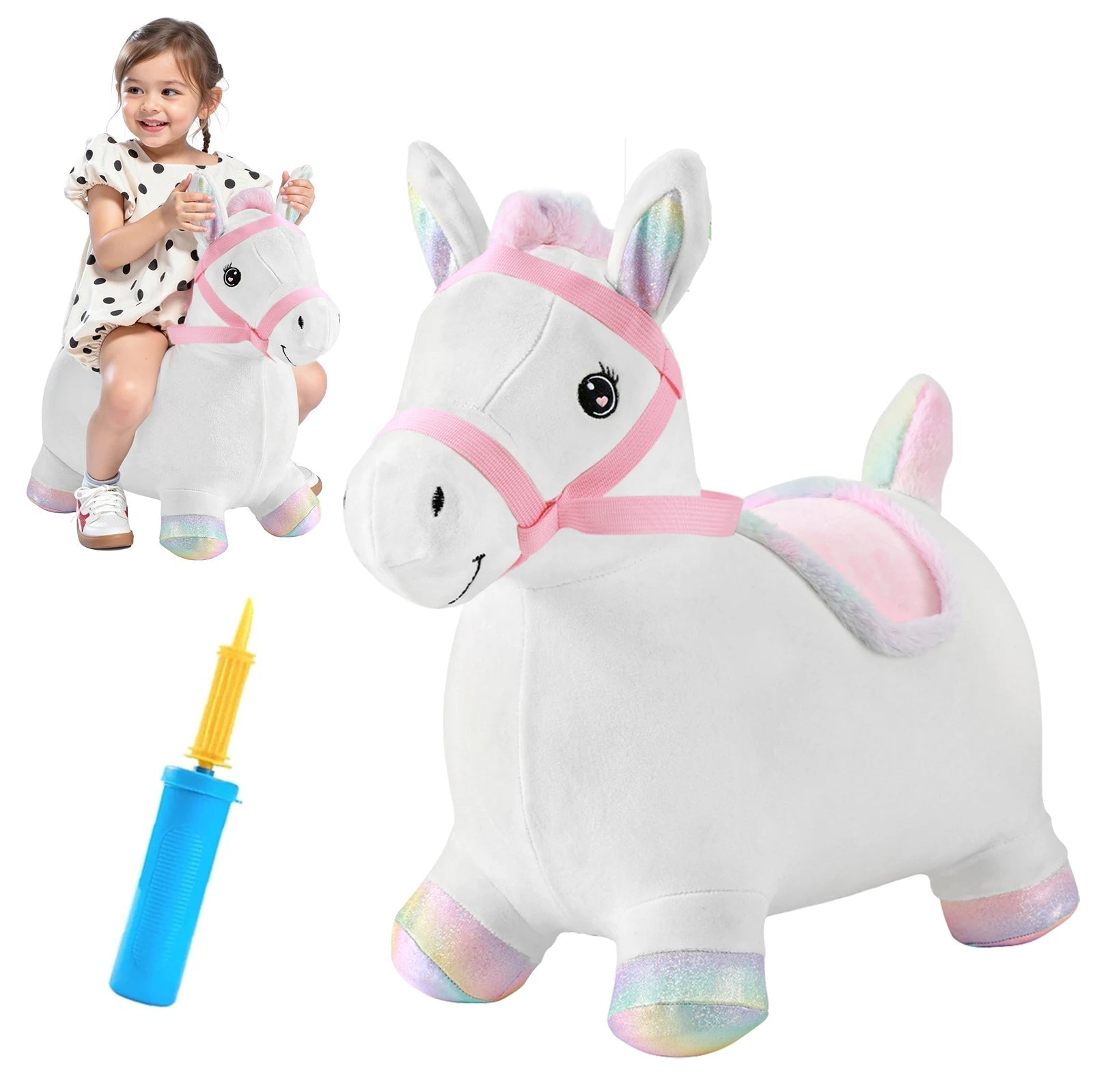 Charming Design: Features an adorable horse/unicorn design (available in Gray and White/Rainbow), with easy-to-grip ears or handles for stability while bouncing.