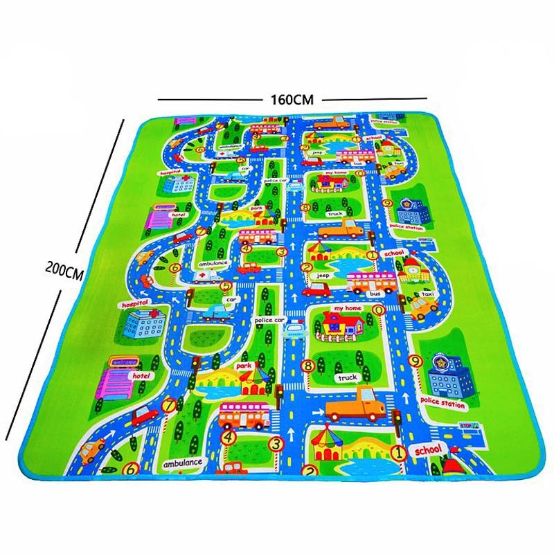 Die Oberfläche des Teppichs ist mit lebendigen und grafischen Straßenzügen bedruckt. Dies fördert sofort die kreative und fantasievolle Seite der Kinder. Es hilft, die motorischen Fähigkeiten zu verbessern und die Hand-Augen-Koordination zu fördern, wenn Kinder mit verschiedenen Fahrzeugen spielen. Es unterstützt sie beim Zahlenlernen und beim Erkennen von Orten, die sich auf Straßen befinden.