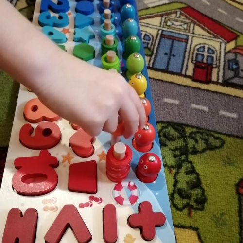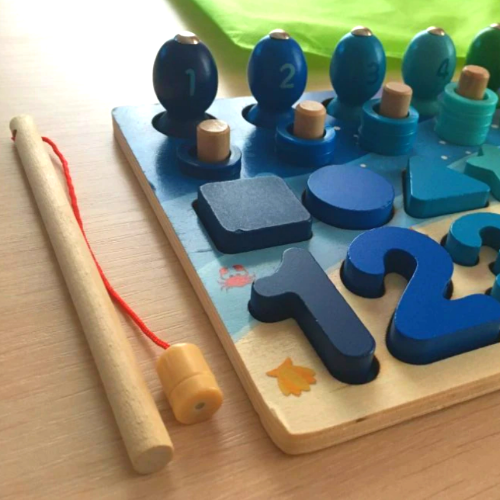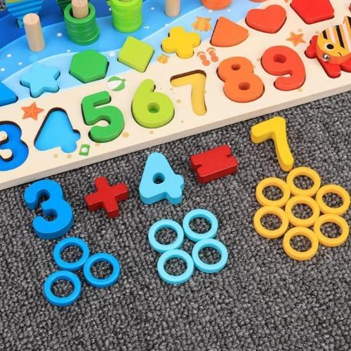 - Holzbrett mit abnehmbaren 3D-Holz-Elementen bestehend aus Fischen in verschiedenen Farben, Zahlen, Formen und Ringen.