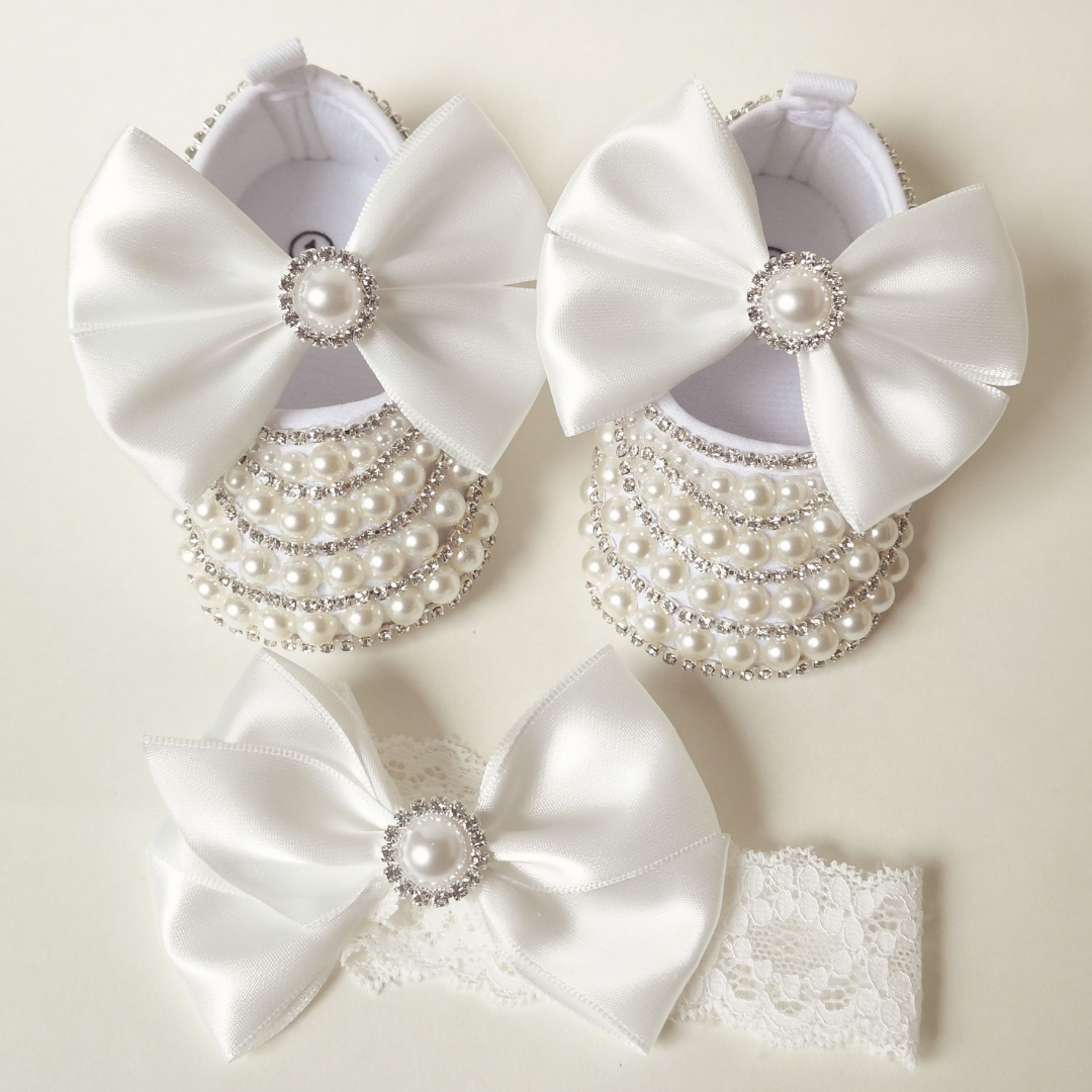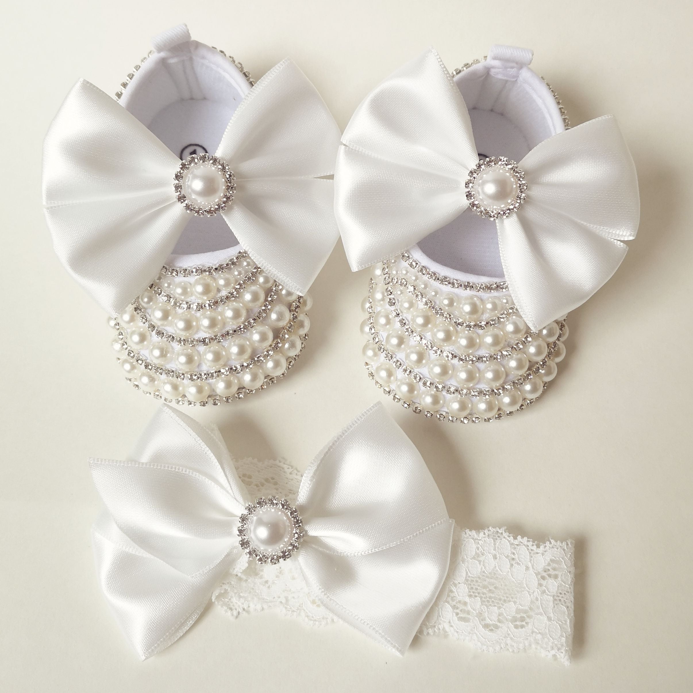 - Wunderschöne handgefertigte Babyschuhe mit Perlen und Strasssteinen.