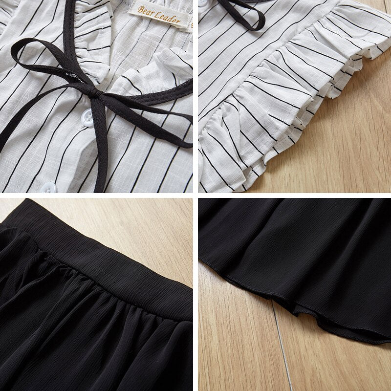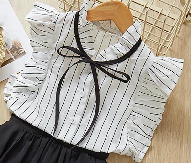 Gestreiftes, ärmelloses Outfit ist ein elegantes Kleidungsstück für Ihre lieben kleinen Mädchen. Es besteht aus weicher, atmungsaktiver und bequem zu tragender Baumwolle. Die Bluse ist ein schlichtes, schwarz-weiß gestreiftes Hemd mit Knöpfen. Der Halsausschnitt sowie die ärmellosen Armlöcher sind mit Rüschen versehen. Darüber hinaus ist der geraffte Halsausschnitt mit einem auffälligen schwarzen Band verziert, das zu einer Schleife gebunden ist. Der plissierte Rock ist schwarz und verleiht dem Outfit eine elegante Note. Das Outfit kann sowohl bei formellen als auch informellen gesellschaftlichen Anlässen getragen werden. Es ist ein perfektes Geschenk für kleine Mädchen.