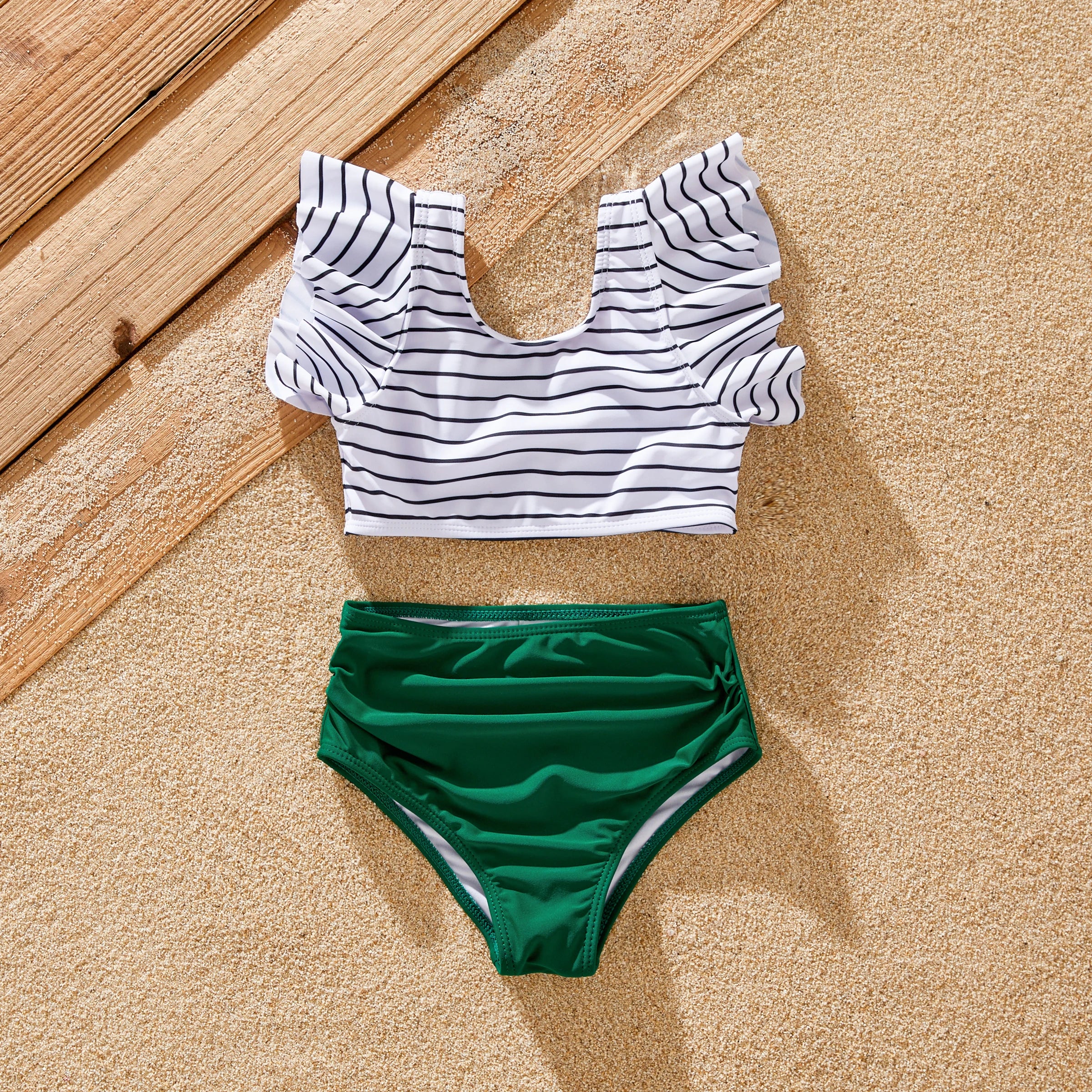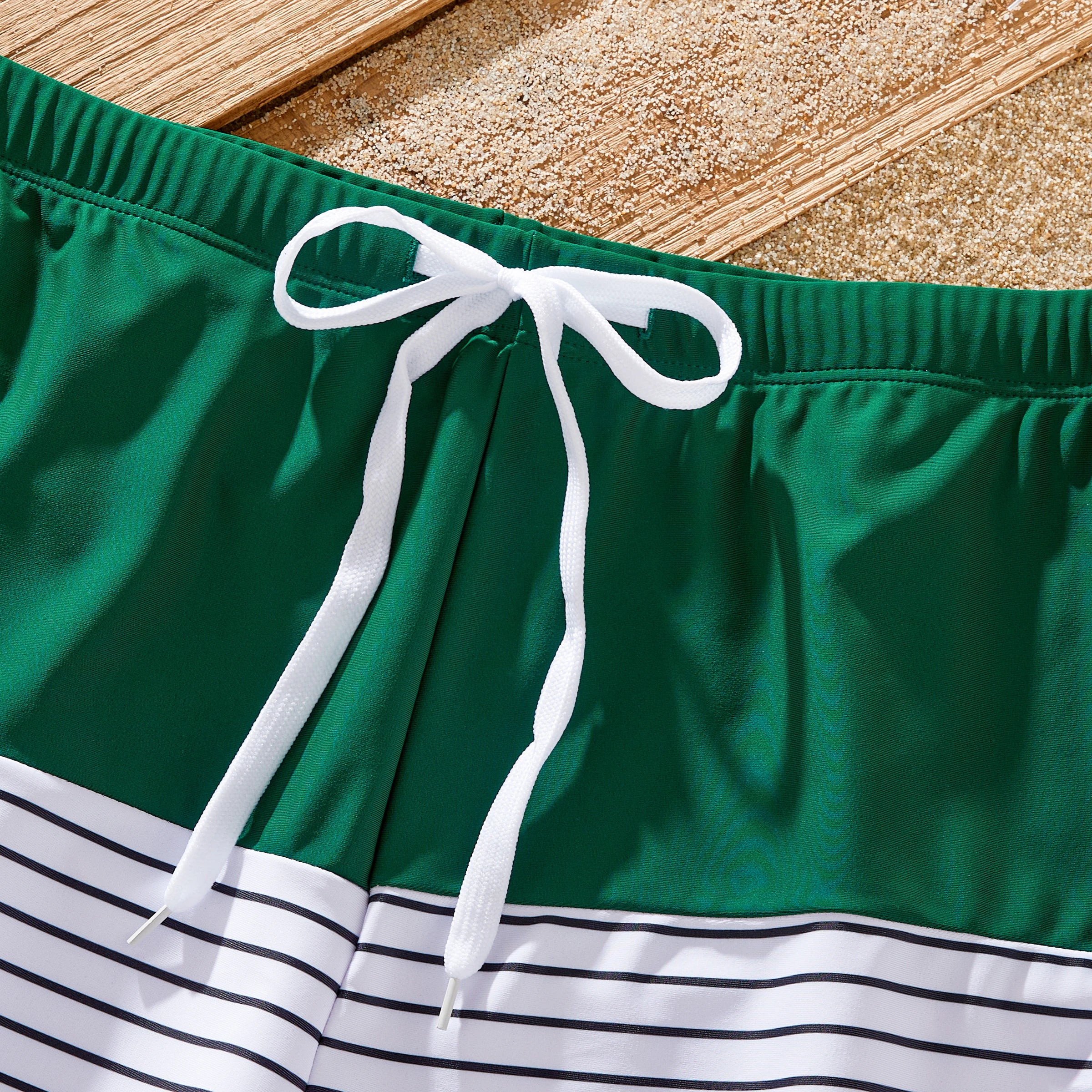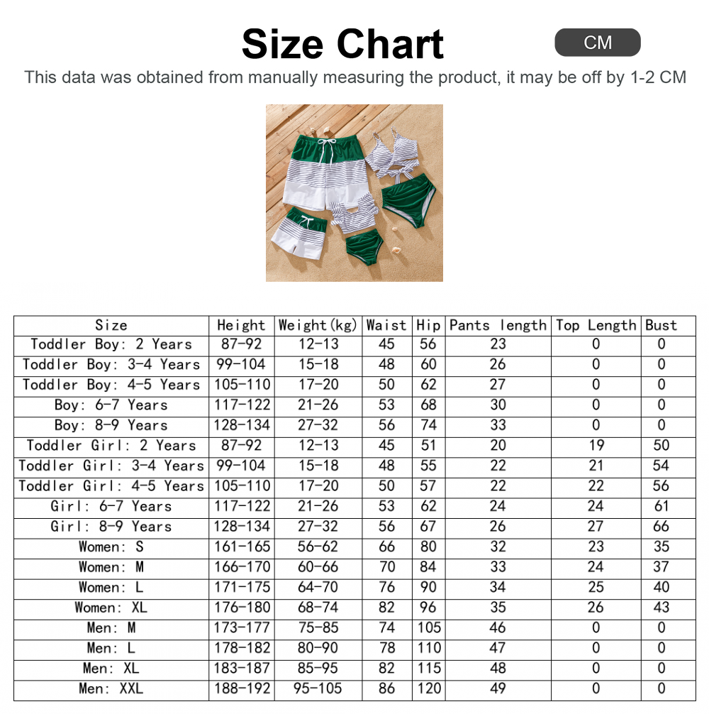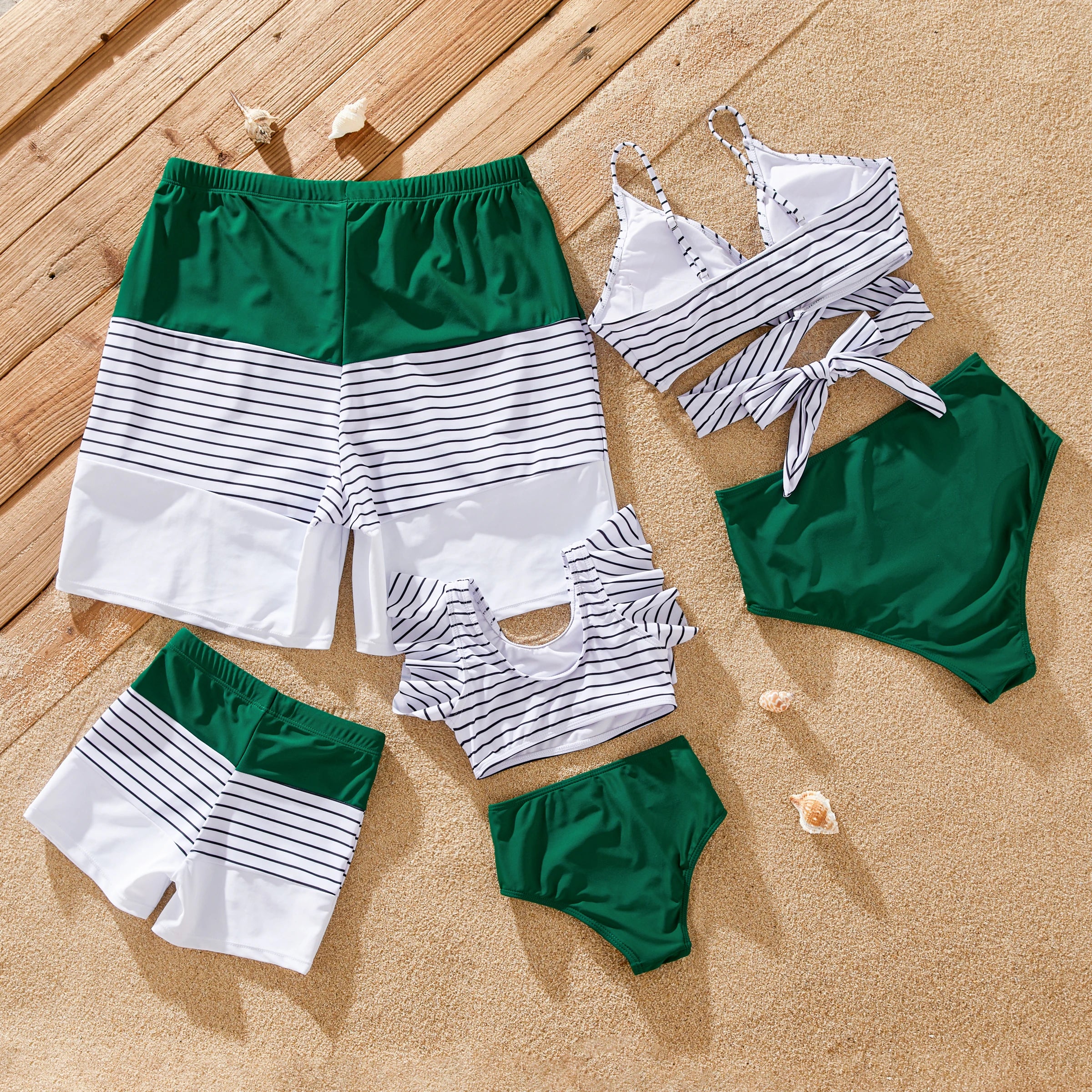 Perfect for Family Vacations: Pack your bags and head to the beach in style with our matching family swimsuits. Featuring vibrant green stripes and a coordinated design, they're sure to make a splash wherever you go.