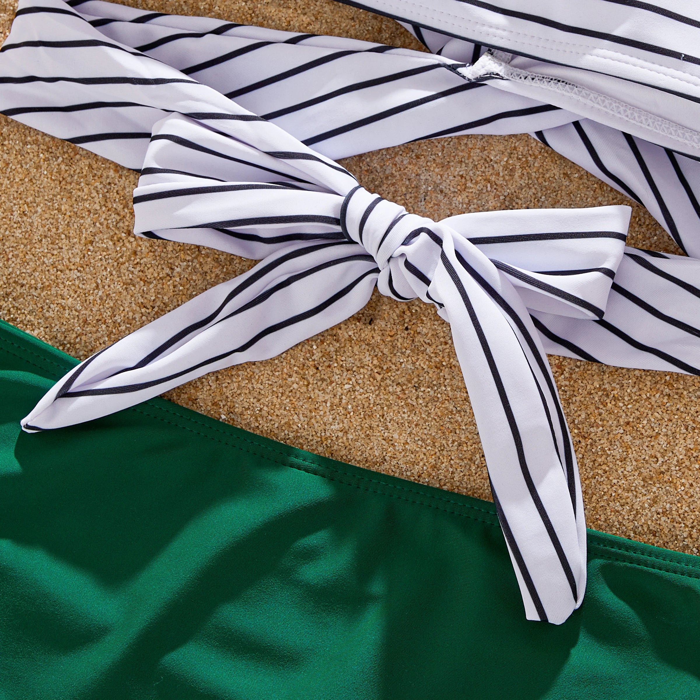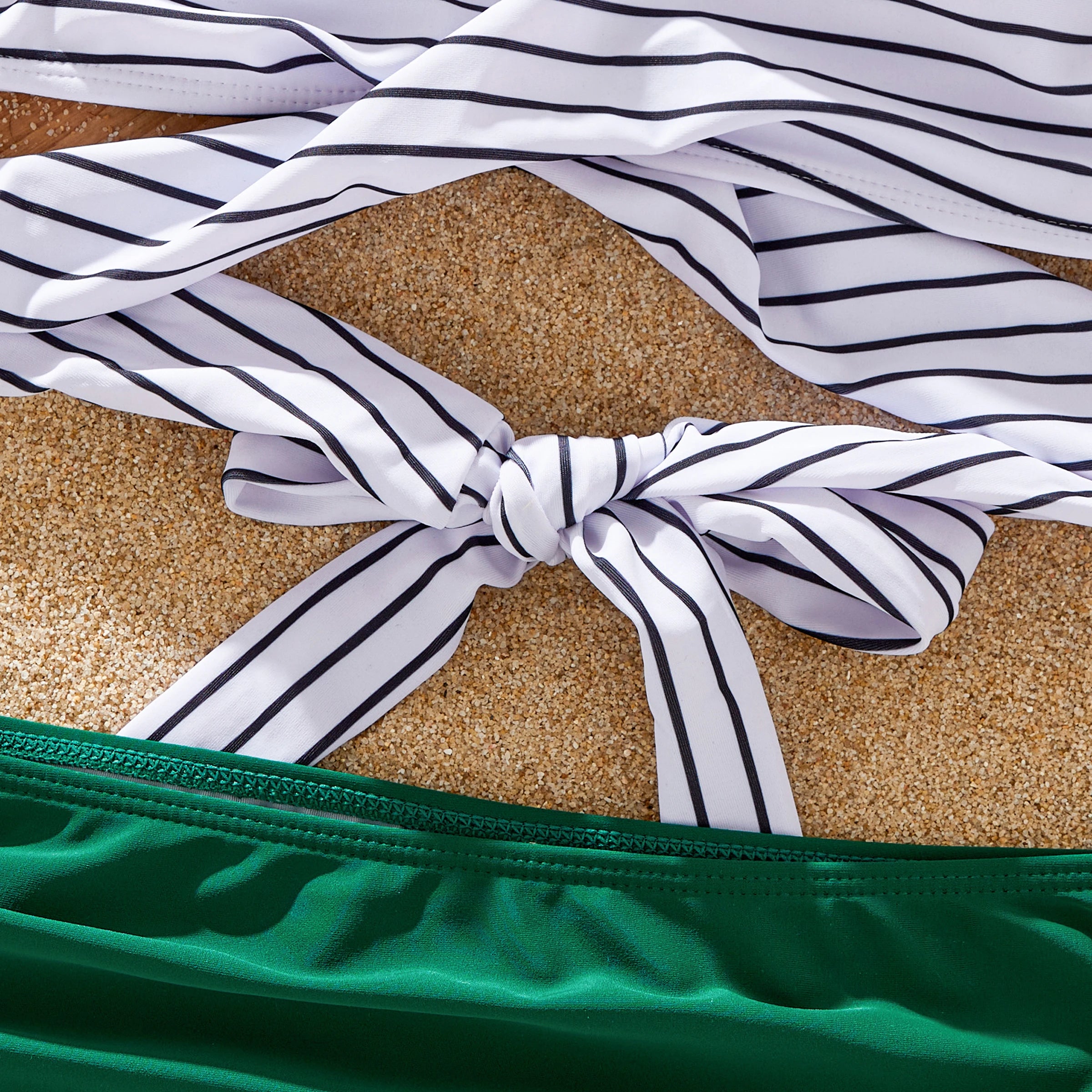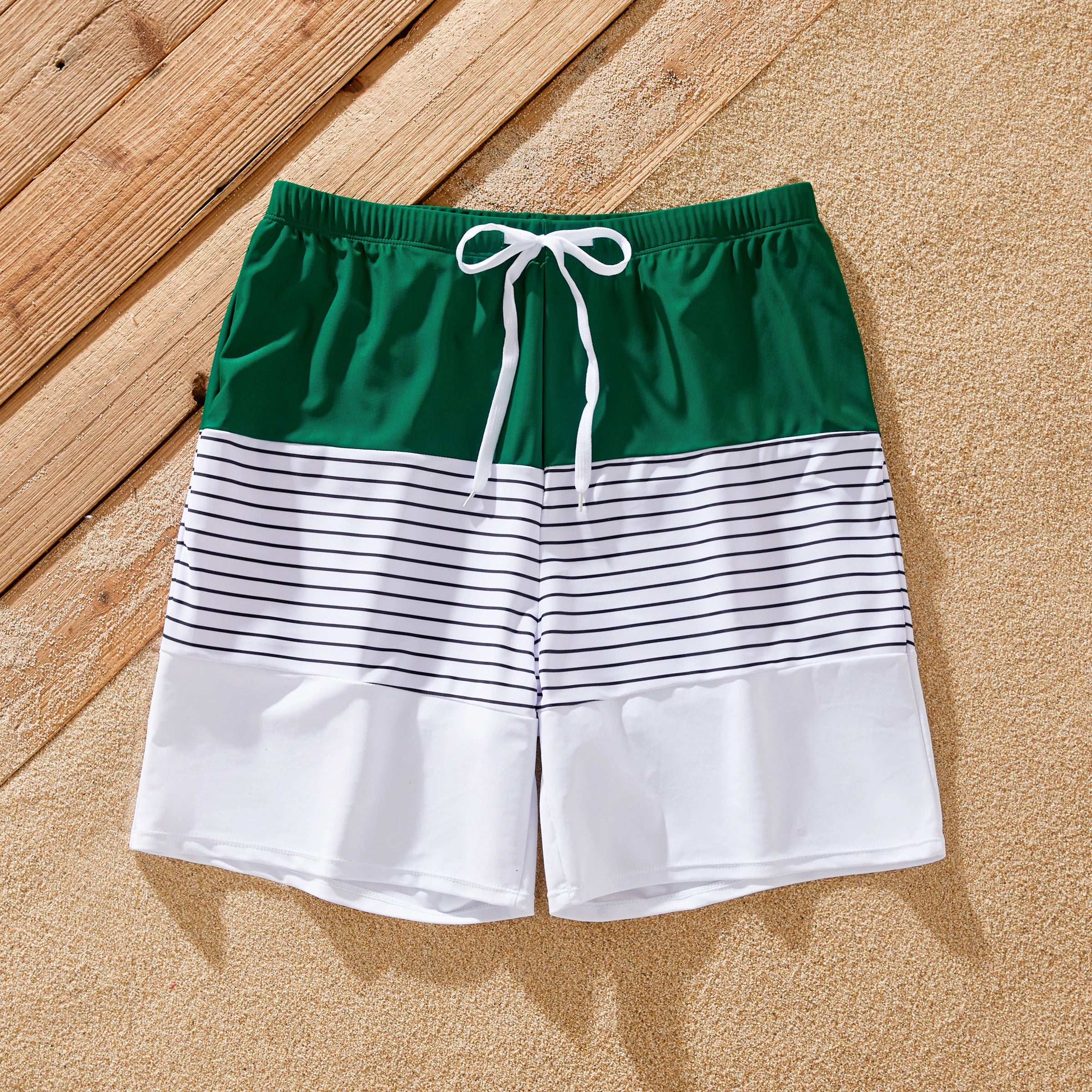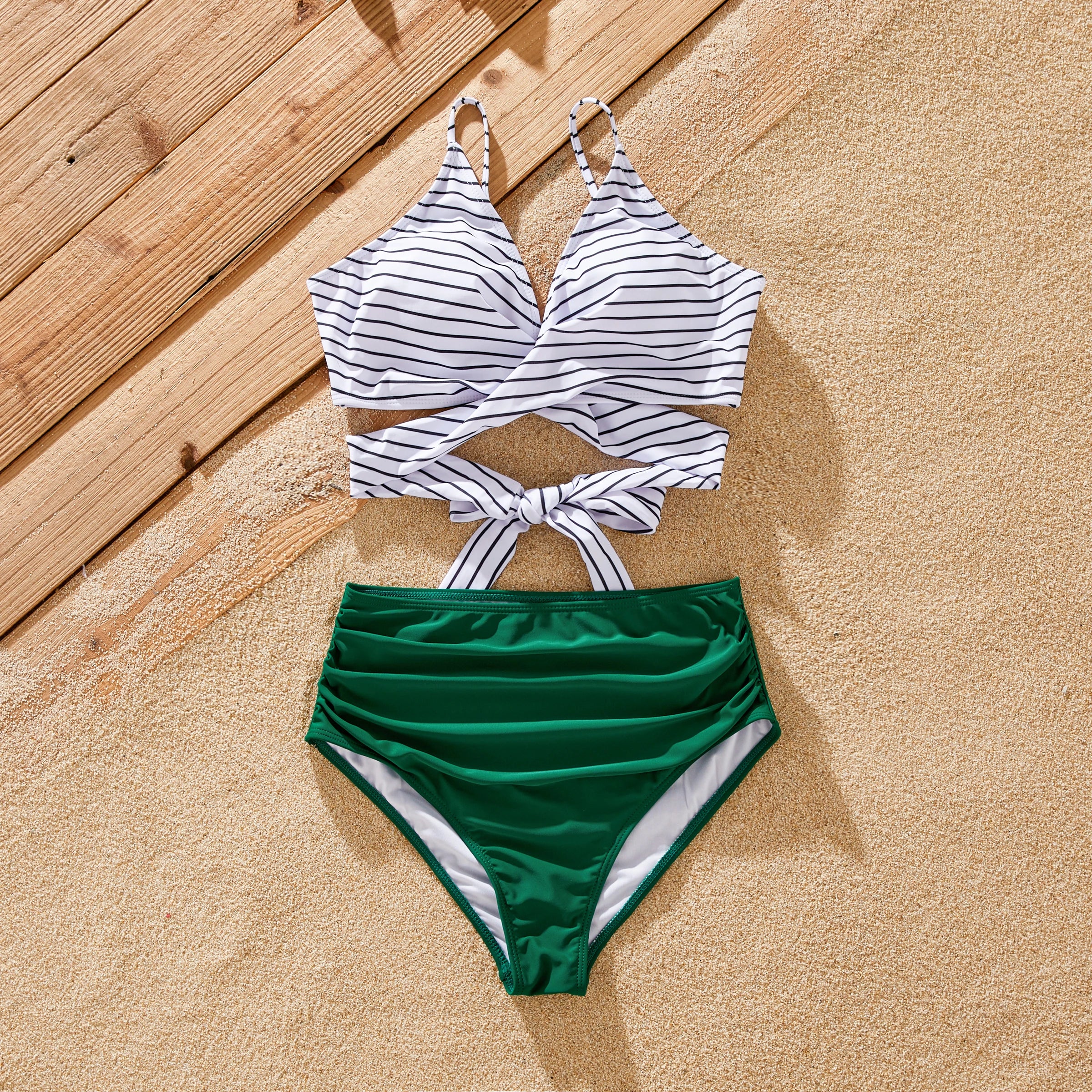 Perfect for Family Vacations: Pack your bags and head to the beach in style with our matching family swimsuits. Featuring vibrant green stripes and a coordinated design, they're sure to make a splash wherever you go.