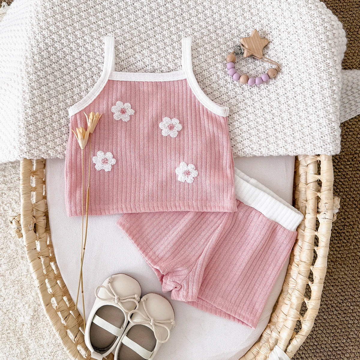 Let your baby girl bloom in style with this adorable 2-piece summer set. Featuring a lightweight ribbed camisole top with lovely embroidered flower patches and matching elastic-waist shorts, this outfit blends comfort with cuteness – perfect for everyday wear or outings in warm weather.