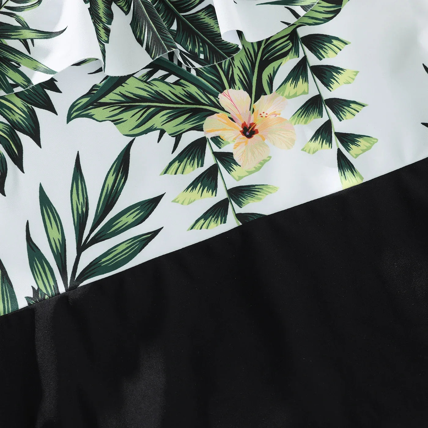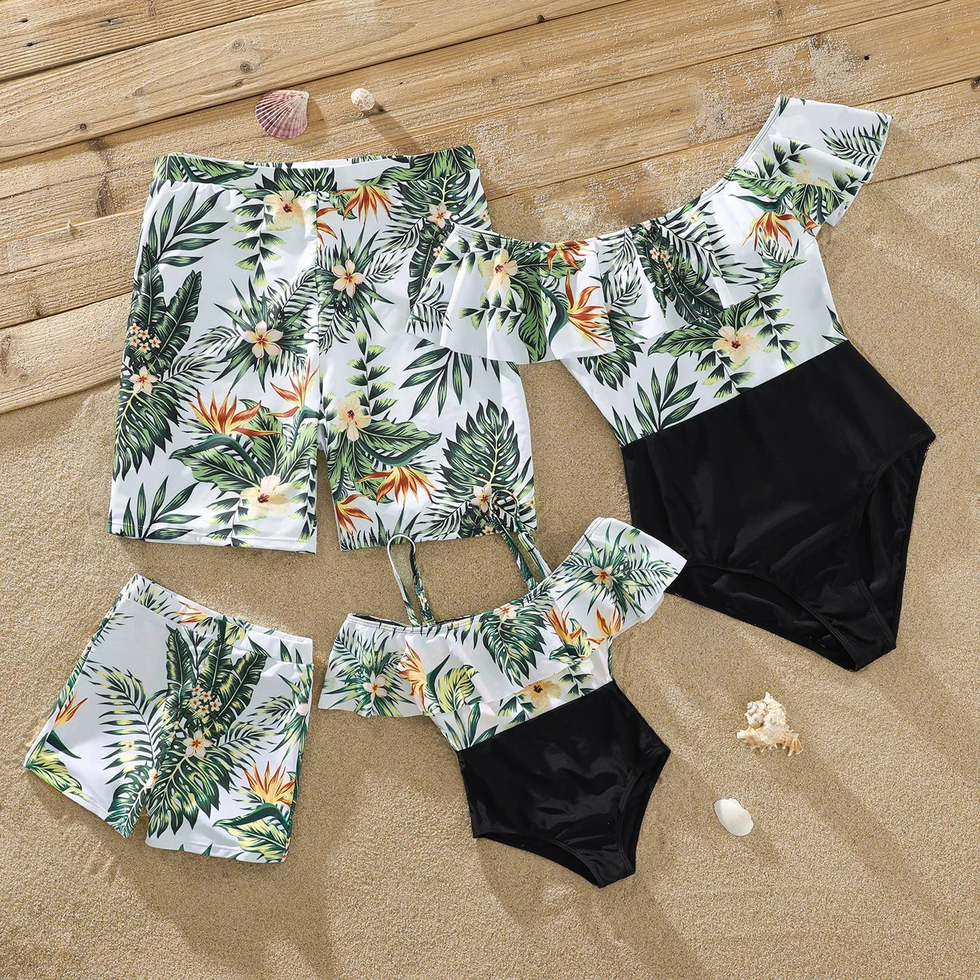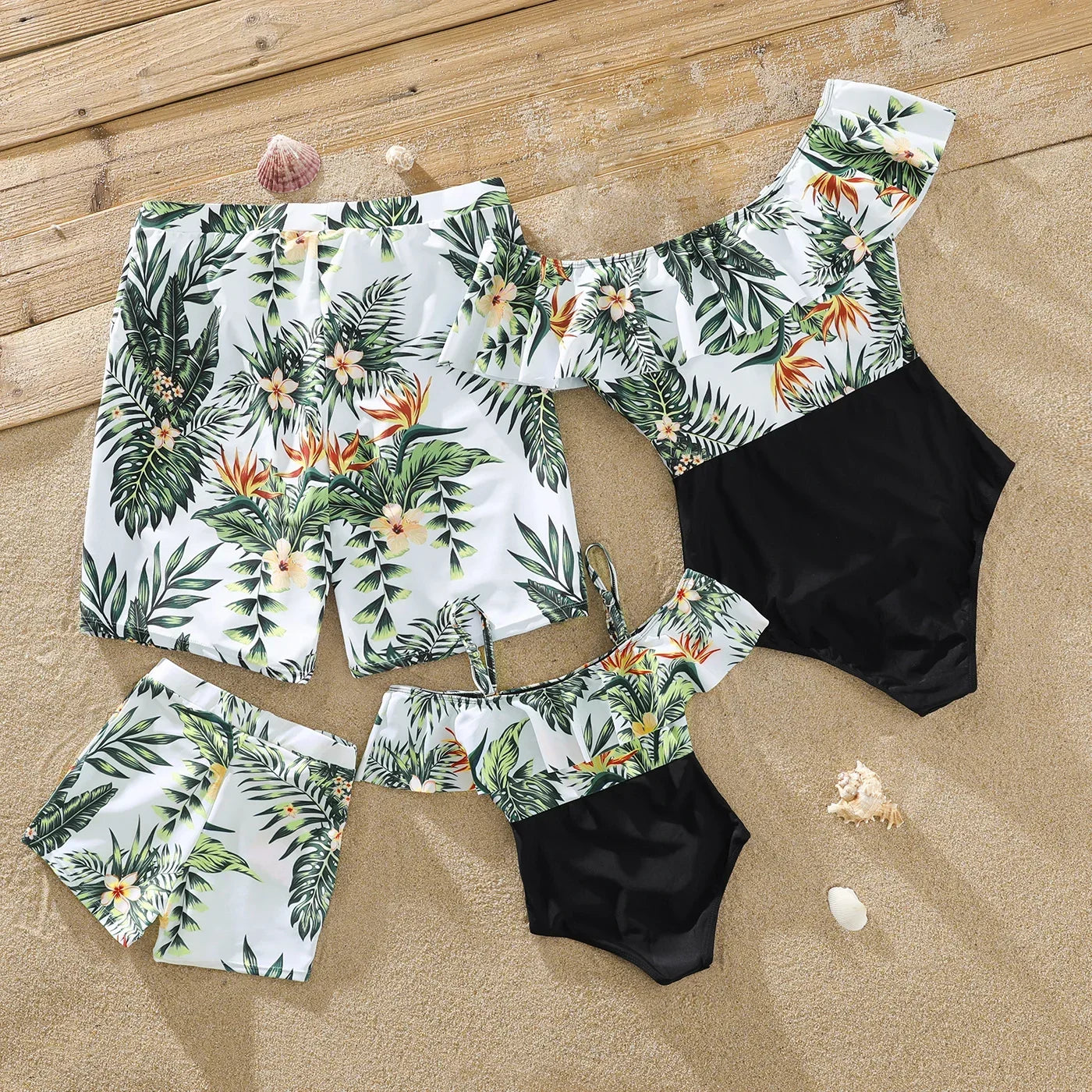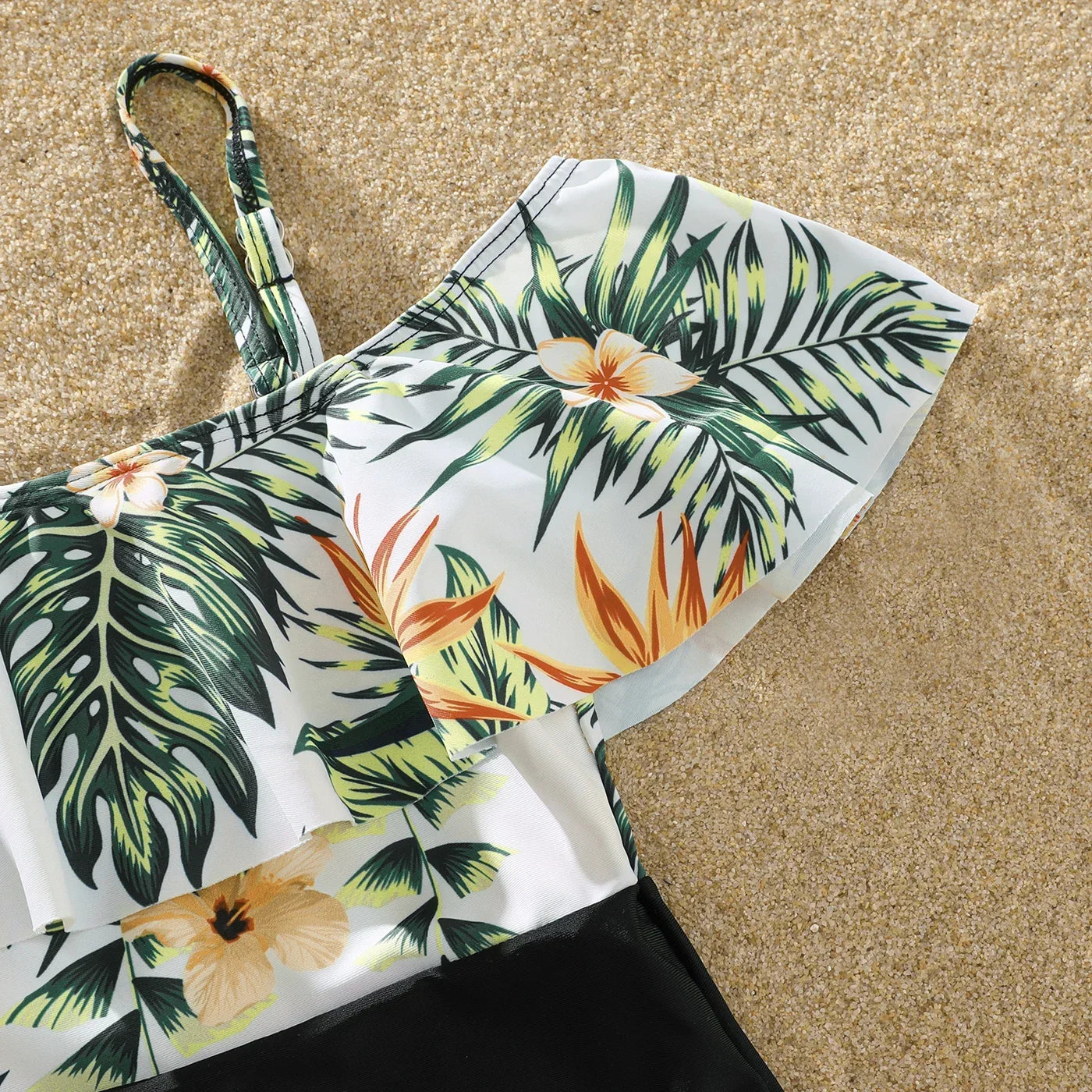 Dive into Trendy Gracefulness: This matching swimsuit set not only features a captivating plant print design but also adds a hint of gracefulness with the ruffle edge and stylish flair. Step into summer with a fashion-forward family statement!