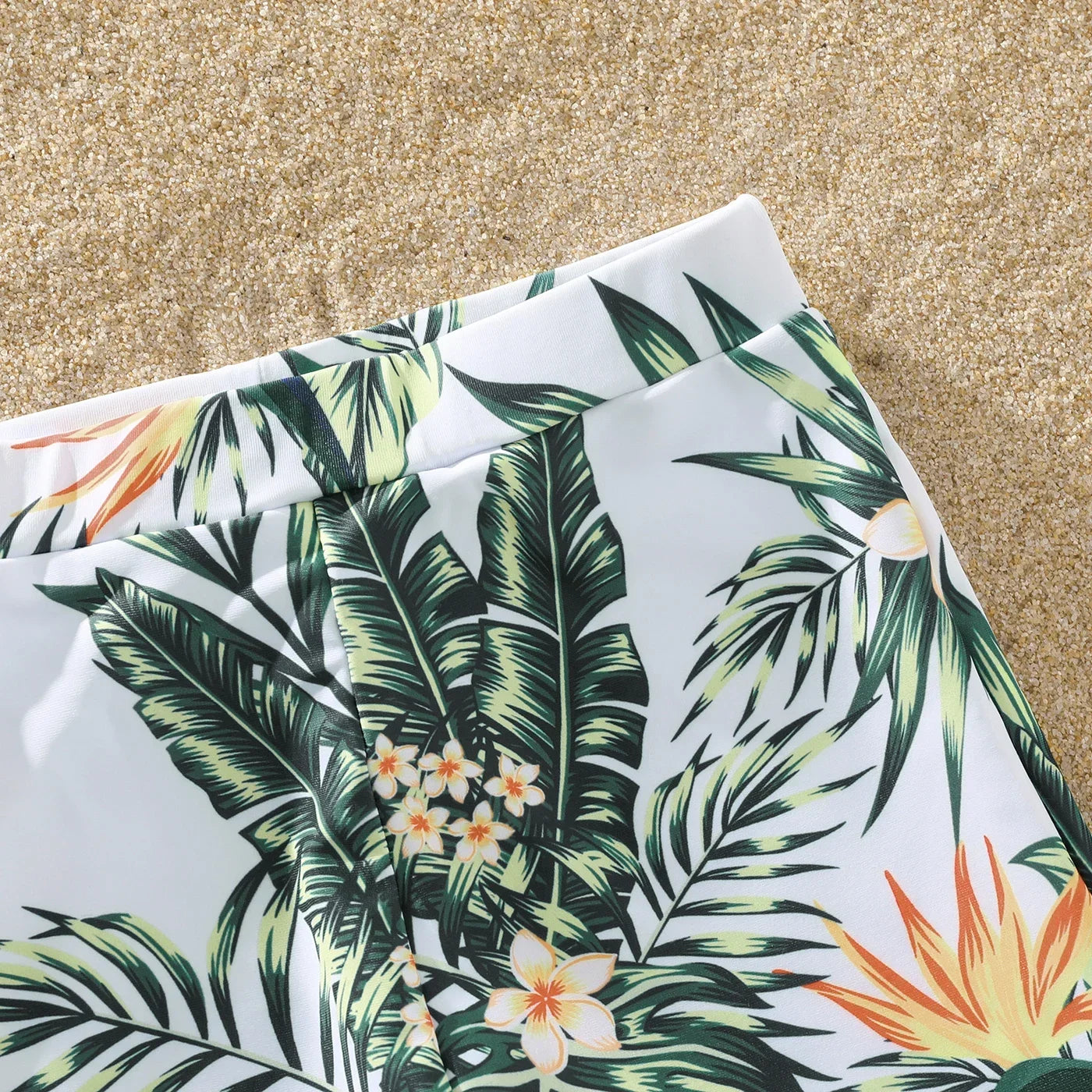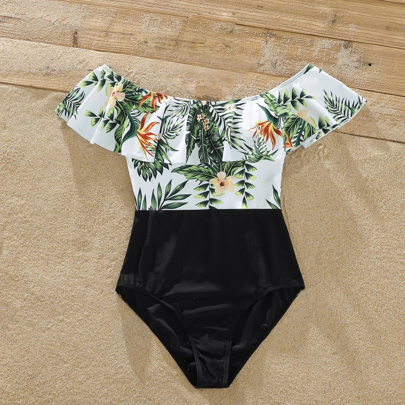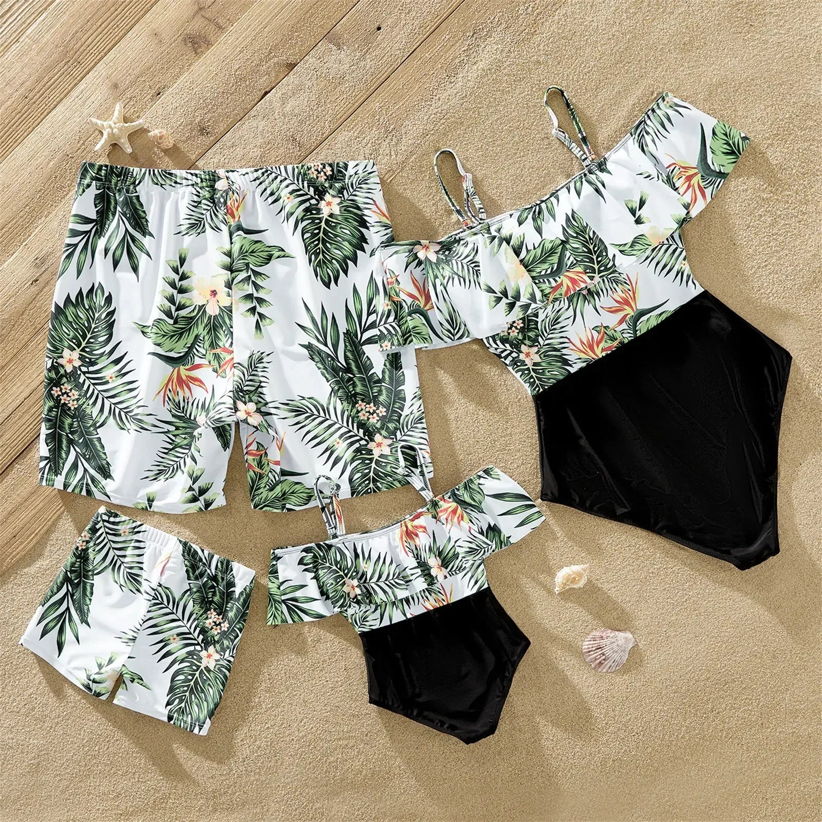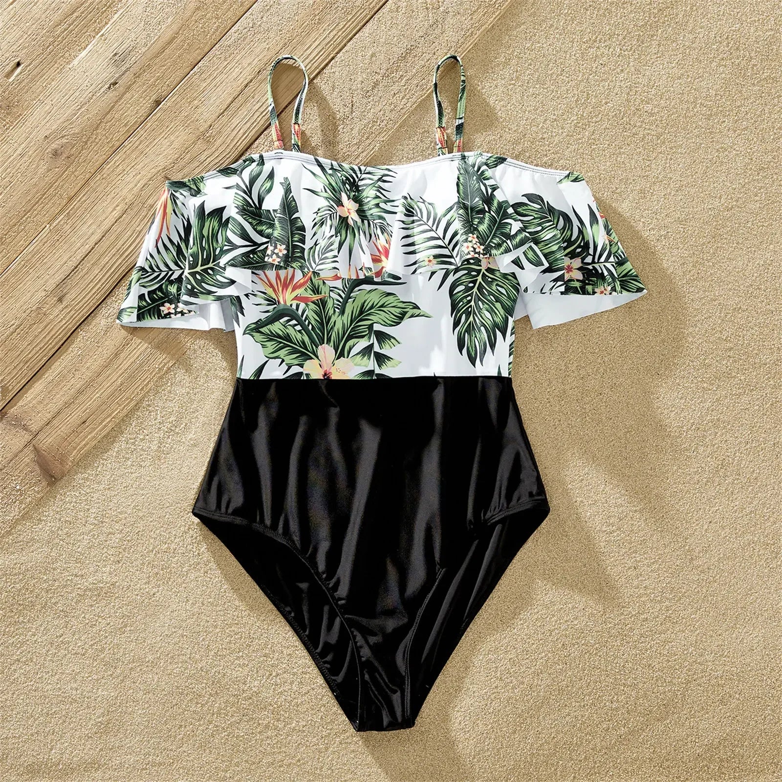 Dive into Trendy Gracefulness: This matching swimsuit set not only features a captivating plant print design but also adds a hint of gracefulness with the ruffle edge and stylish flair. Step into summer with a fashion-forward family statement!