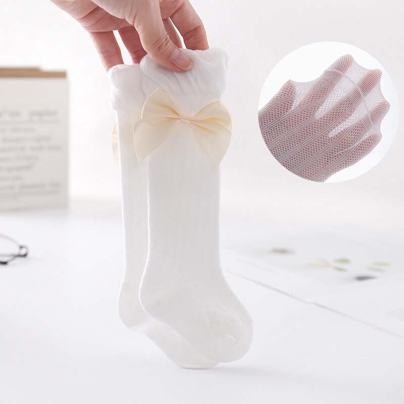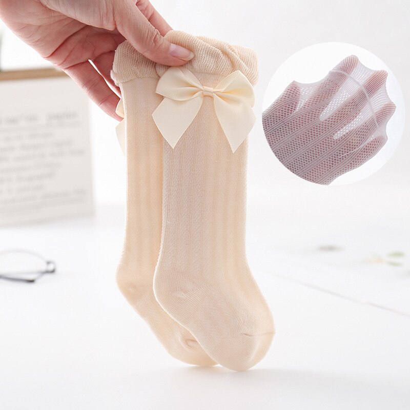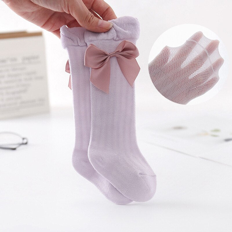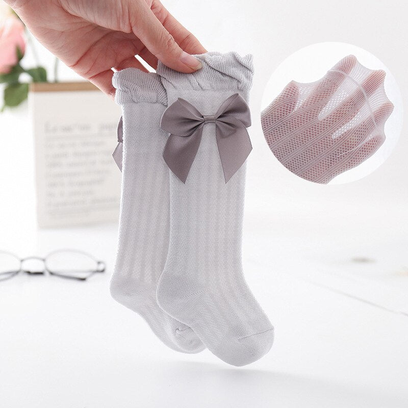 Kniehohe Netzstrümpfe für Kinder mit hochmodischem Schleifendesign. Ihr Baby sieht in Kombination mit einem Rock oder Shorts einfach süß aus.