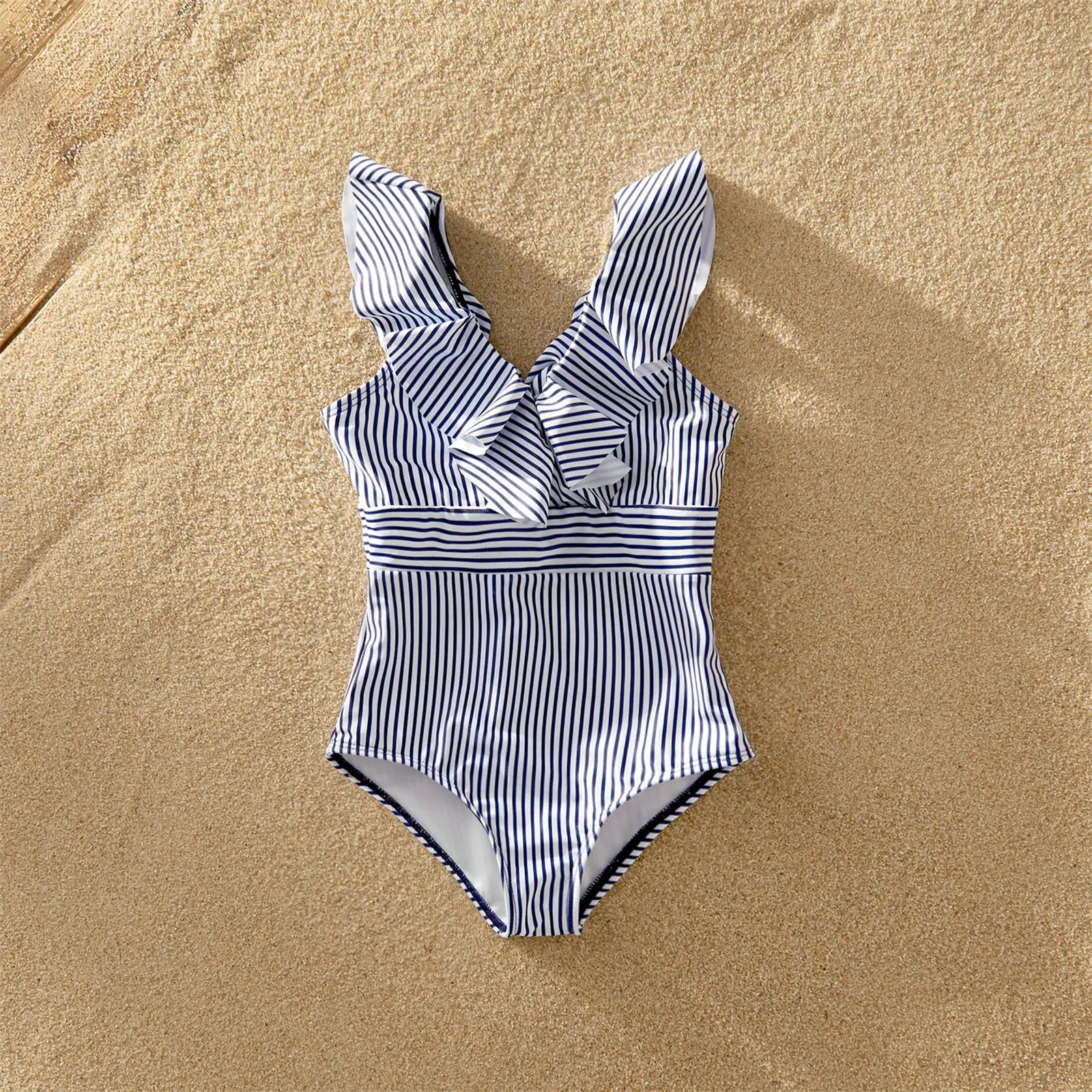 Machen Sie Ihre Familienausflüge am Strand noch unvergesslicher mit unseren passenden Familienbadeanzügen für den Sommer mit V-Ausschnitt, Volant und Streifenmuster! Diese Badeanzüge sind bequem und stilvoll und die perfekte Wahl für Ihr nächstes Sommerabenteuer.