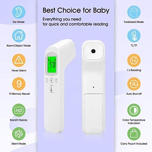 Greifen Sie zu unserem weißen automatischen elektronischen Thermometer. Es funktioniert, indem Sie das Ohr oder die Stirn mit einem Abstand von 1-3 Zentimetern berühren oder direkt auflegen. Das Set enthält Batterien, die je nach Nutzung mehrere Monate halten.