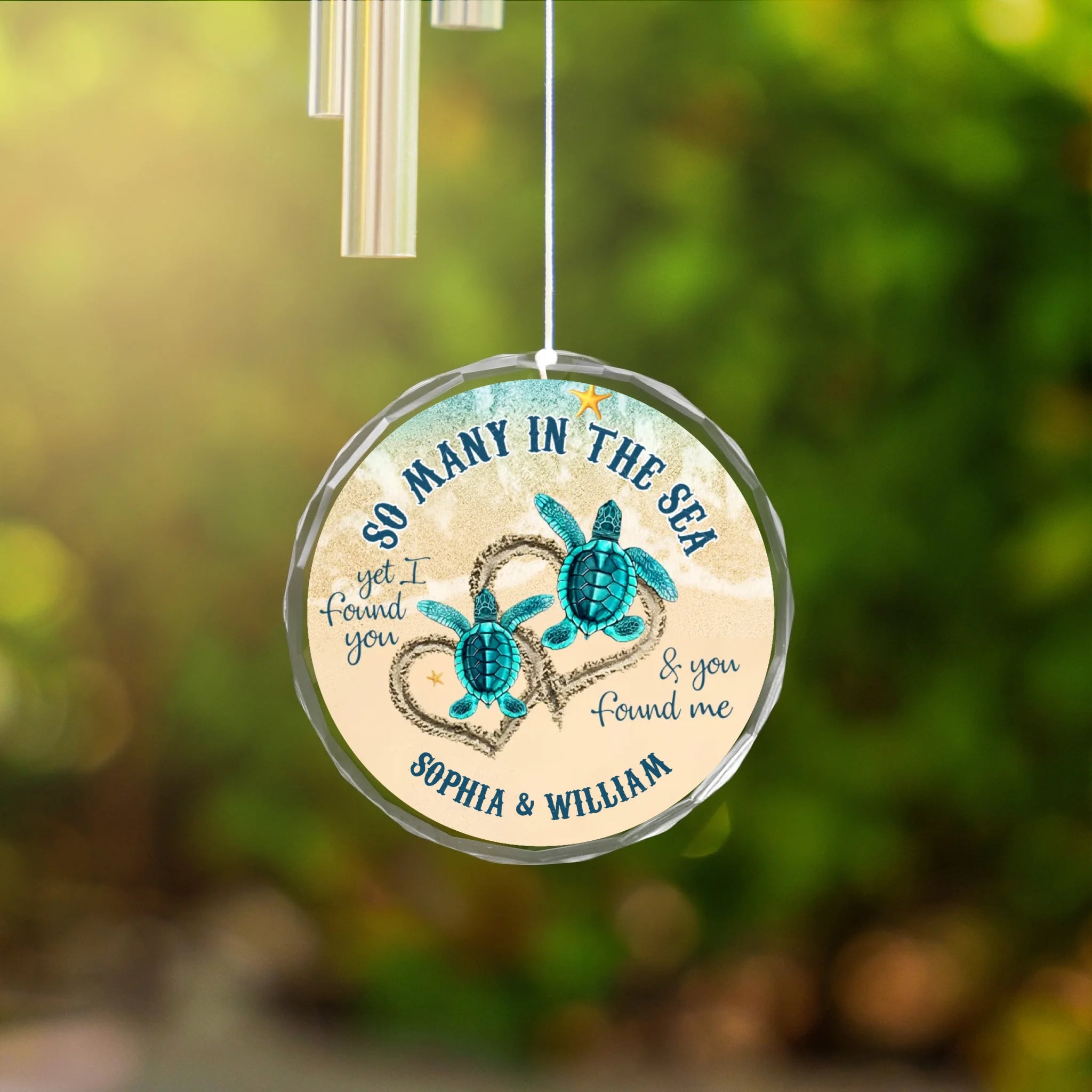 Feiern Sie Liebe, Schicksal und Zusammengehörigkeit mit unserem Personalisierte Schildkrötenpaar-Windspiele mit Glasornament. Inspiriert von dem sanften Rhythmus des Ozeans und der lebenslangen Bindung, die durch Meeresschildkröten symbolisiert wird, ist dieses personalisierte Windspiel mehr als nur eine Dekoration – es ist ein bedeutungsvolles Andenken, das eine Liebesgeschichte erzählt.