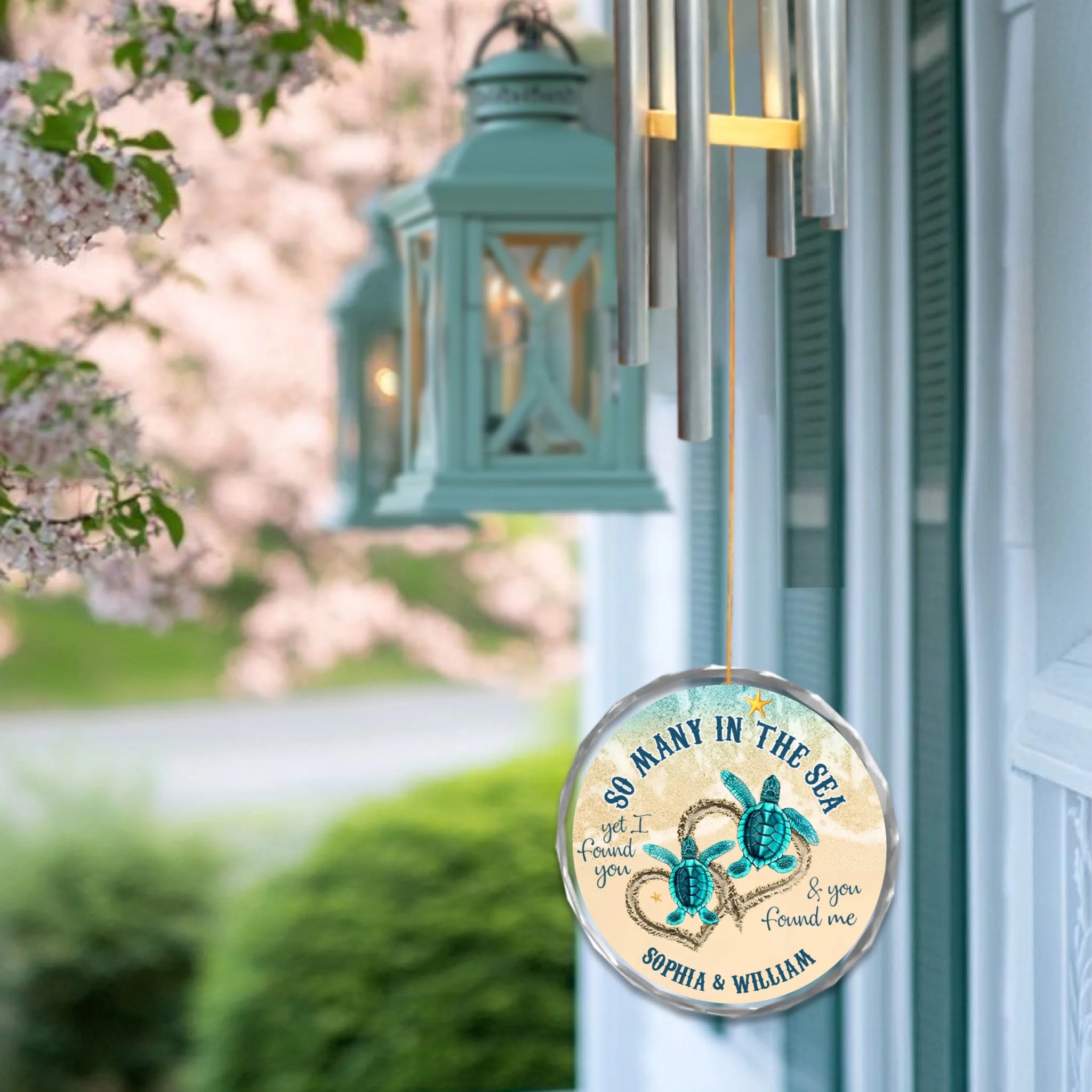 Personalisiert mit den Namen des Paares, kombiniert dieses elegante Windspiel beruhigende Klänge, küstennahe Schönheit und herzliche Emotionen. Ob im Garten, am Fenster oder auf der Veranda platziert, es bringt Frieden, Wärme und eine Erinnerung daran, dass aus so vielen Seelen im Meer zwei Herzen sich gefunden haben.