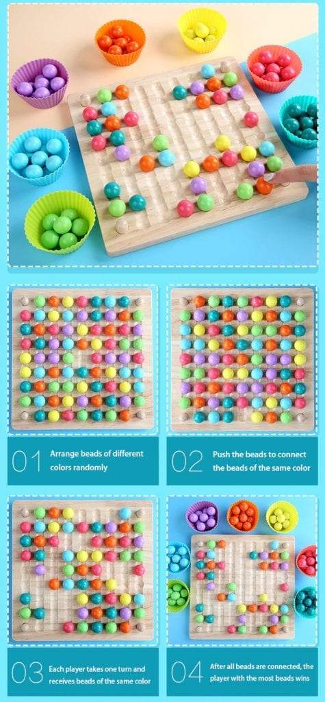 Man muss sich auf eine bestimmte Weise bewegen, um sicherzustellen, dass 2, 3 oder 4 Punkte in einer Reihe sein können (Die Regel kann selbst festgelegt werden). Dieses Holzspielzeug für frühes Lernen ist ideal, um Ihrem Kind einen frühen Start in die STEM-Entwicklung zu ermöglichen. Es ist auch ein perfektes Reisespielzeug und ein ideales Lernspielzeug.