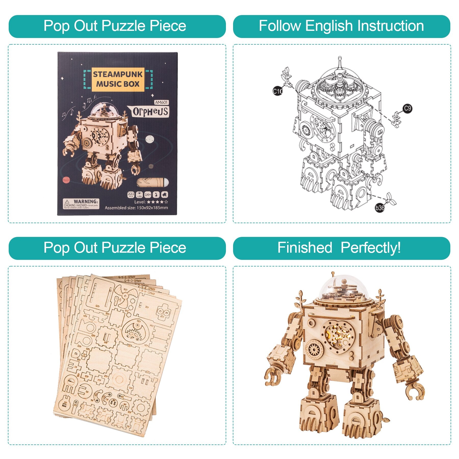 Dieses DIY Steampunk Musikbox 3D-Holzpuzzle ist super cool und einzigartig. Dieses Modell besteht aus natürlichen Materialien. Baue diese Musikbox selbst zusammen und spüre die Romantik der Mechanik.