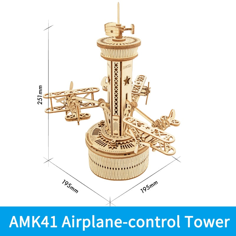 Die Spieluhr „Flugzeug-Kontrollturm“ ist ein mechanisches 3D-Holzpuzzle. Anders als herkömmliche Spieluhren kombiniert diese einen Kontrollturm mit drei drehbaren Doppeldeckern, inspiriert von der Flugzeugführung in einem Vergnügungspark.